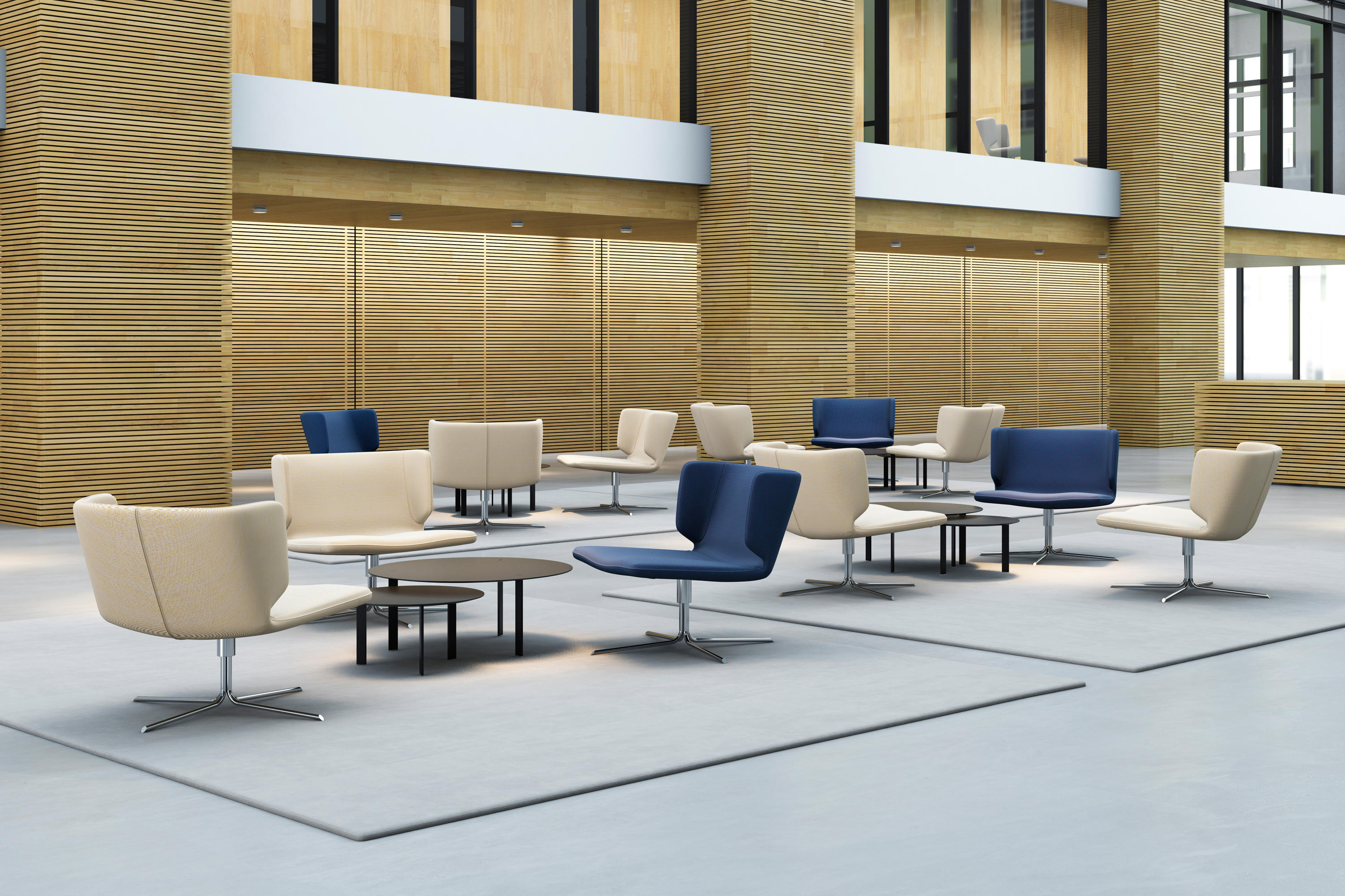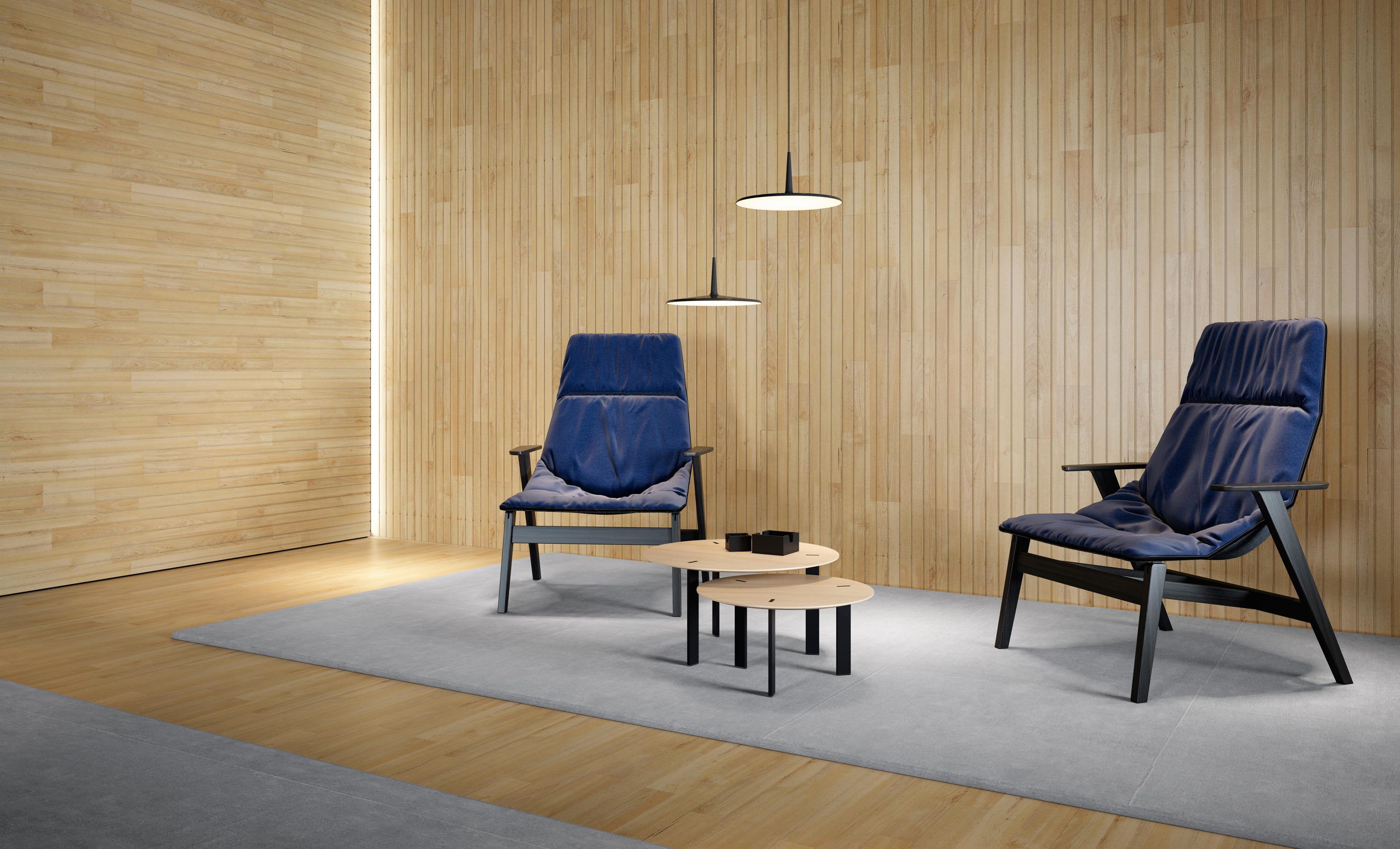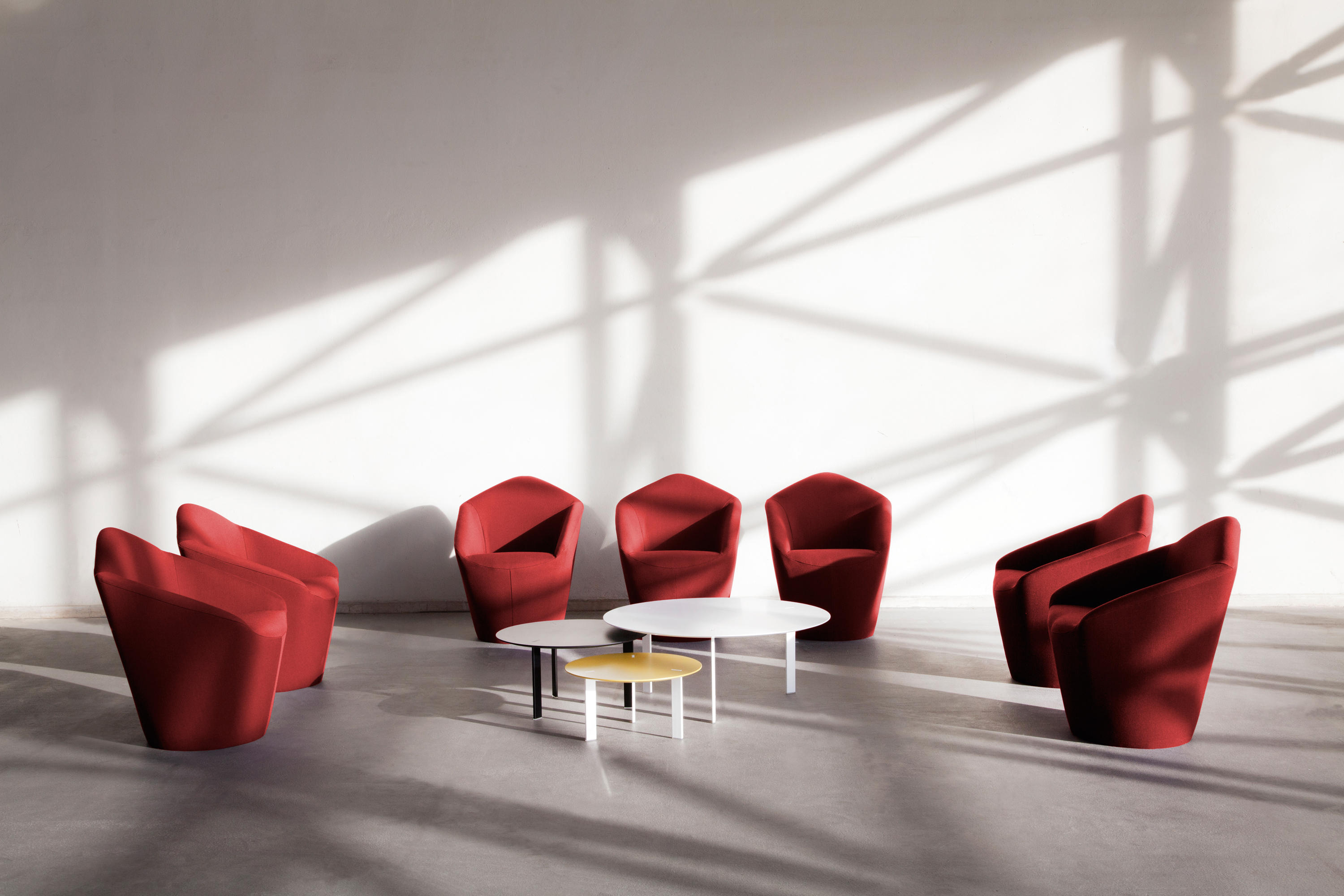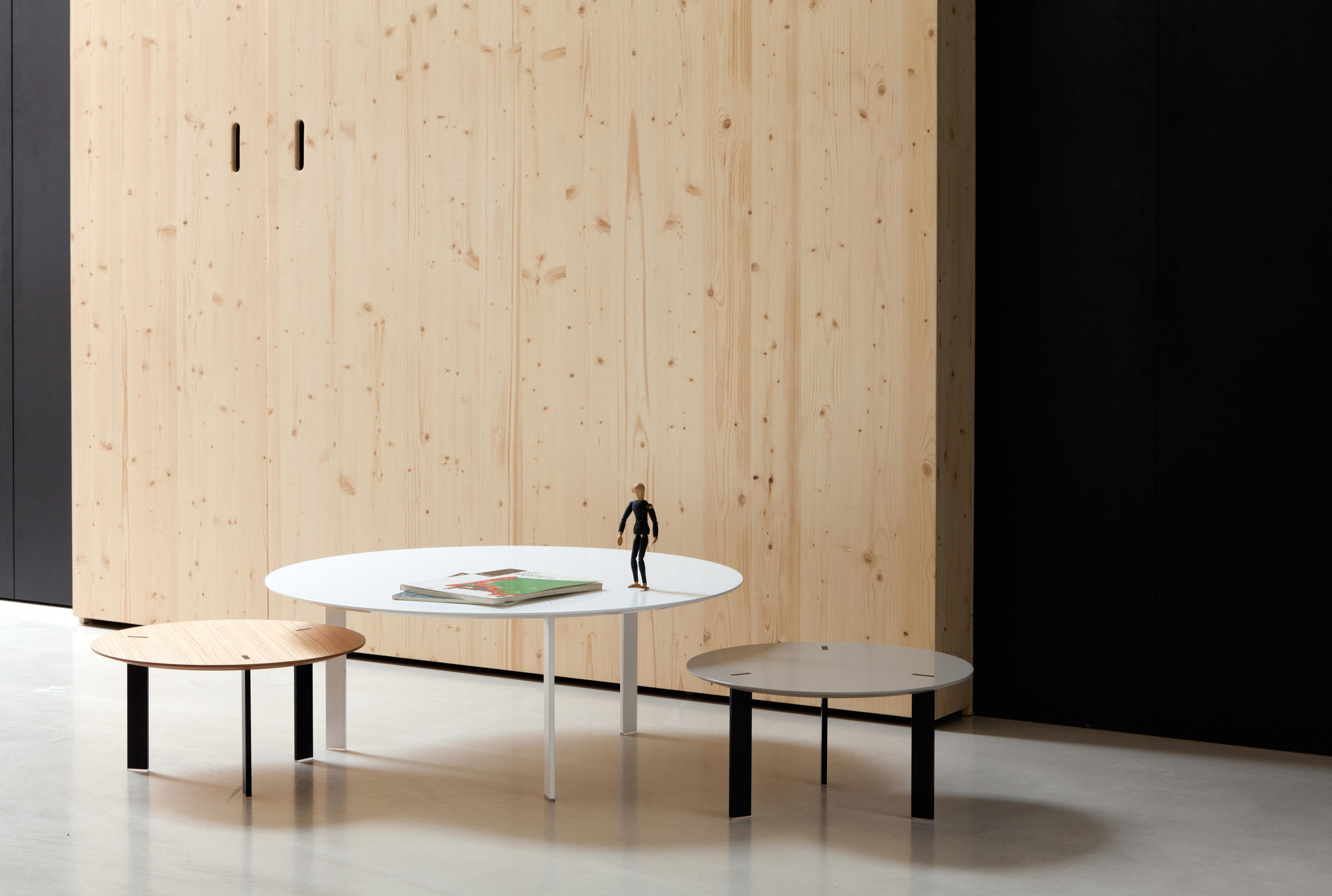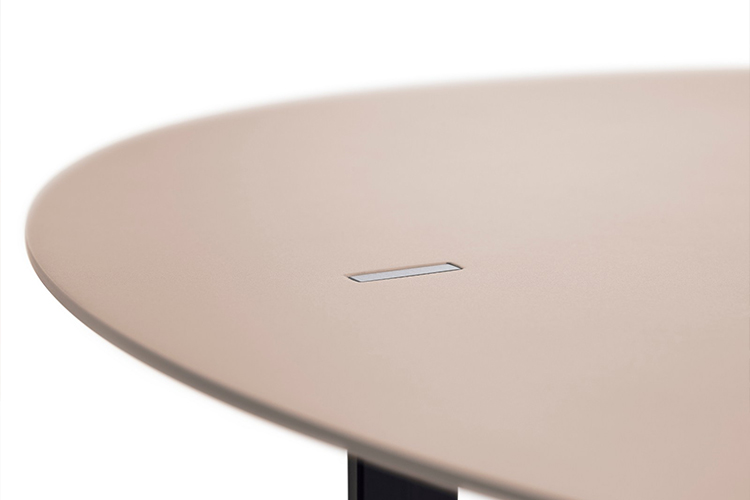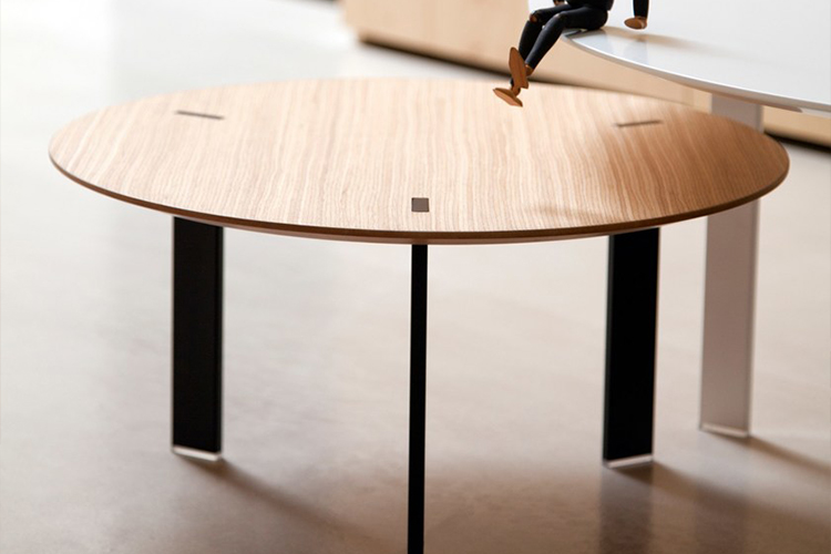 桌面采用漆面MDF或橡木贴面,由Viccarbe提供的饰面和带透明尖端的漆钢腿。