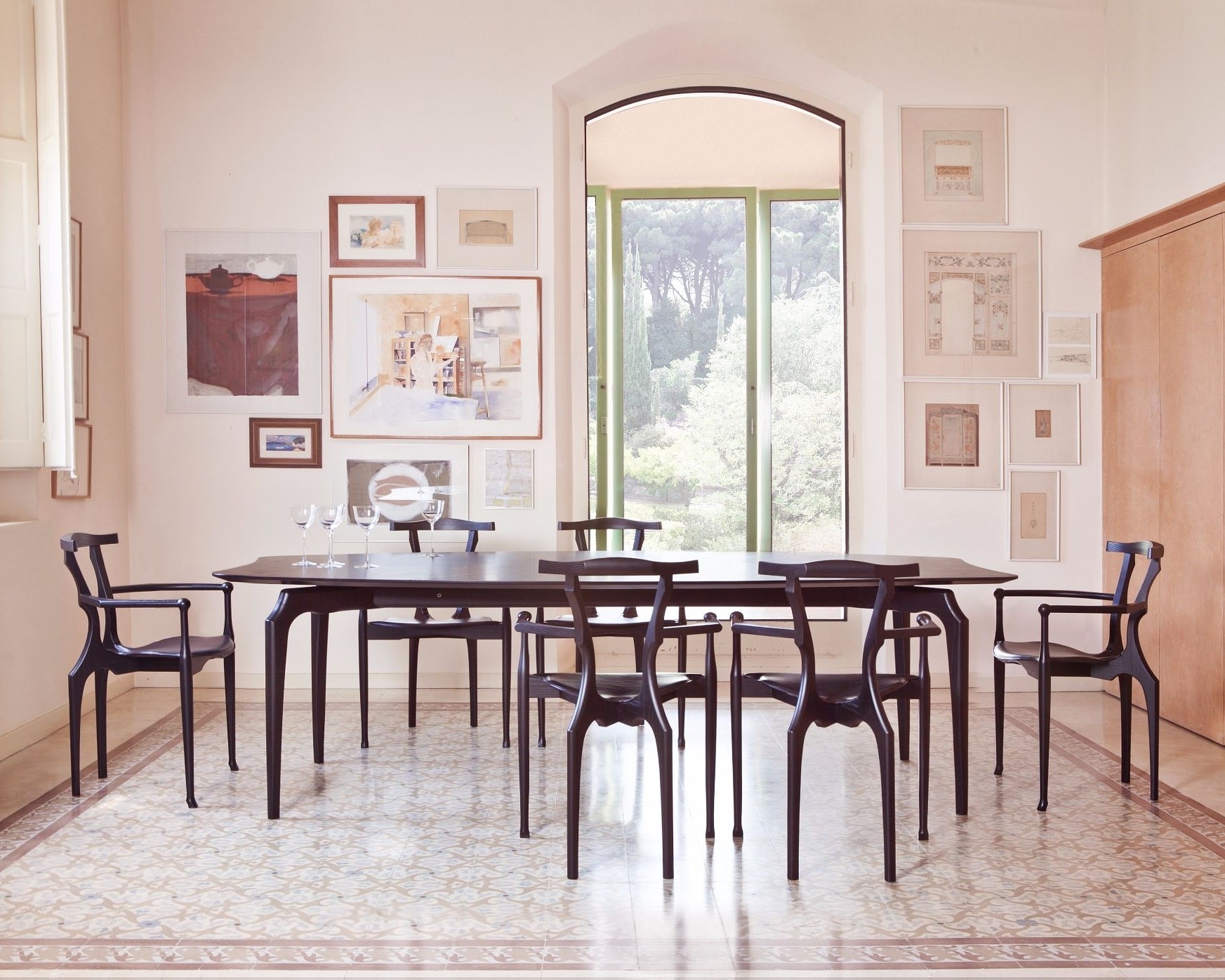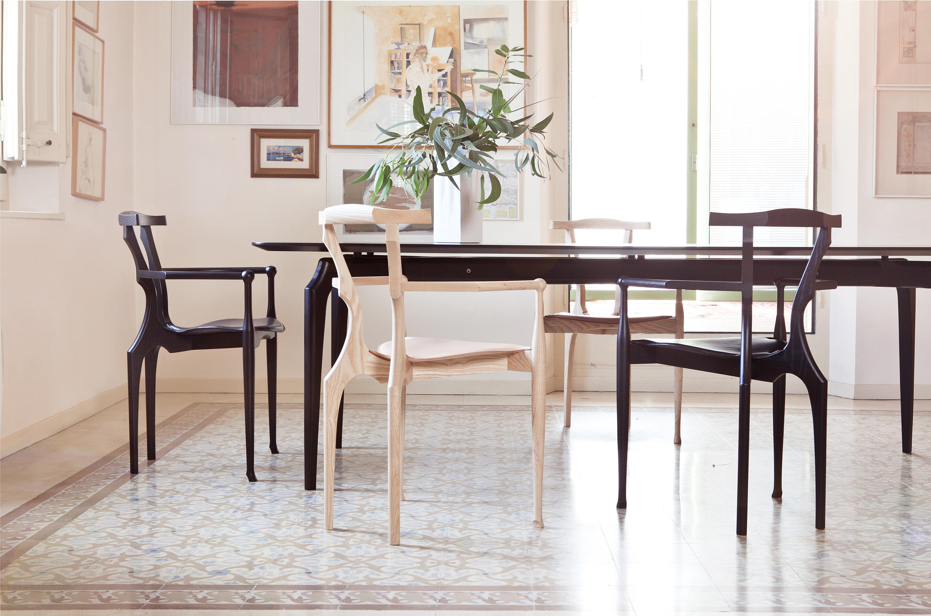 Gaulino桌子 的结构为实心白蜡木。MDF顶部为天然白蜡木贴面。可用表面处理:天然或有色橡木或黑色清漆。边缘和顶部下部始终为黑色。
