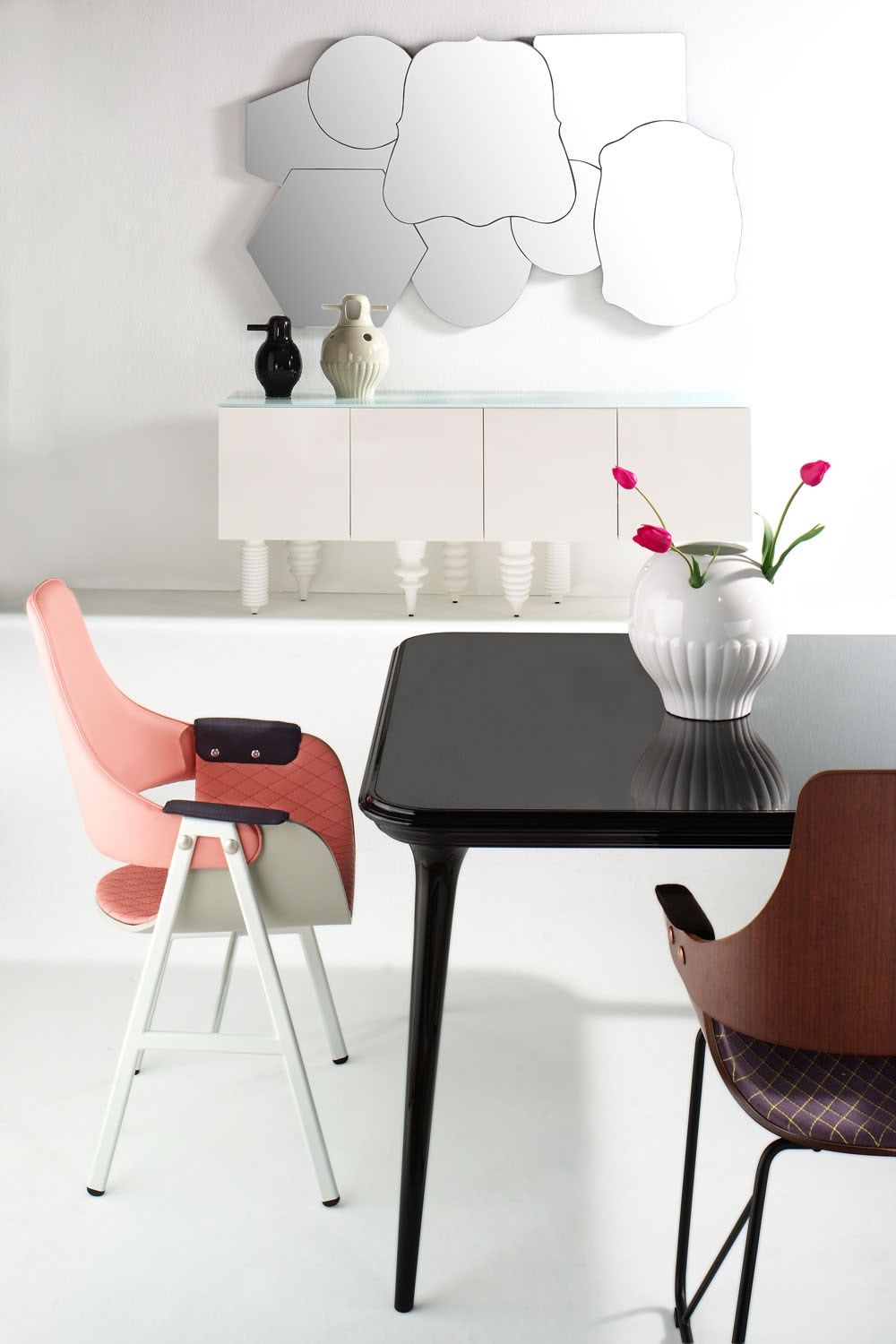 八个镜面的组装在一起,形状和样式互不相同。它们可以安装在一起或分开安装。后部为哑光黑色漆面漆。每个单元的独立固定硬件为镀锌白钢板。有些型号可能需要单独提供。Jaime Hayon是西班牙新设计中最迷人的人物。他具有活力,才华和自己的风格,这些都被融入到Showtime中。他曾为西班牙最负盛名的西班牙设计公司Bd Barcelona设计而设计的系列。年轻设计师与资深生产商之间的这种快乐相遇导致了家具系列的诞生,该系列既适合家庭使用,又具有适应性和个性家具装饰,塑料漆面和微妙的陶瓷传统相得益彰。在古典与现代之间的这些对比中,Showtime反映了Bd一直以来的精髓。