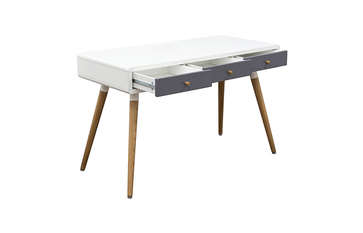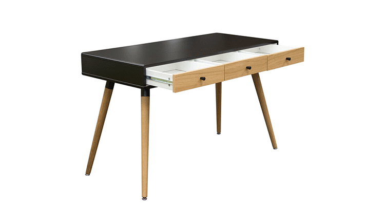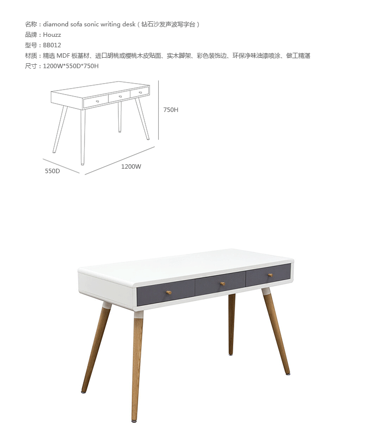 diamond sofa sonic writing desk(钻石沙发声波写字台)本世纪中叶复古声波3抽屉桌,为你家居的装修提供了时尚工作空间。起有着黑色橱柜和橡木抽屉前挡板,酷音效果时尚突出了固体橡树喇叭的腿设计,适用于家庭和工作办公。制作采用精选MDF板基材、进口胡桃或樱桃木皮贴面、实木脚架、彩色装饰边、环保净味油漆喷涂、做工精湛。