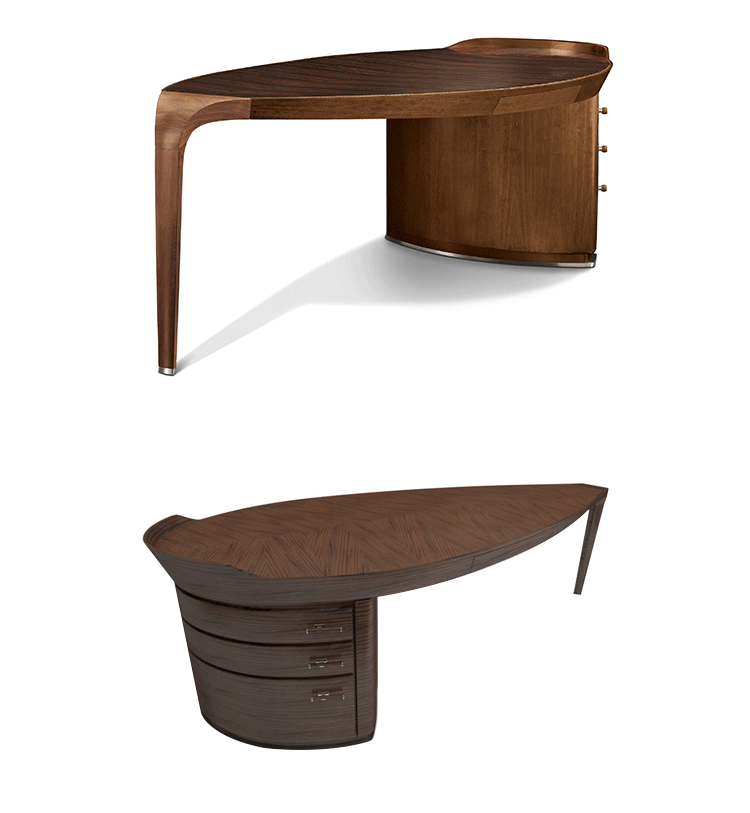 大班台框架,顶部和固体的五斗橱 国家胡桃木单板,可在自然完成,烟草的颜色 完成和黑胡桃木。 腿之间的连接 和腿都在核桃卡纳莱托木与自然完成。