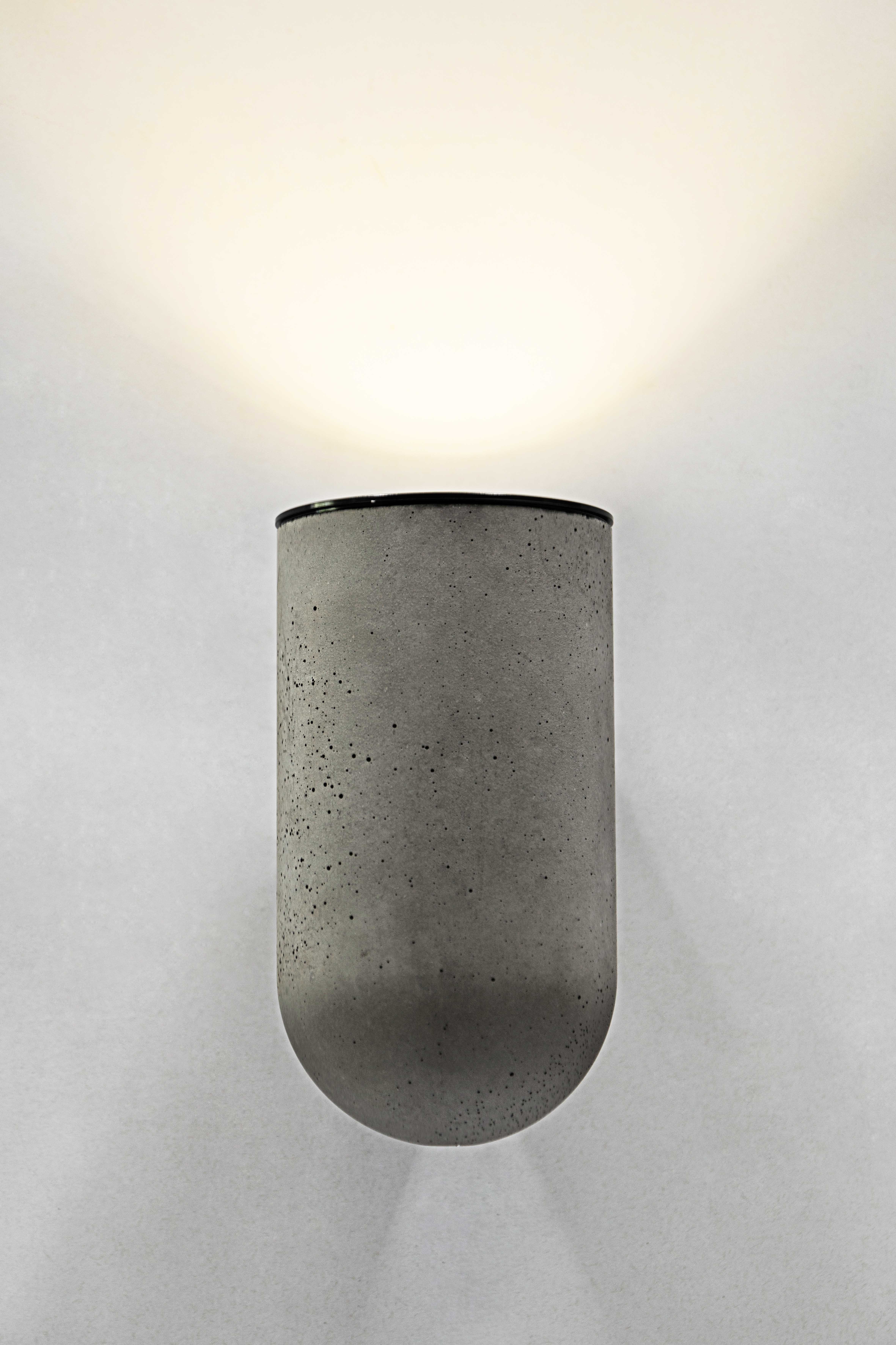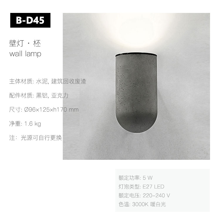 “柸”曾获2014年度中国制造之美大奖,从理念到材料,从配件到功耗,我们尽可能极致。 扯一团光,塞进杯里,安在墙上。 杯间溢彩,杯底流光,用柸中一团光,点亮一扇墙的沉闷。 日常在细微处美着,设计师用敏锐的洞察力,赋予它混凝土的工业气息。 一体出模造就了柸的细腻肌理,水泥特有的孔洞质感使它平添一股自然美感。金属色块稳稳地衔接着杯状水泥灯身与墙面。