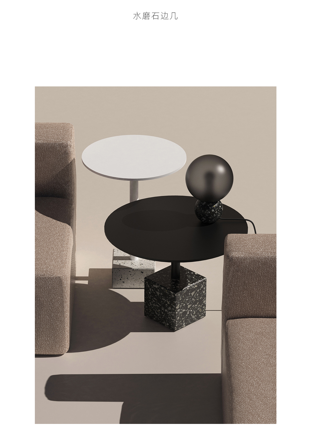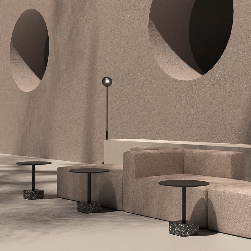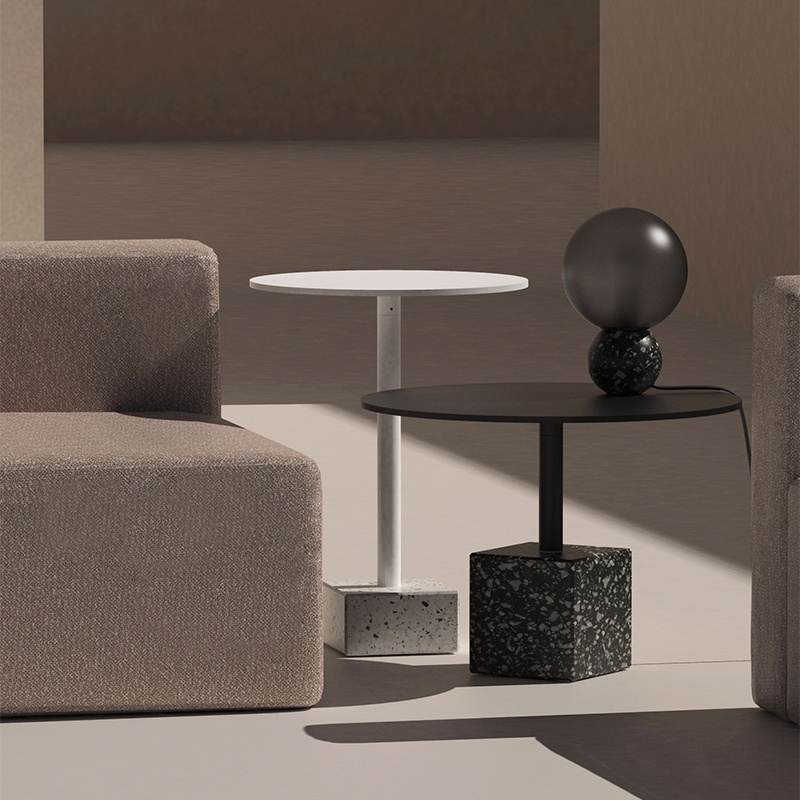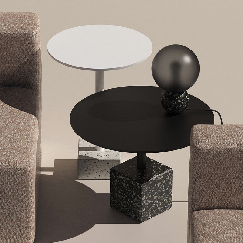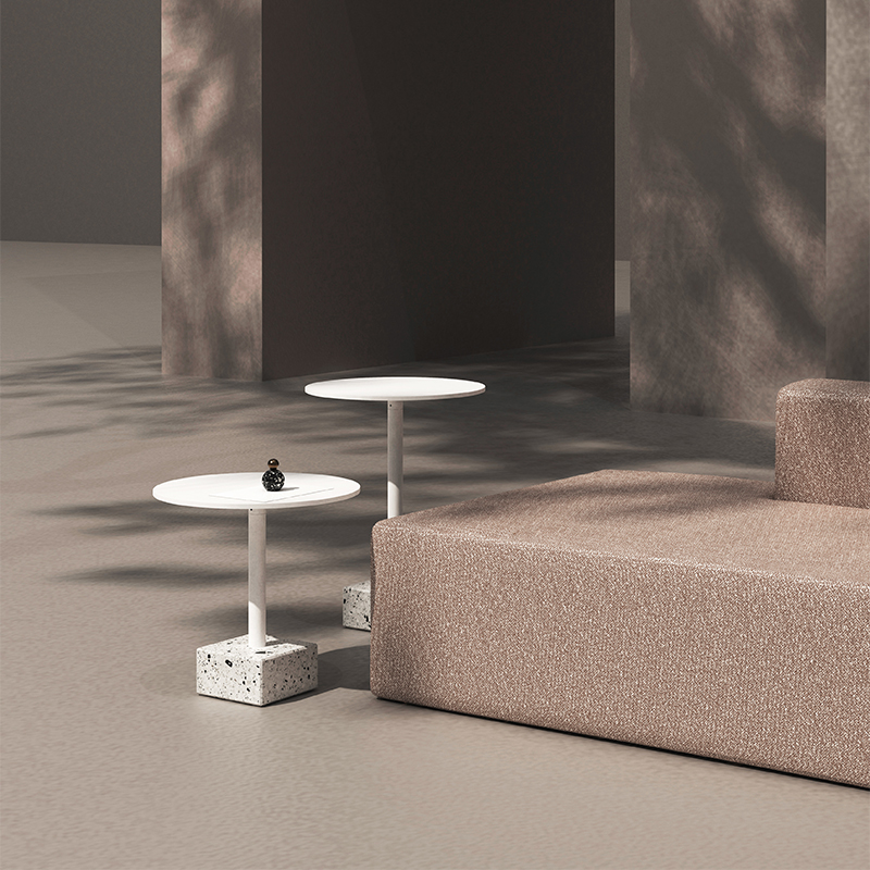 水磨石边几 全铝金属桌面不生锈,耐候粉末喷涂抗紫外线耐候不变色,致密表面防油污,室内户外通用。 全铝精密加工,部件均可拆卸,减少包装体积,降低运输成本。 回收石材边角料,与混凝土混合后打磨,形成经典的水磨石质感,呈现透气自然的机理,是旧时光的记忆。 简约黑白的经典搭配,致密的材料应用,便于清洁维护,适应户外、室内各类风格的公共区域。