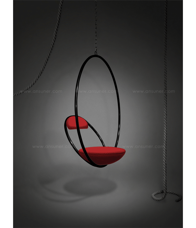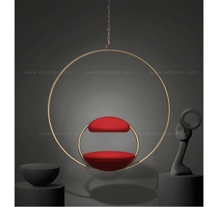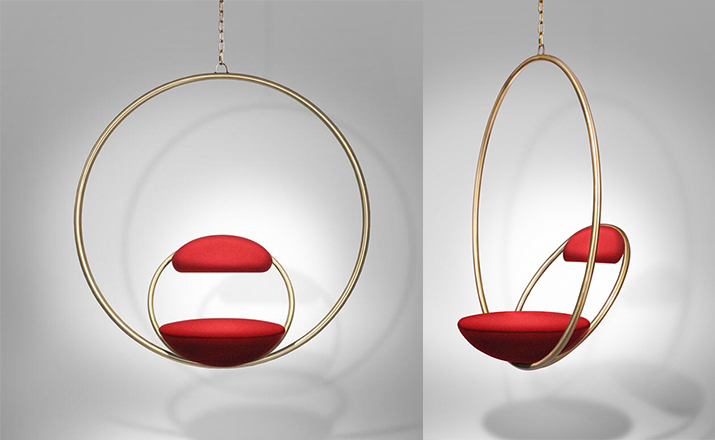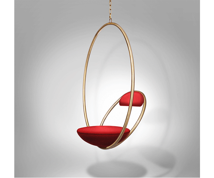 "Suspended from above,two brass plated steel circular hoops join to create the Hanging Hoop Chair,with a seat and backrest upholstered in Kvadrat wool.Also available in a satin black finish."