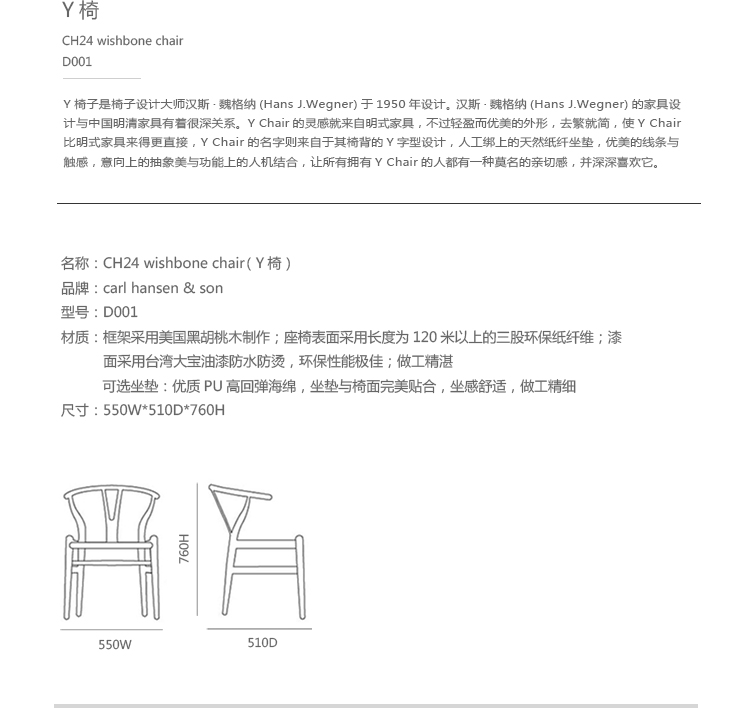 Y椅子是Hans J.Wegner最著名的作品。 它具有重量轻、有吸引力、舒适、中式风格等特点。 该款设计灵感来源于中国传统家具,四平八稳,古色古香,大气自然。上圆下方,浑然天成,深受中国顾客喜欢。Y椅关键在于是工艺与简约的设计,有着清晰的线条。 尽管椅子简约的外观要超过100个步骤进行。除其他事项外,手工编织座垫超过120米的线。 材料有丹麦硬木(橡木,榉木,水曲柳)以及北美硬木(胡桃木,樱桃木)等。外表可漆成各种各样的颜色。 垫子的座位可以添加额外的舒适。