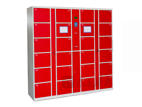 寄存柜柜体选用优质冷轧钢板,厚度不小于1.0mm,经冷加工成形后,用二氧化碳气体保护焊焊接装配而成,柜体结构坚固结实。柜体表面经除锈、除油、打磨、磷化处理后喷塑(不接受喷漆)。箱门背面增加纵向加强筋,提高箱门的防撞击能力。箱门两侧呈一定角度的弧线外形,增强箱门的防撞击能力,并且有效防止使用者因疏忽碰伤、磕伤。电控锁采用棘爪式结构,360度防撬、防插。