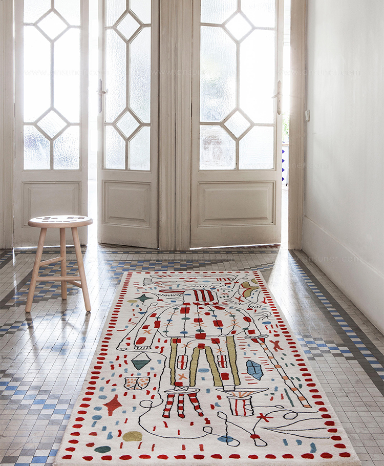 第一眼看到的是一片混乱的颜色和形状,它们侵入了地毯。然而,在仔细看,Jaime海因弹簧的想象力生活:海龟、嘴唇,手,凳子,鱼,男人等等...