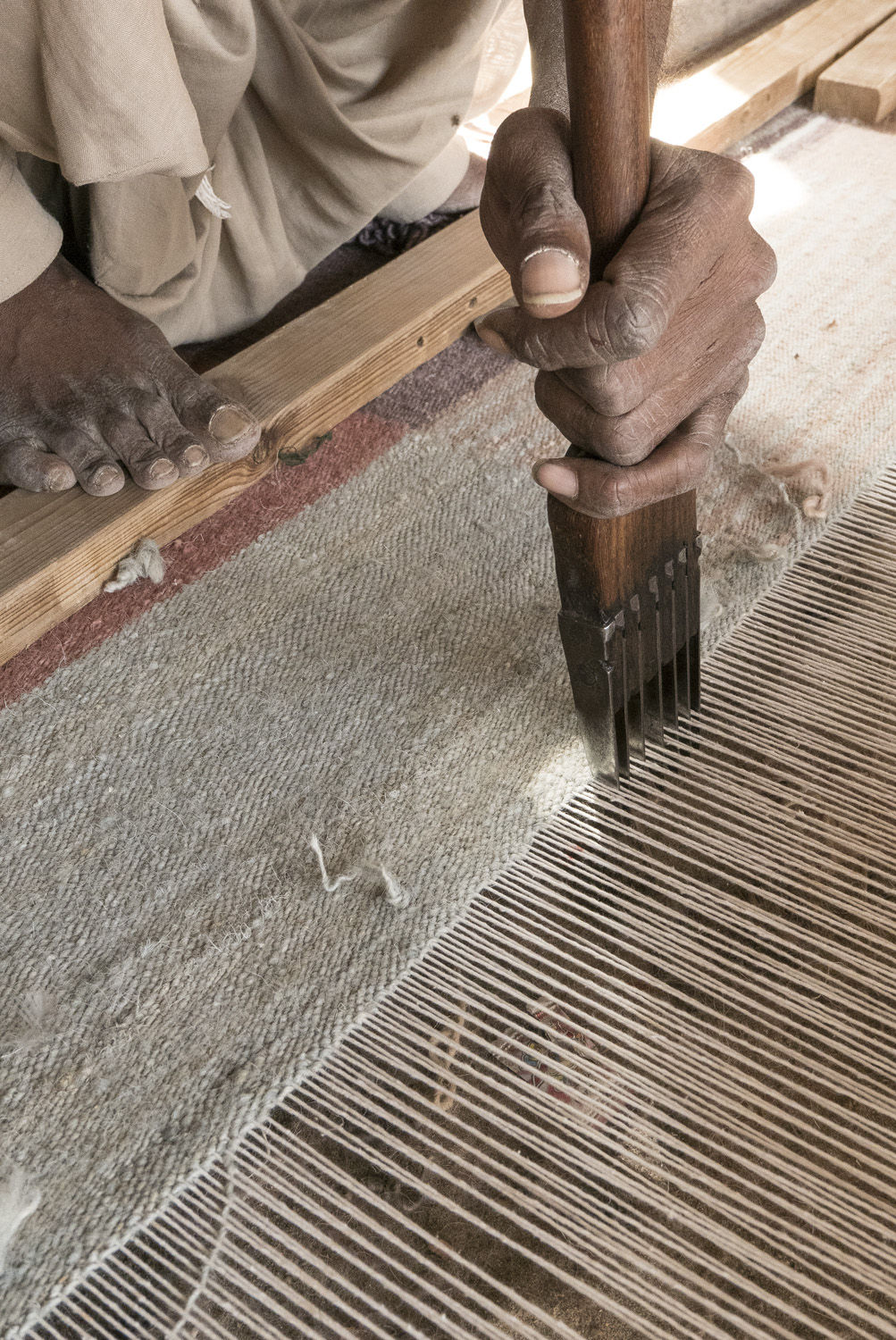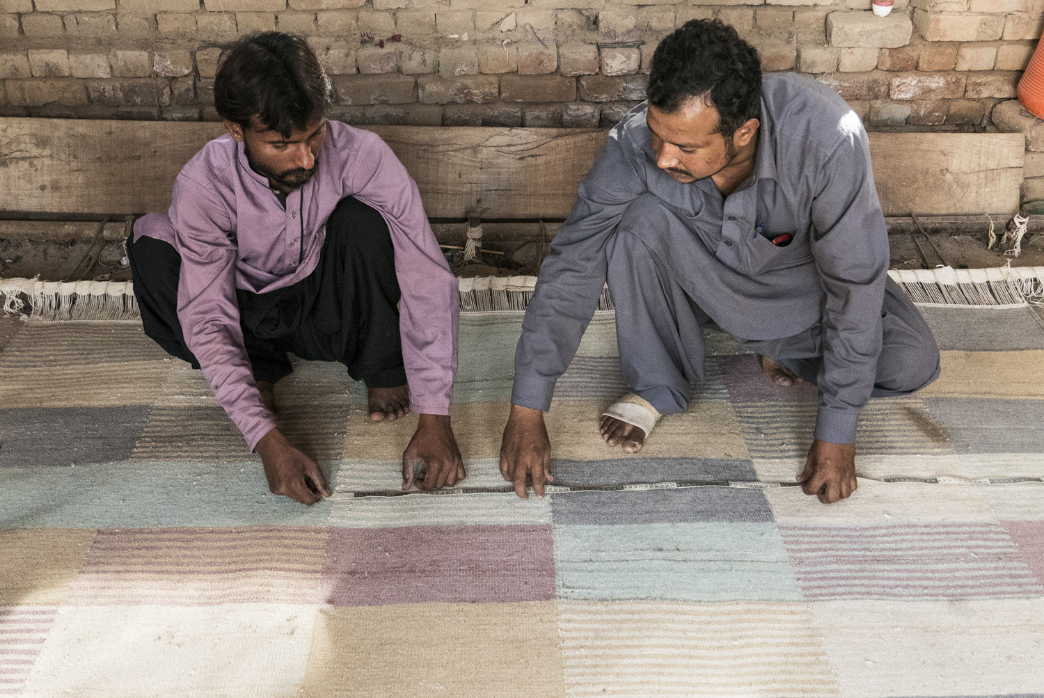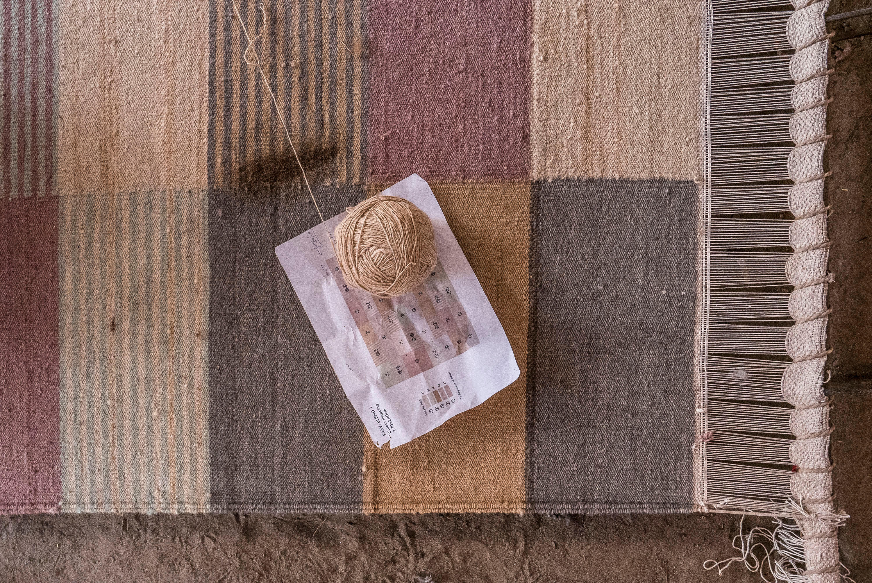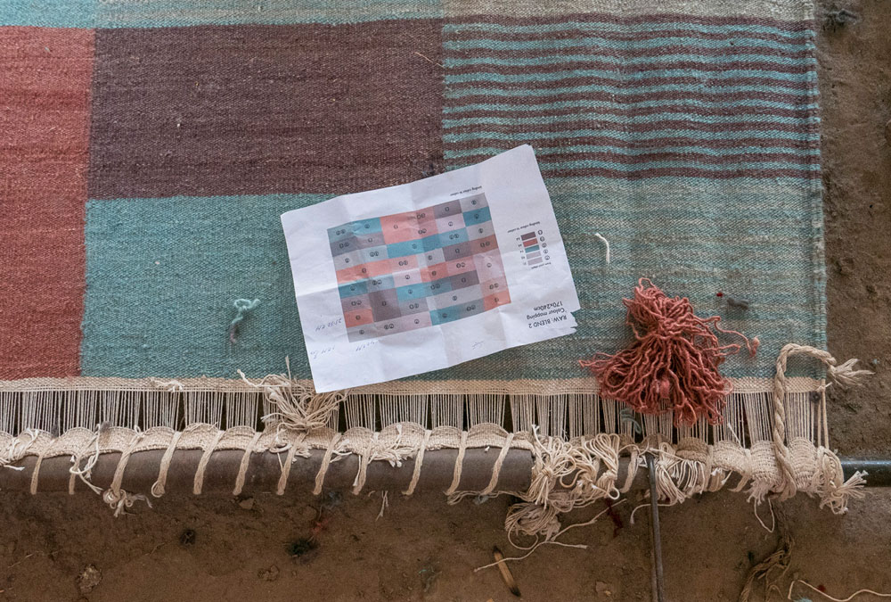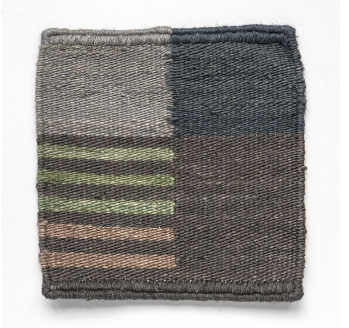 混合使用视觉感知的颜色。固体表面与由线条构成的表面相互作用。这些双色的线条融入观众的眼睛,创造出新的色彩。由于这个图形系统,许多细微的阴影被呈现出从5个不同的纱线。