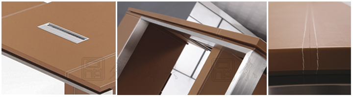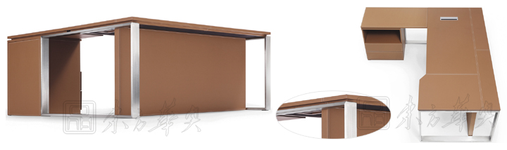 ※ 上图为大班台不同角度的展示,精湛的做工,皮革台面,不锈钢拉丝脚架,搭配出清爽的办公环境!