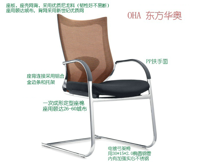 B: PP扶手面,50密度一次成形定型座棉,座板、座壳网背、采用优质尼龙料(韧性好不易断)座用颐达26-60绒布,背网采用新世纪优质网,OL-2907橙色。