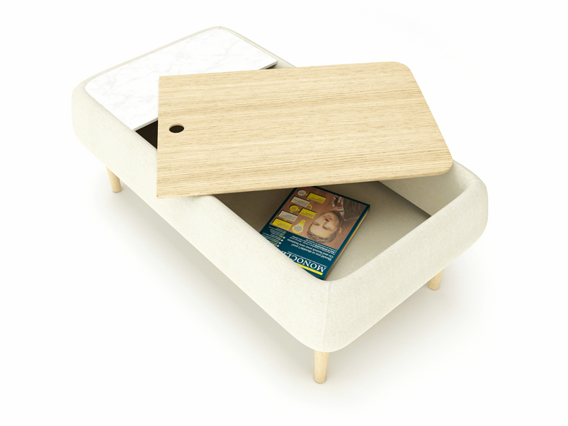 Etna coffee table carry on the spirit of the sofas completing the composition with an elegant piece that display armonius proportions and material balance with the use of solid wood feet, so upholstery, marble fix top and plywood lid on top of a storage for daily use.