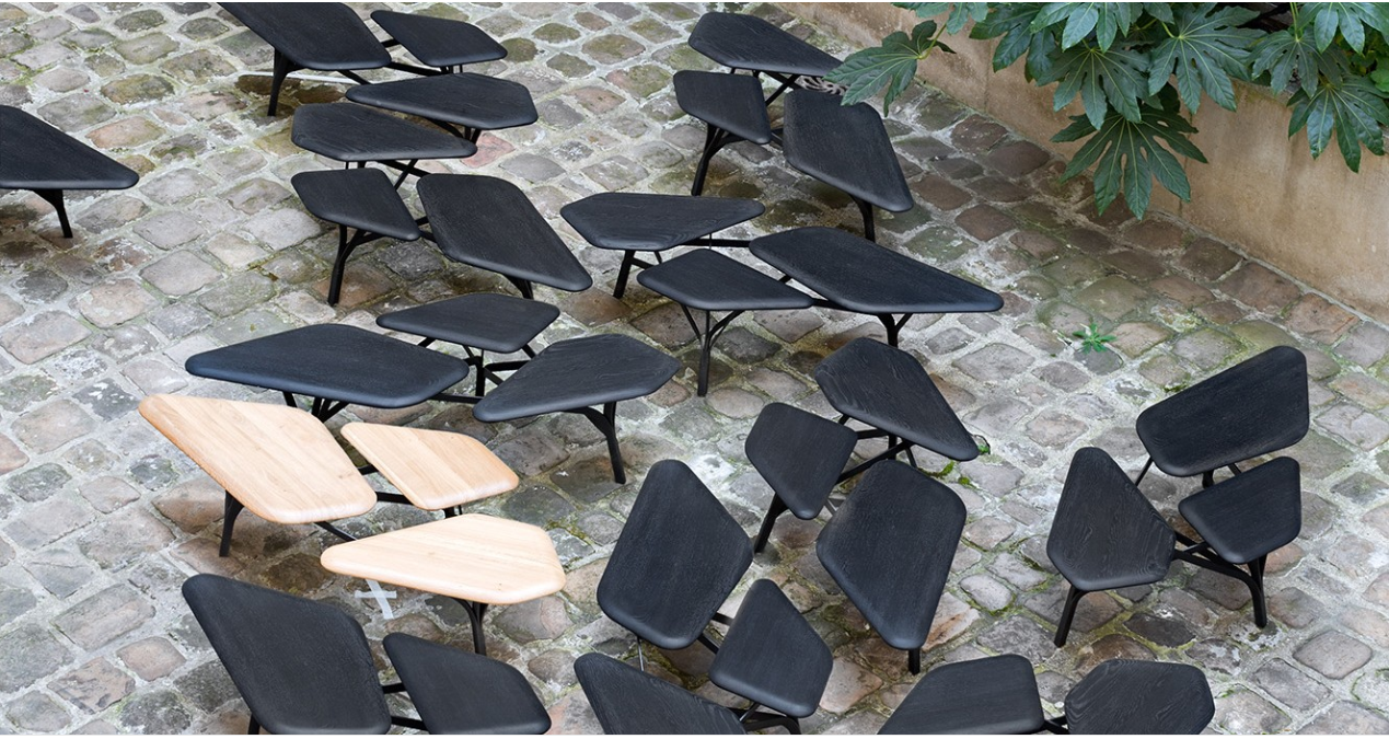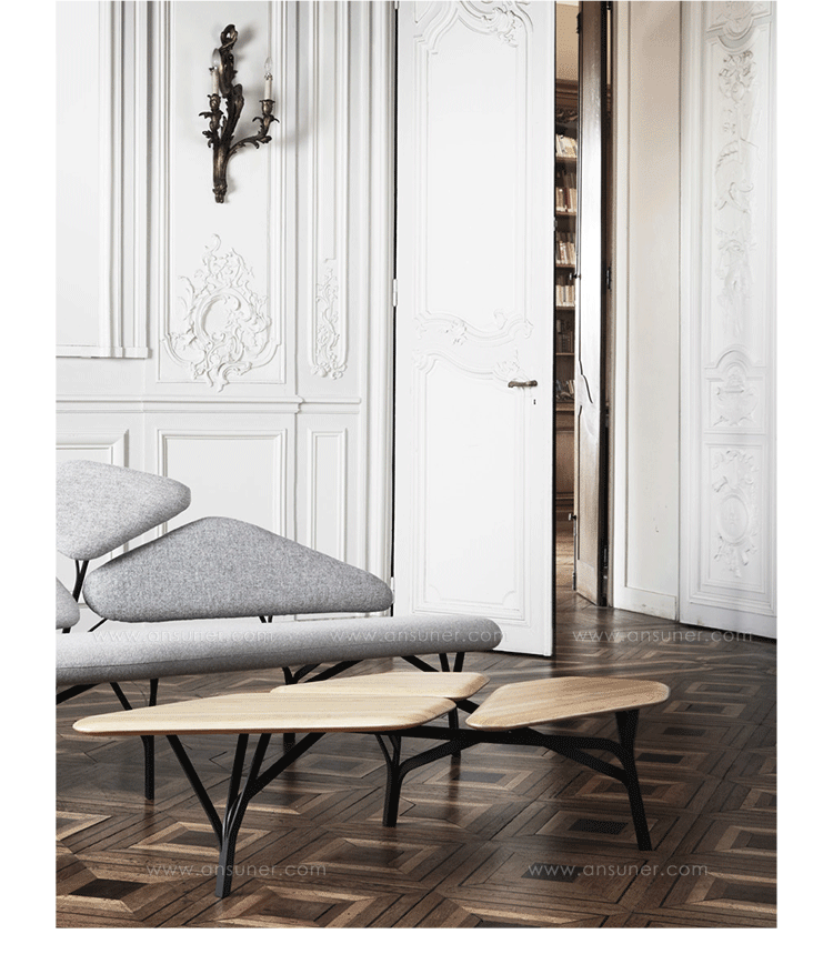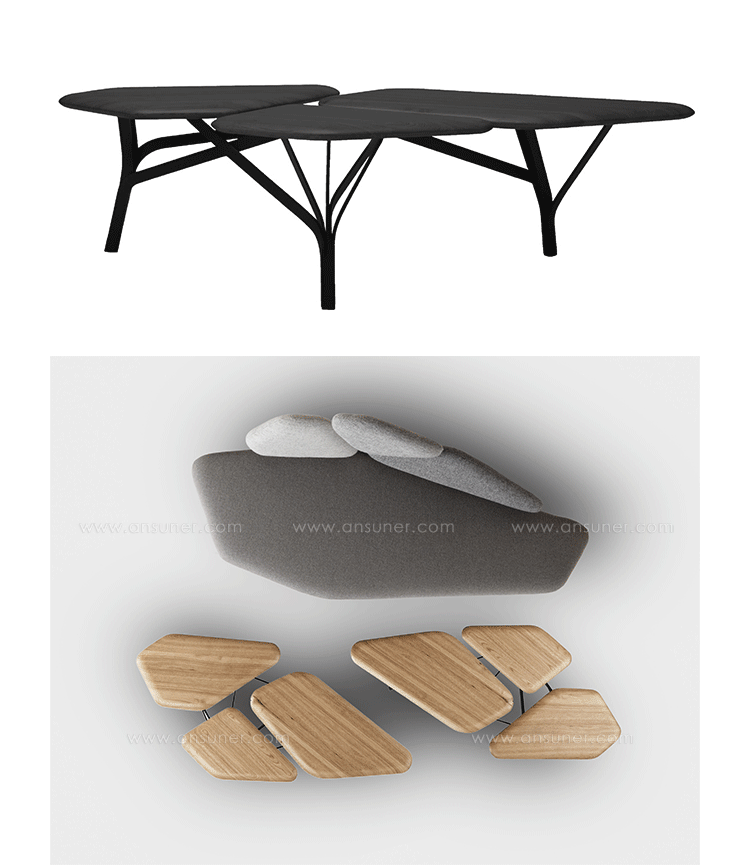 “波”是一个咖啡桌的灵感来自于石头松树波勒兹别墅的罗马。 金属结构繁殖的分支网络和支持三种木质表面。 表可以组合组合和成长这国内的树冠。
