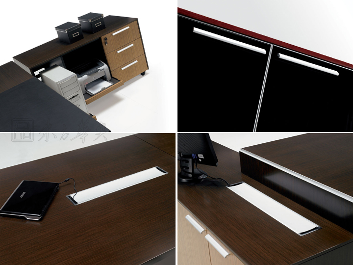 ※ 通过不断研讨及风格重塑,简系列经理台具有鲜明的个性风格,同时又注重功能,追求外观和功用内在统一,从而与传统办公台区别开来,逐渐演变成注重人性和谐的流行款式。 ※ 矩形的主台,从平面到造型,简洁明了,逻辑性强,表现出理性的特点,预设多功能线管理系统。 ※ Y型铝合金台面台脚连接件,巧妙处理木纹对接工艺,内藏式钢架,保证连接强度。