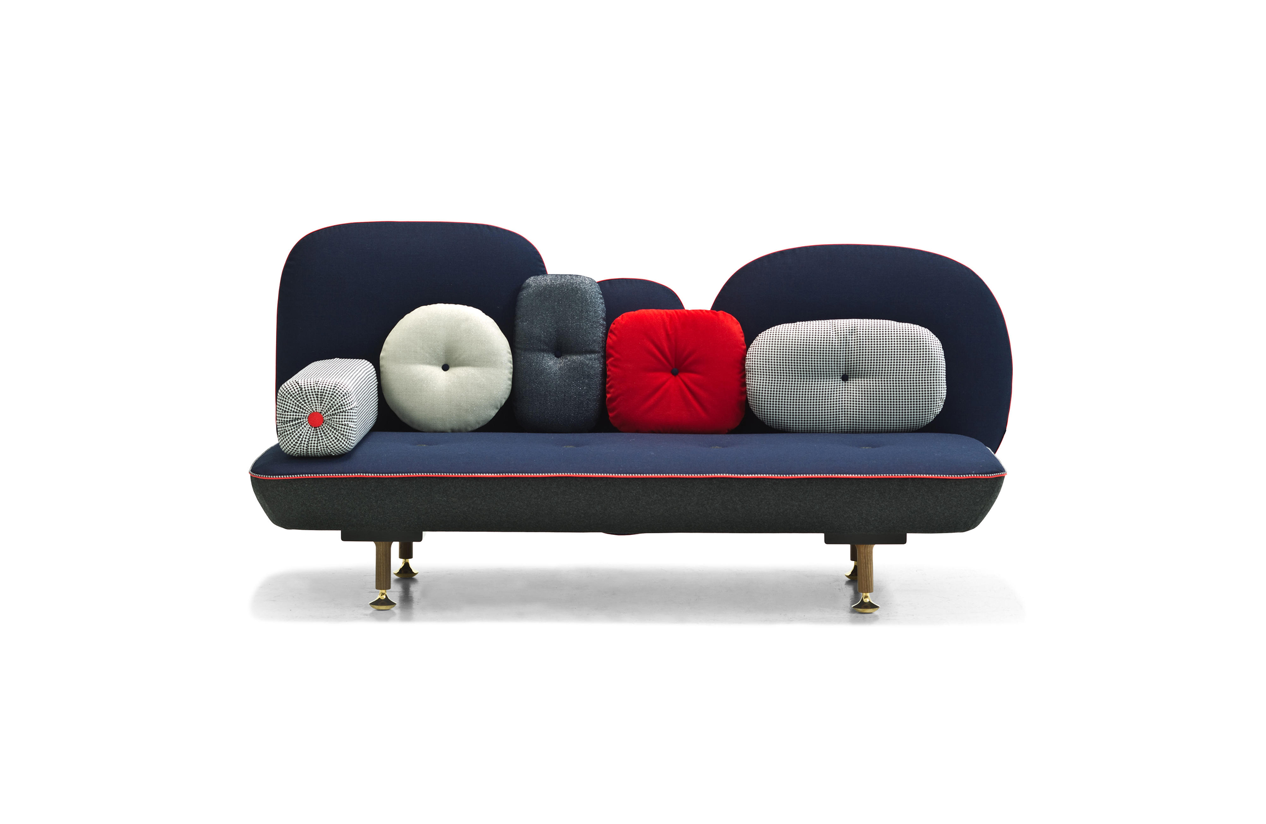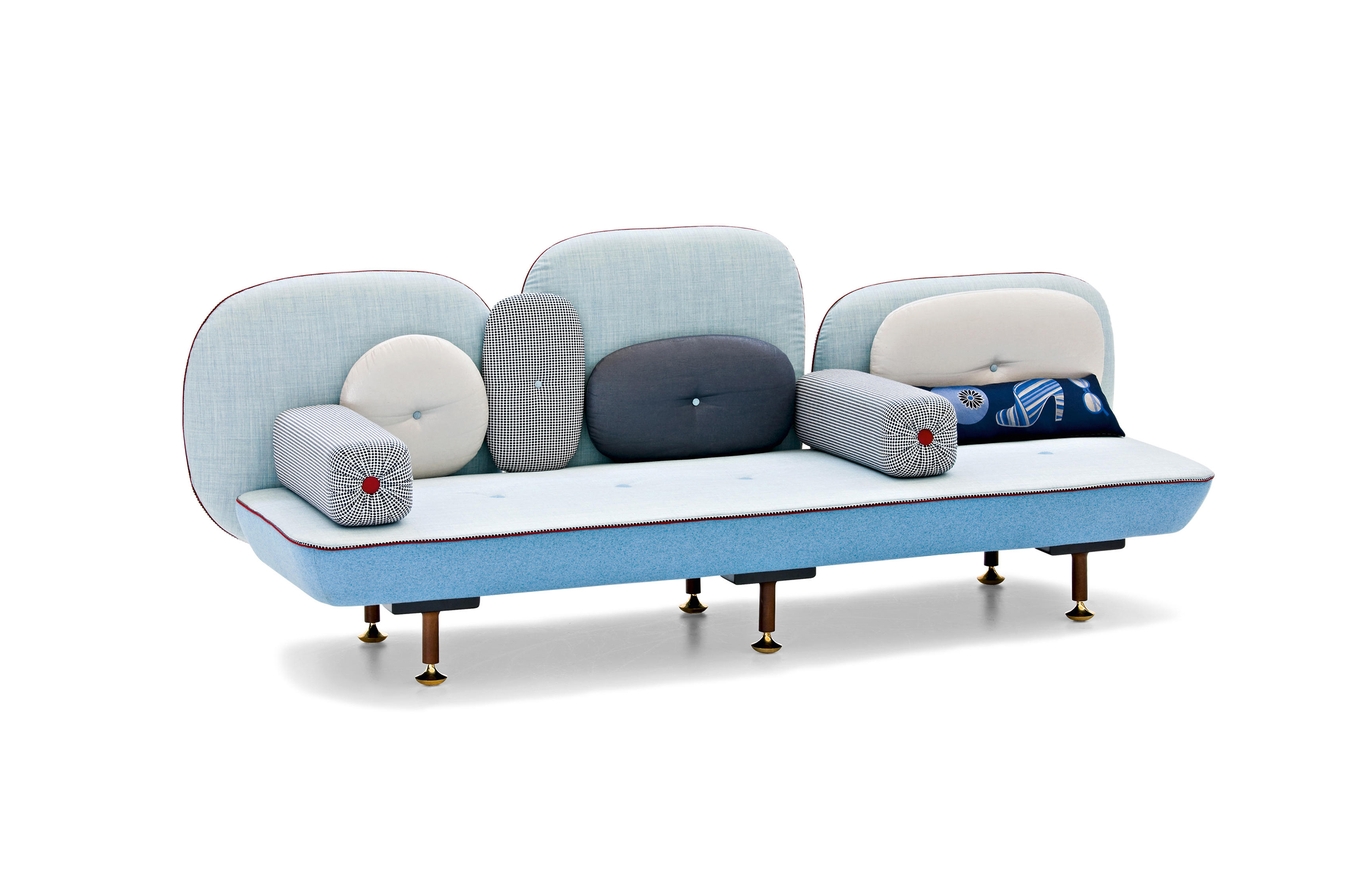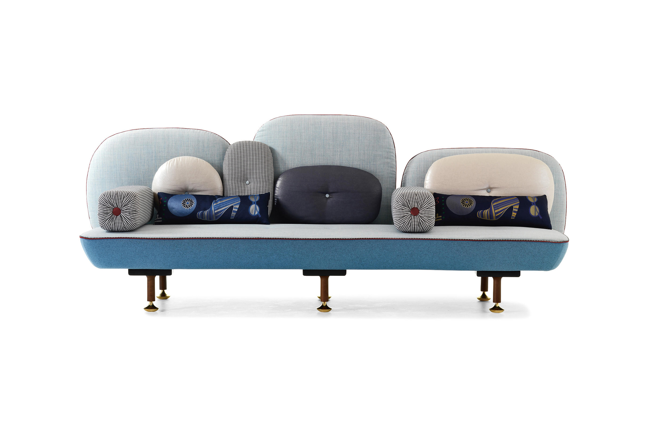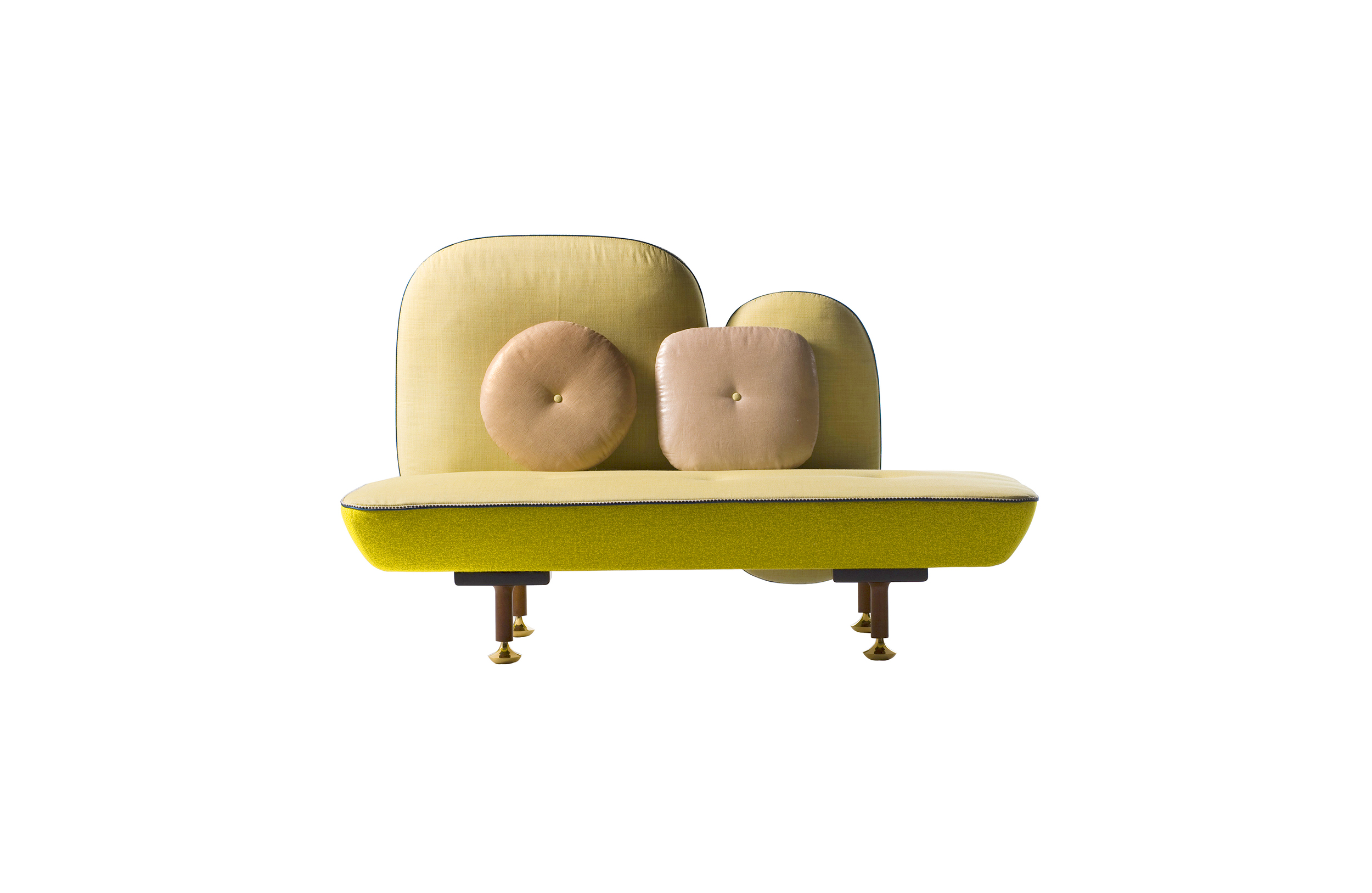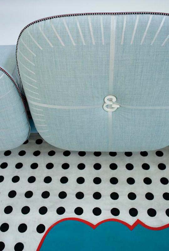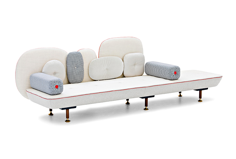 我美丽的背面是一个座椅的集合,它的靠背是由各种形状的高颜色的浮动靠垫组成。座椅越宽,可以使用的垫子就越多。我们使用超大的符号,比如靠垫上的按钮,是一种传递各种信息的方式。这些符号也提供了一种定制椅子的方法,让它变得独一无二,就像你对一件衣服的区别一样。上面的床垫上覆盖着不同的物品,因为他们从一个现代的公主身上得到灵感,他们用金和银镶边。