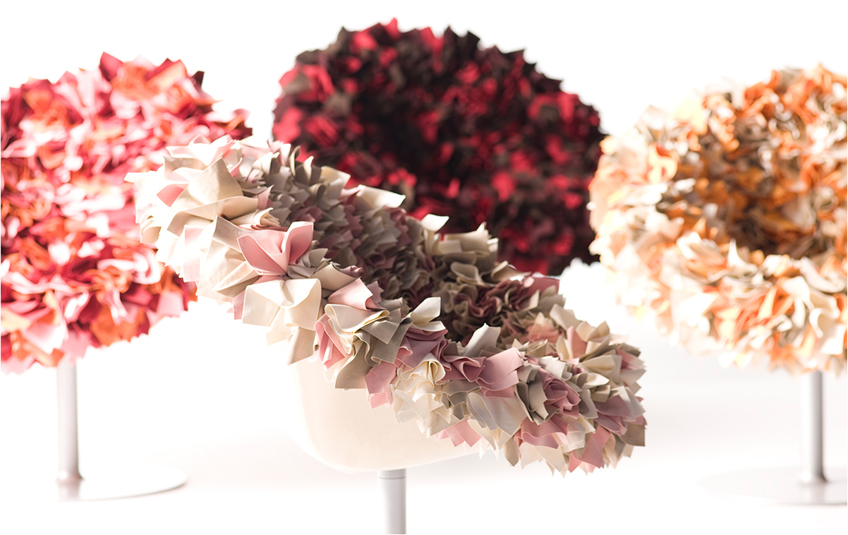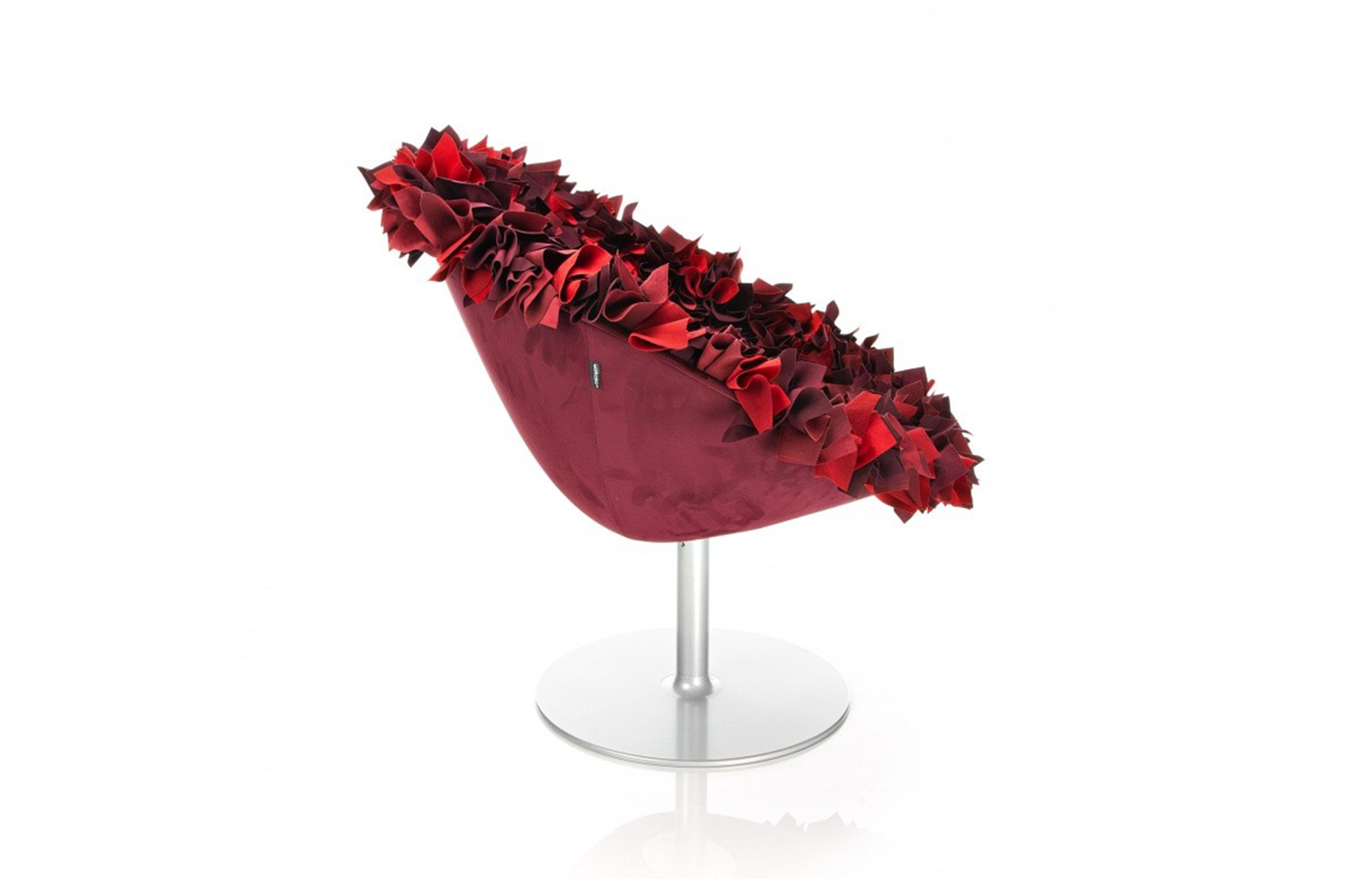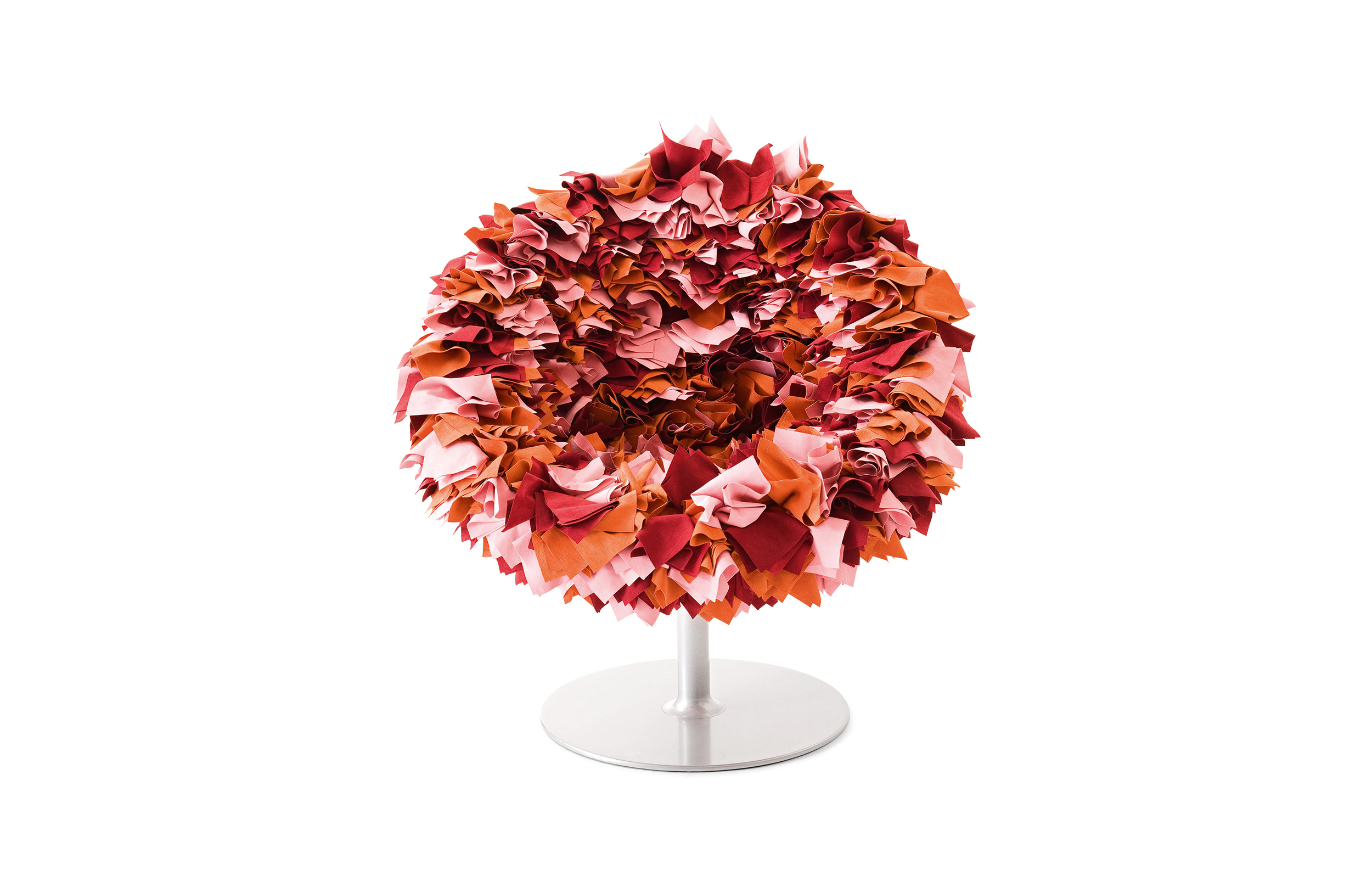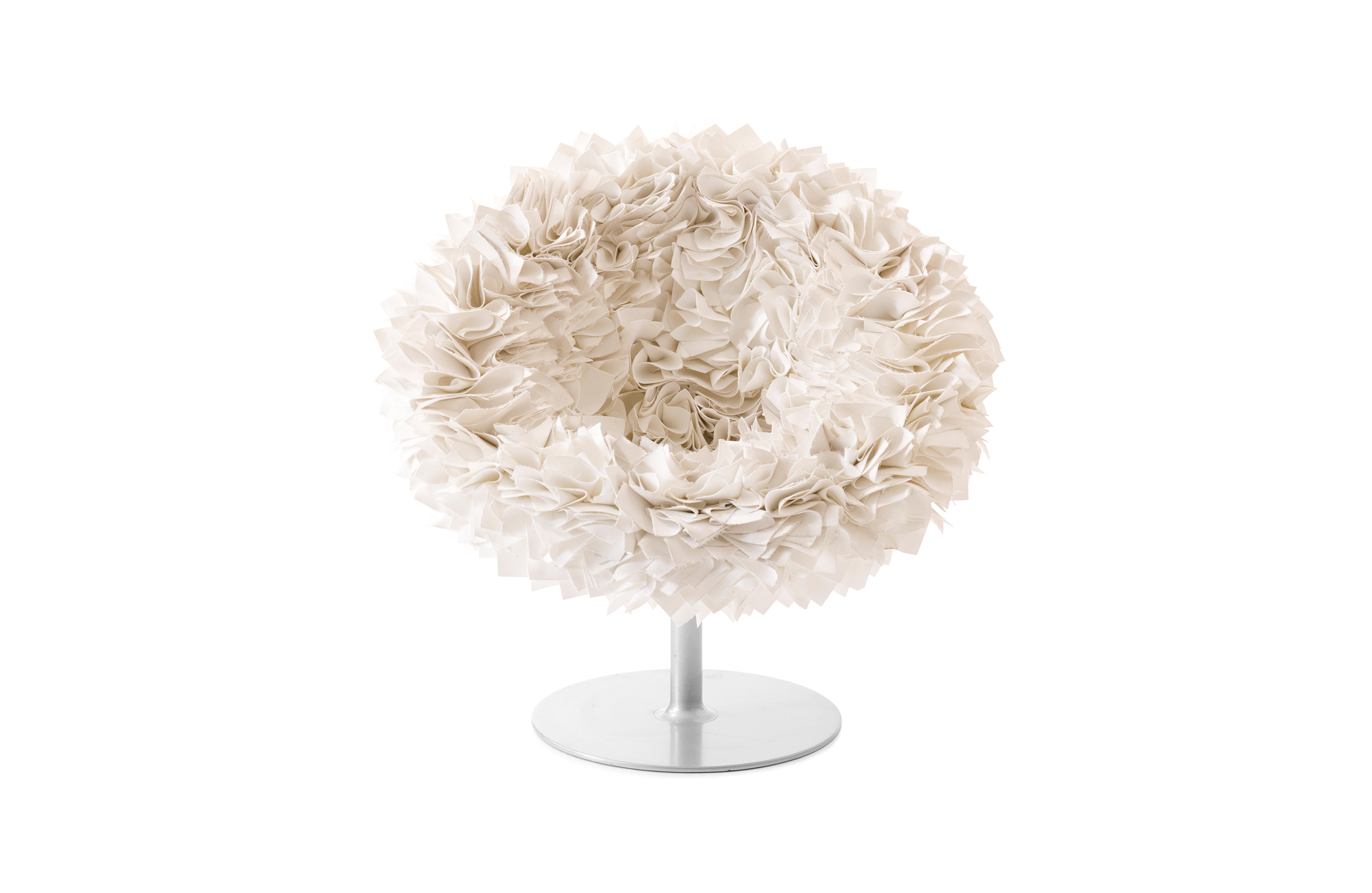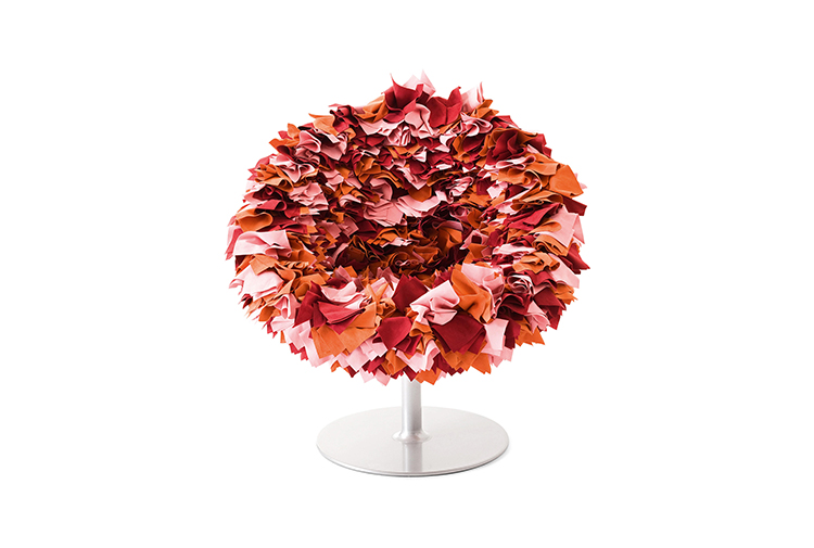 如纤细的镀铬金属茎上,绽放出一束花瓣,花瓣由一块块的织物组成,这些织物是用熟练的双手和无限的耐心一一折叠和缝制的。这是对精神美的一种赞颂,这种美存在于一个简单的重复动作中,揭示了视觉和真实形象之间的界限。花瓣的外皮包裹着鸡蛋形状的贝壳,直到所有的内部都被覆盖。梦幻的寓言,在工业设计的对象中颂扬的复杂的诗意转换。这把椅子让坐在上面的每个人都很开心,就像一束花一样。