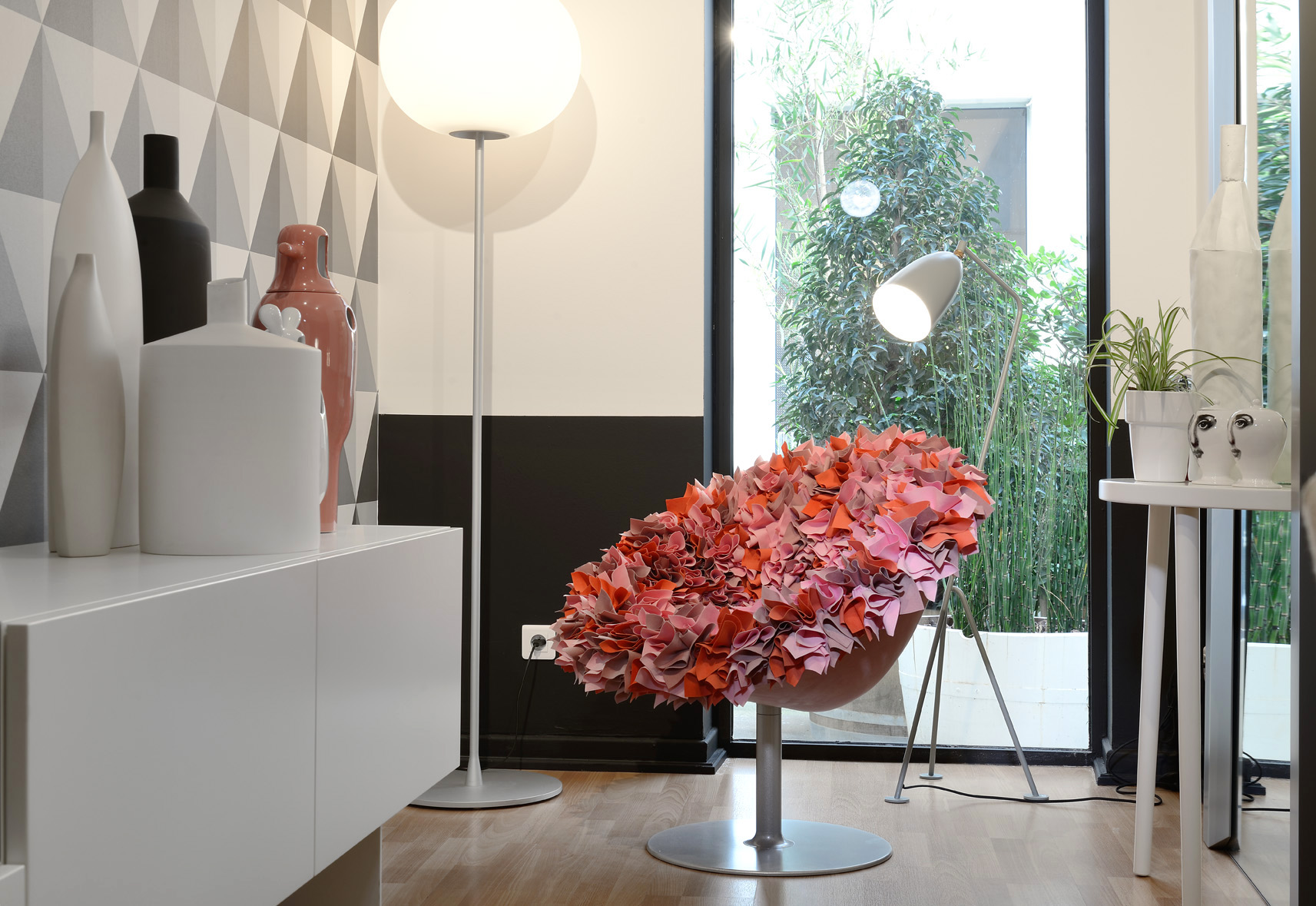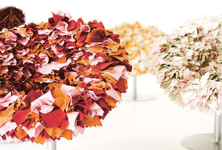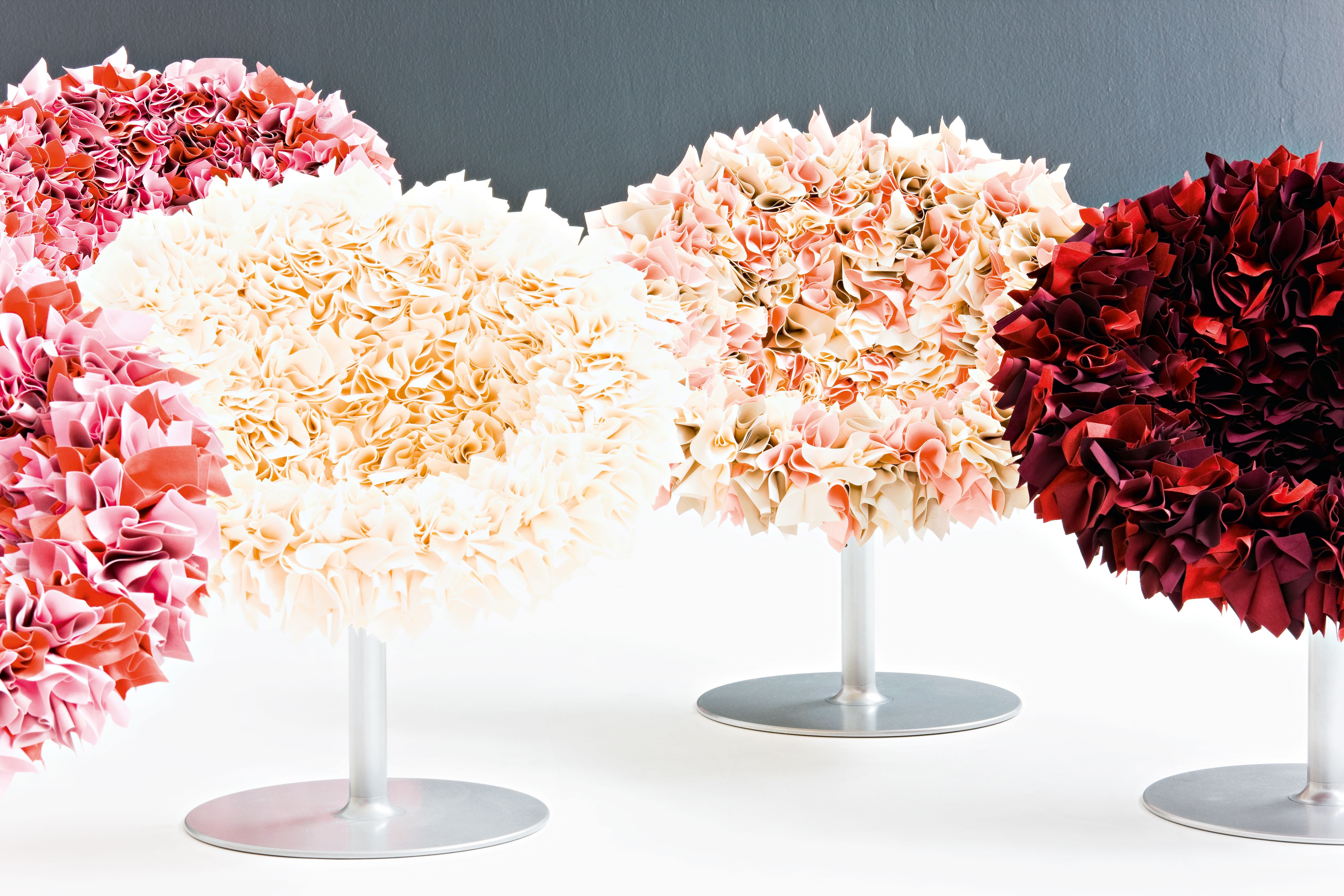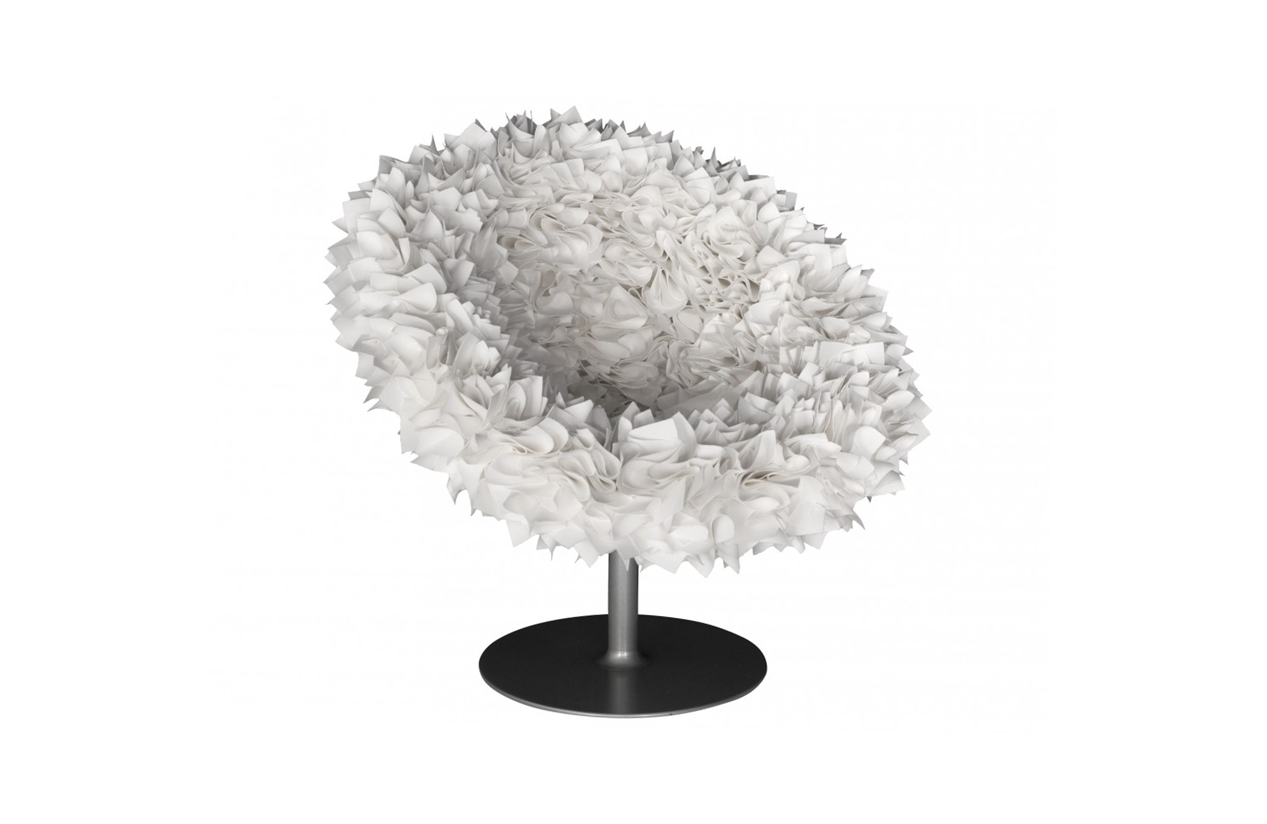 如纤细的镀铬金属茎上,绽放出一束花瓣,花瓣由一块块的织物组成,这些织物是用熟练的双手和无限的耐心一一折叠和缝制的。这是对精神美的一种赞颂,这种美存在于一个简单的重复动作中,揭示了视觉和真实形象之间的界限。花瓣的外皮包裹着鸡蛋形状的贝壳,直到所有的内部都被覆盖。梦幻的寓言,在工业设计的对象中颂扬的复杂的诗意转换。这把椅子让坐在上面的每个人都很开心,就像一束花一样。
