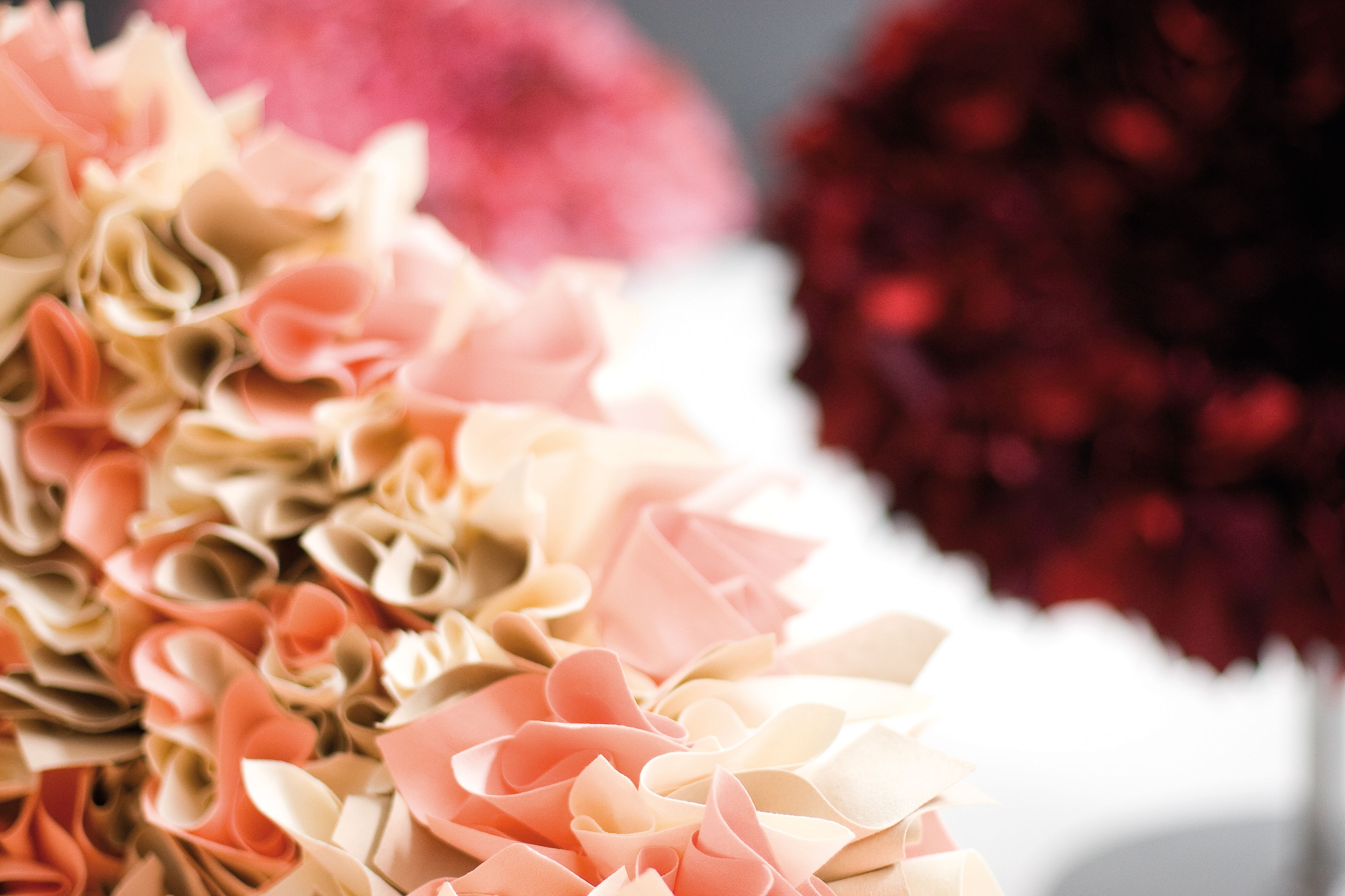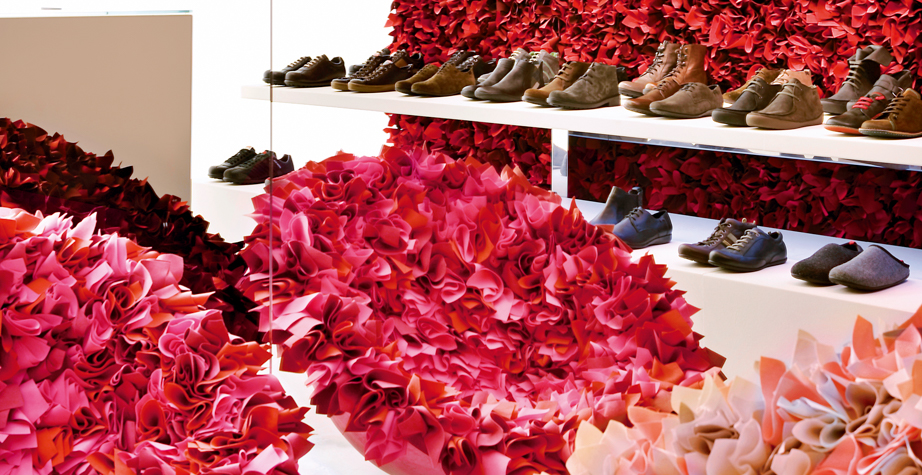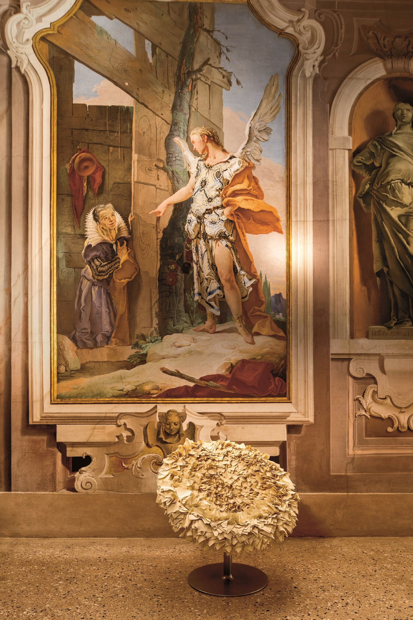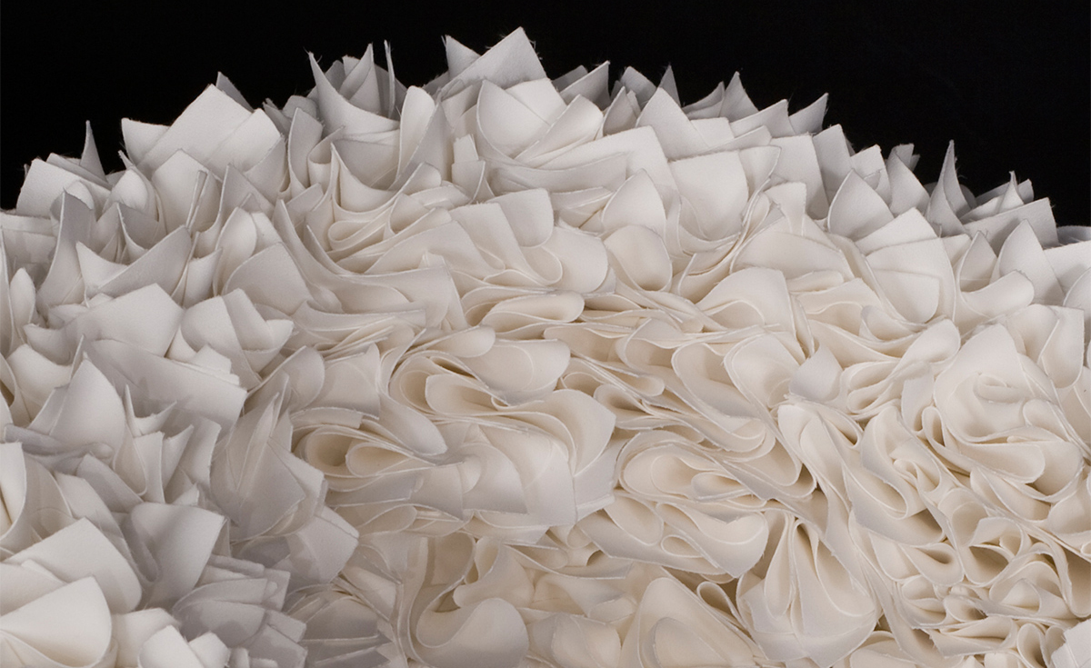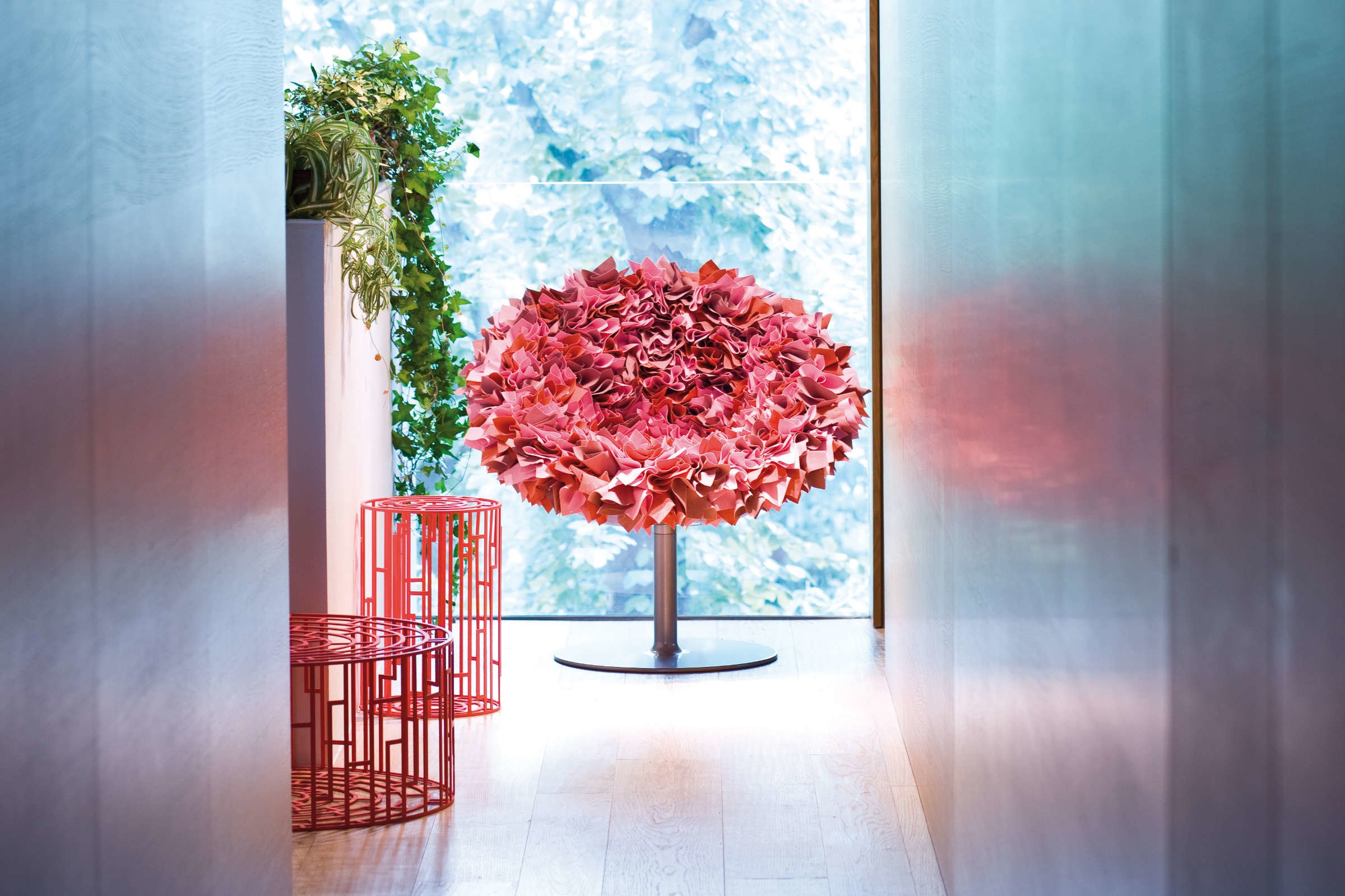 如纤细的镀铬金属茎上,绽放出一束花瓣,花瓣由一块块的织物组成,这些织物是用熟练的双手和无限的耐心一一折叠和缝制的。这是对精神美的一种赞颂,这种美存在于一个简单的重复动作中,揭示了视觉和真实形象之间的界限。花瓣的外皮包裹着鸡蛋形状的贝壳,直到所有的内部都被覆盖。梦幻的寓言,在工业设计的对象中颂扬的复杂的诗意转换。这把椅子让坐在上面的每个人都很开心,就像一束花一样。