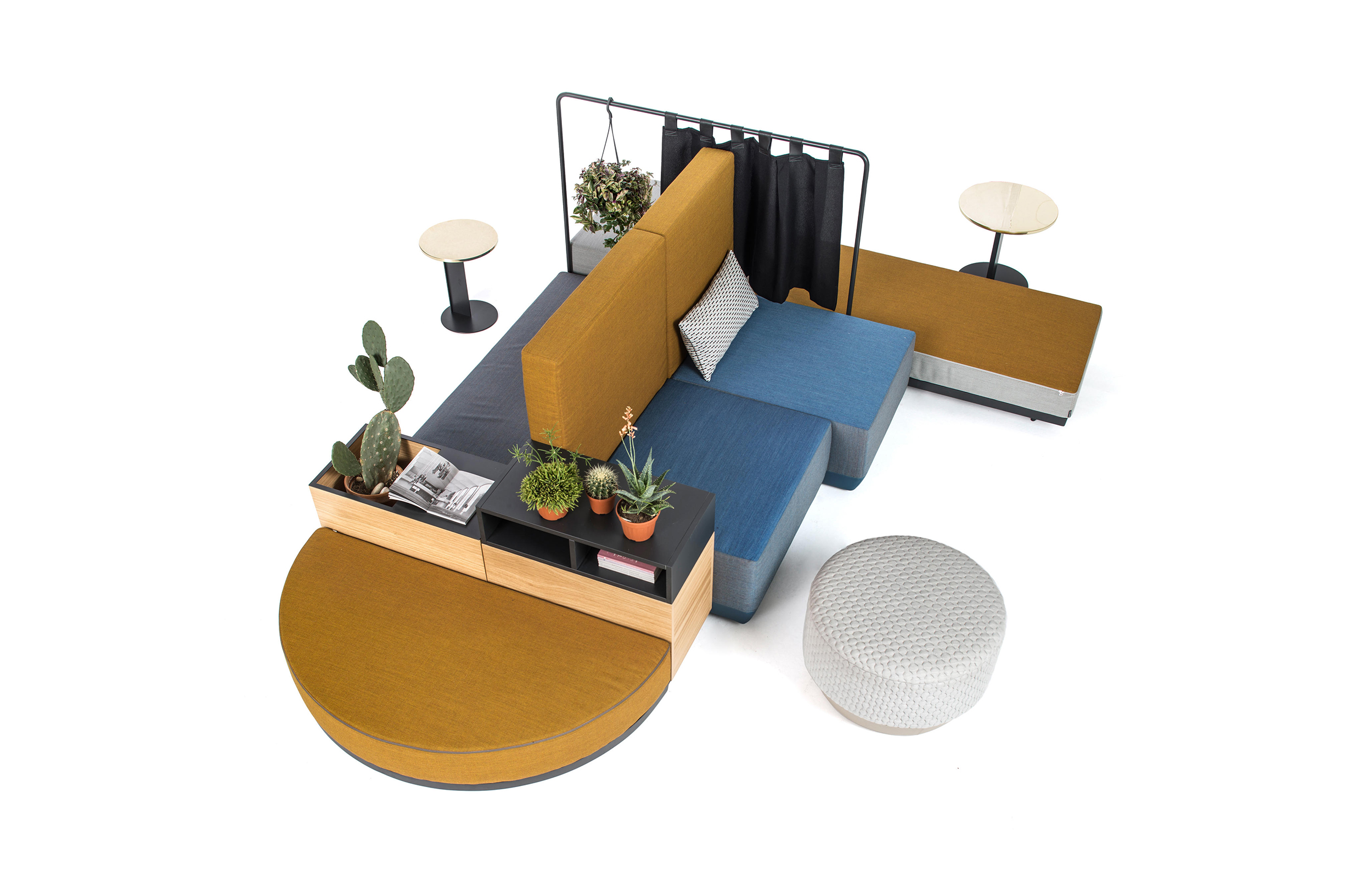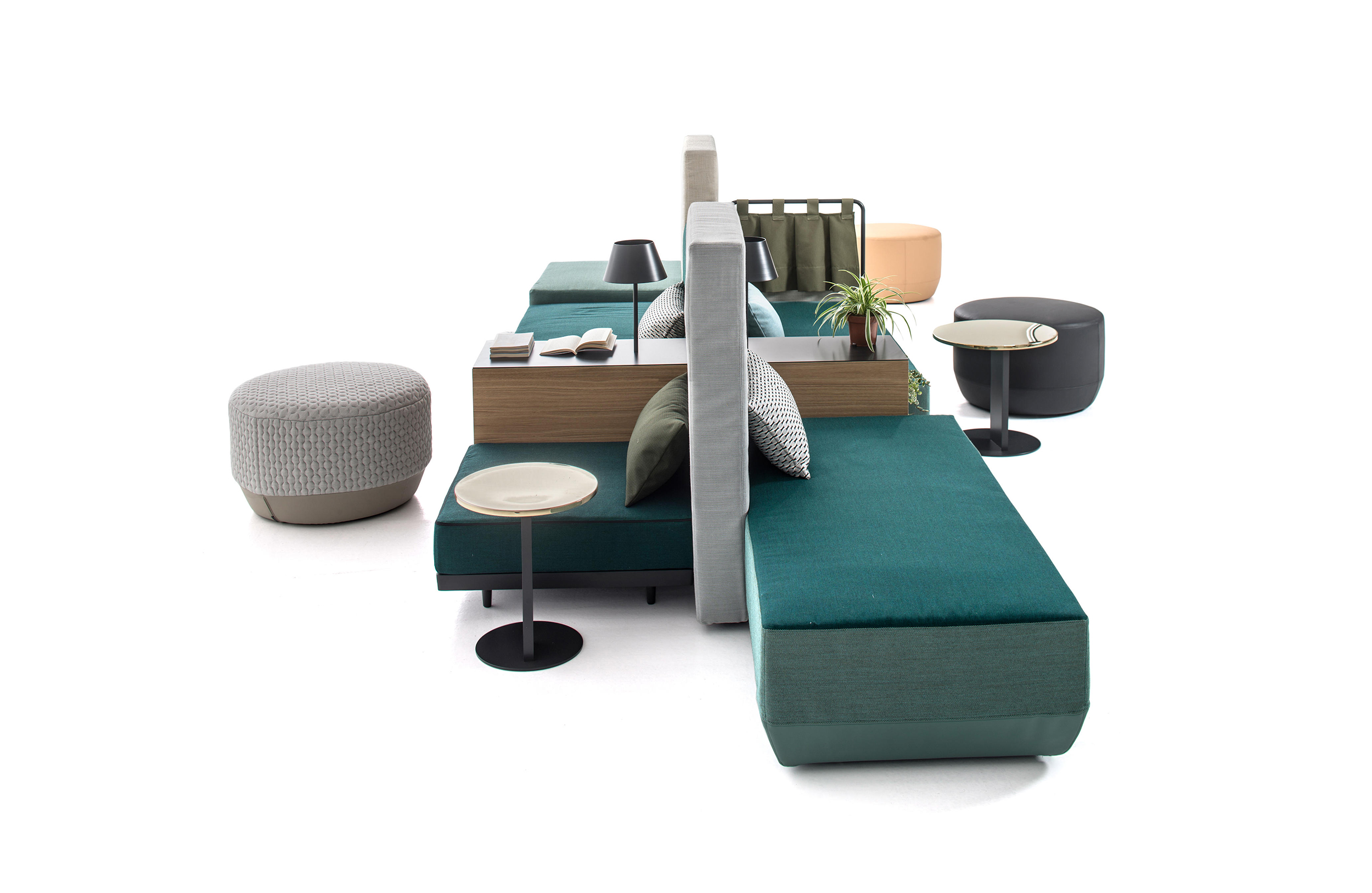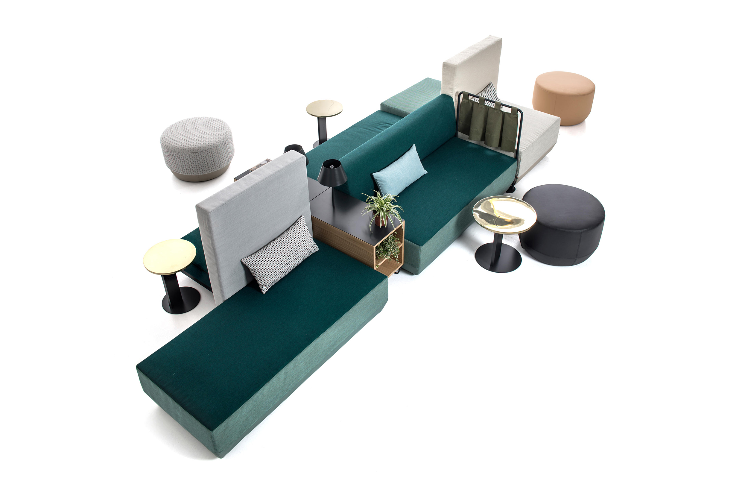 设计相互作用,轨迹控制空间。比基尼是一种风景,它是时代的产物,是它所代表的社会。无论是在等候区还是在家中使用,座位系统是绝对灵活的,因为不需要空间的布局和座位组件的排列。这些组件在外观和功能上各不相同,因此,它们可以在任何设置中使用。凳子、桌子、衣架、容器、架子、屏风、工作台、座椅:每一个元素都结合在一起,创造互动和交流。多种功能和含义的结合意味着沙发作为看电视的家具或简单的休息场所的概念发生了革命性的变化,使它成为互动的核心。