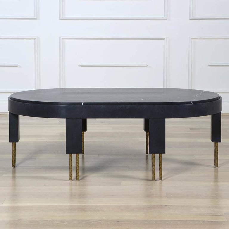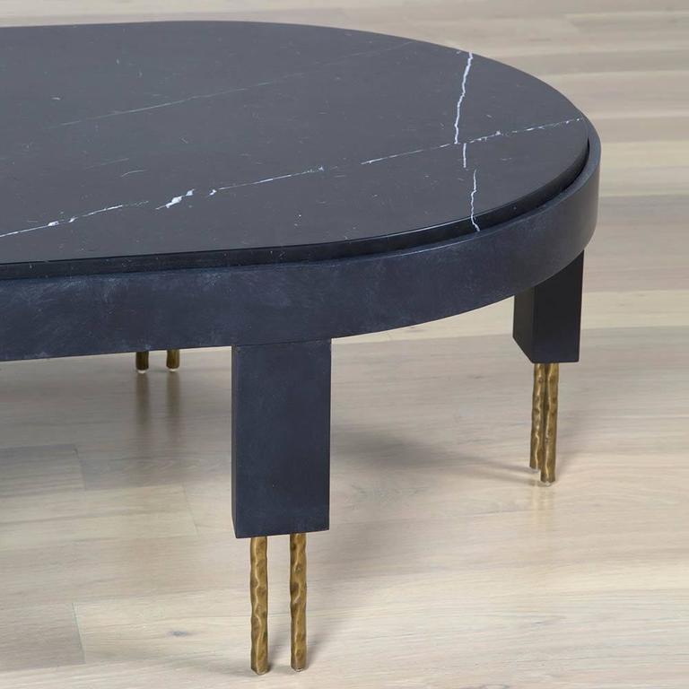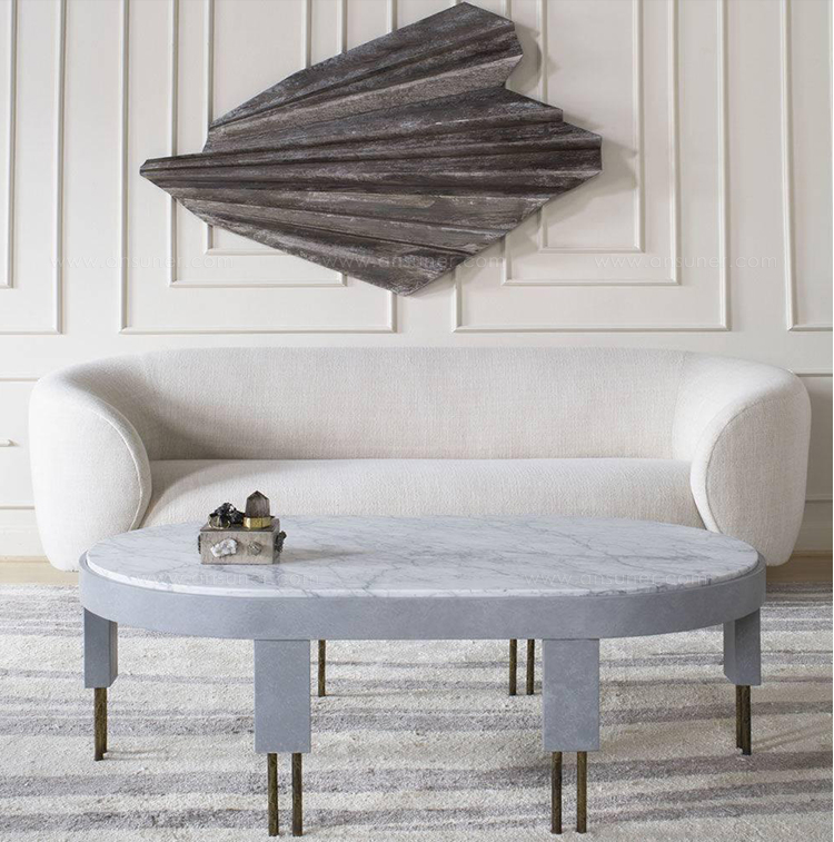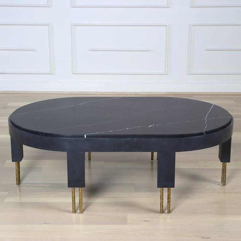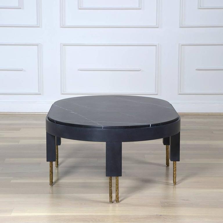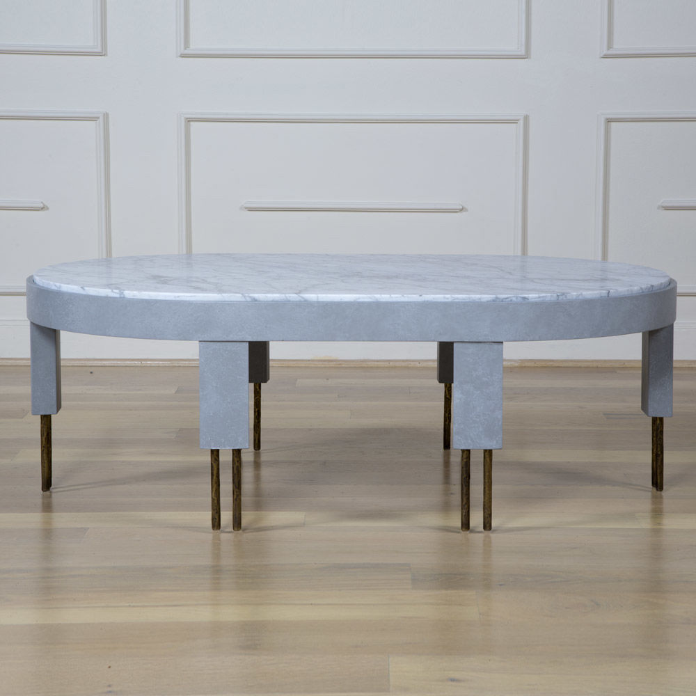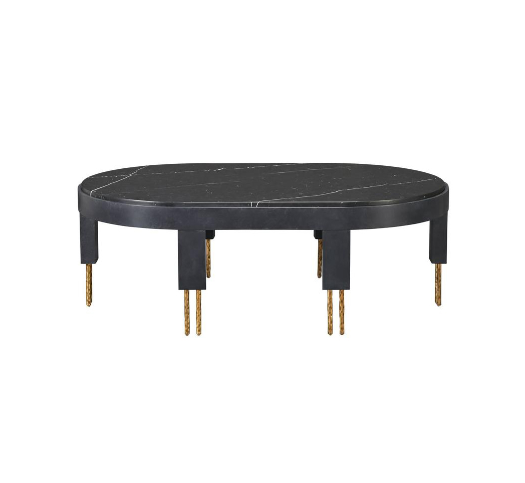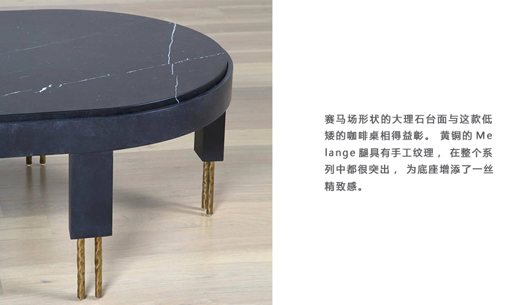 赛马场形状的大理石台面与这款低矮的咖啡桌相得益彰。 黄铜的Melange腿具有手工纹理,在整个系列中都很突出,为底座增添了一丝精致感。
