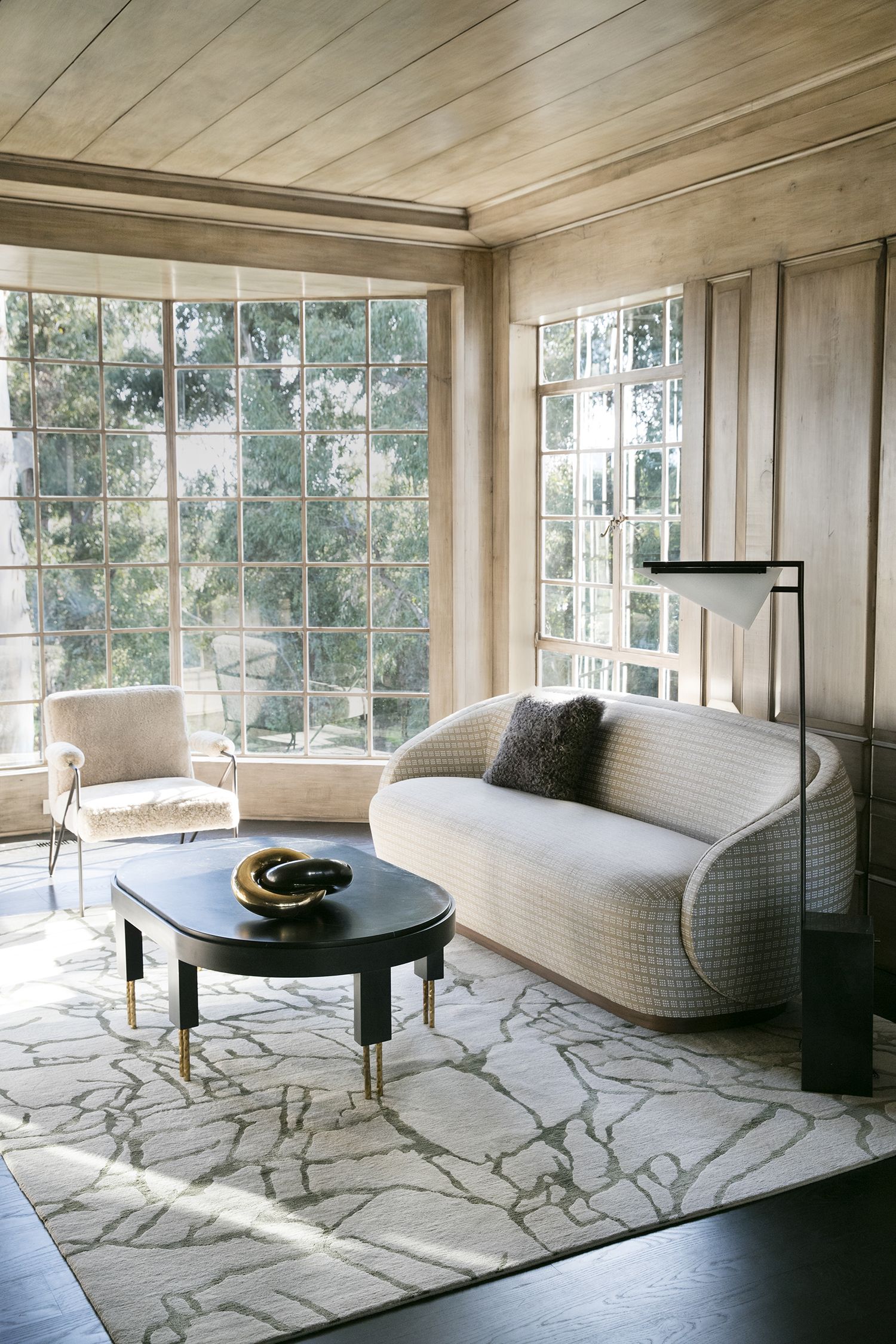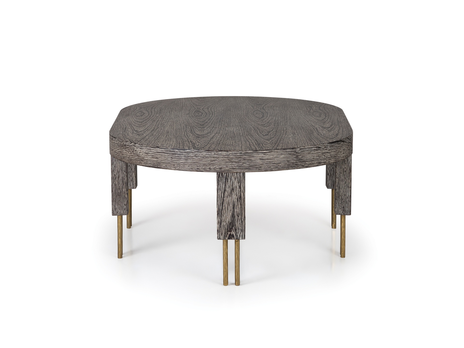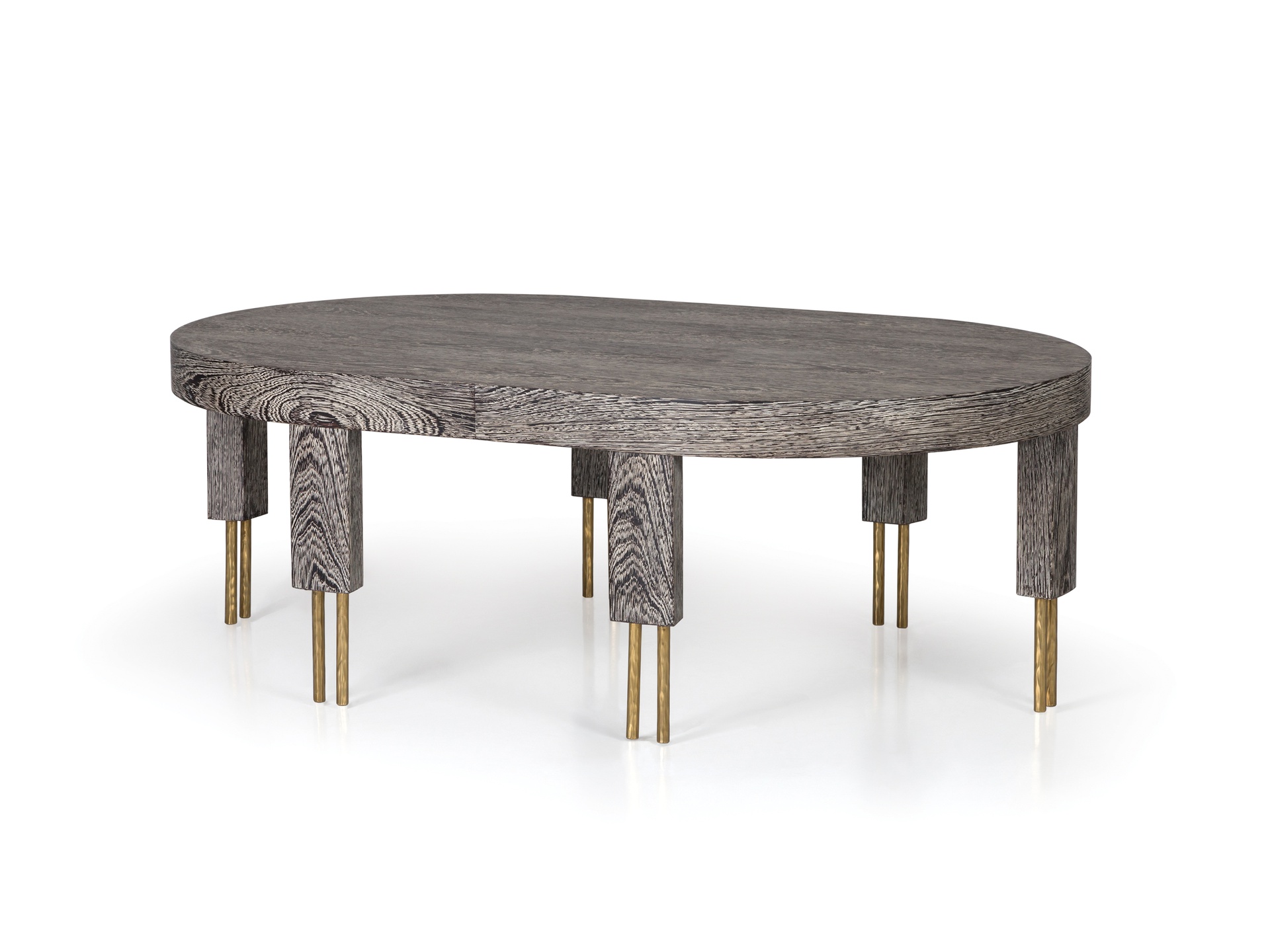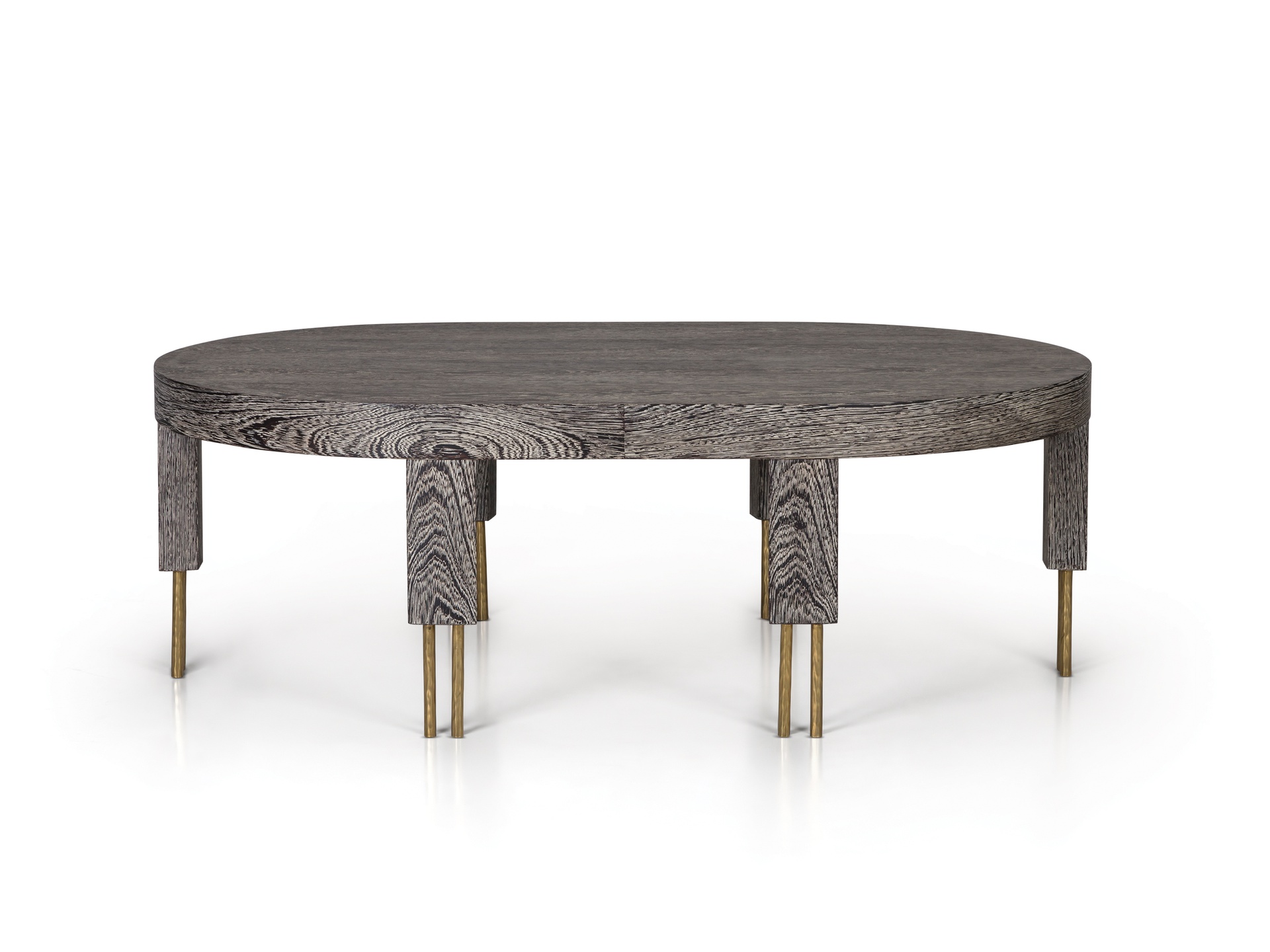 赛马场形状的大理石台面与这款低矮的咖啡桌相得益彰。 黄铜的Melange腿具有手工纹理,在整个系列中都很突出,为底座增添了一丝精致感。