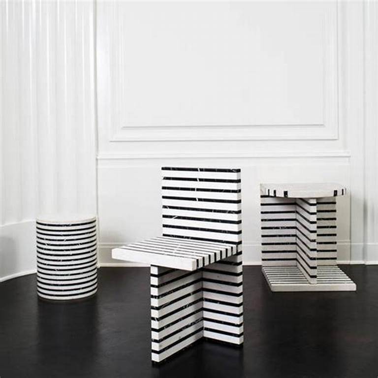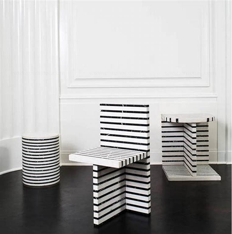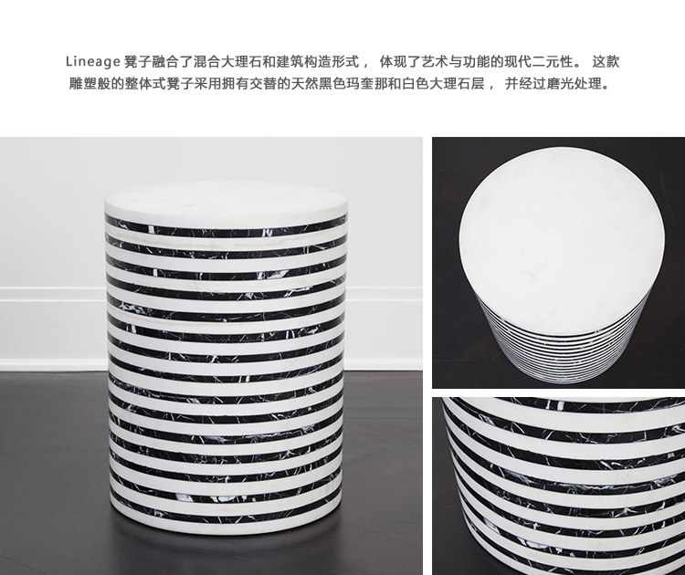 Lineage凳子融合了混合大理石和建筑构造形式,体现了艺术与功能的现代二元性。 这款雕塑般的整体式凳子采用交替层叠的天然黑色玛奎那和白色大理石,经过磨光处理。