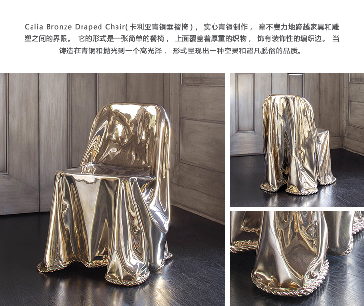 Calia Bronze Draped Chair(卡利亚青铜垂褶椅),实心青铜制作,毫不费力地跨越家具和雕塑之间的界限。它的形式是一张简单的餐椅,上面覆盖着厚重的织物,饰有装饰性的编织边。当铸造在青铜和抛光到一个高光泽,形式呈现出一种空灵和超凡脱俗的品质。在我们洛杉矶的工作室手工打造的超豪华家具生产线上,这一雄心勃勃的新产品每一件都经过了盖章和签名。原未上漆的黄铜被设计成随着时间的推移和使用而慢慢地、优雅地变黄。对于任何室内环境来说都是一个不可思议的戏剧性的补充。