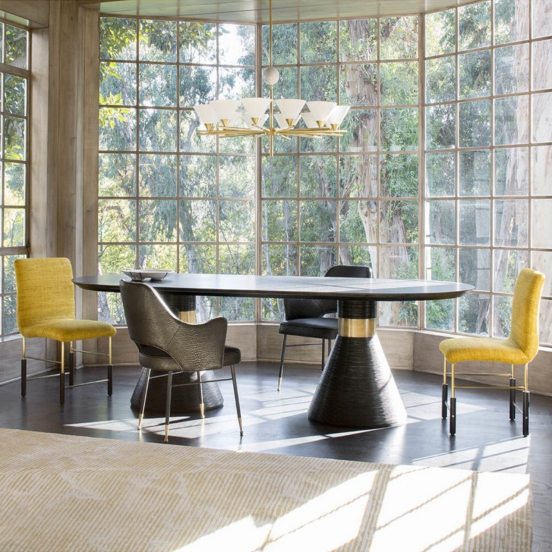 这个戏剧性的餐桌充满了凯利对混合材料和雕塑轮廓的热爱。 赛道形状的顶部是在“leathered”板岩中执行的,具有柔软的略微缓和的斜边。 圆锥形双人底座采用罗纹木材制成,饰有抛光黄铜,营造出优雅气息。