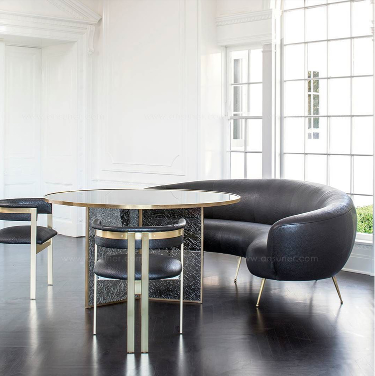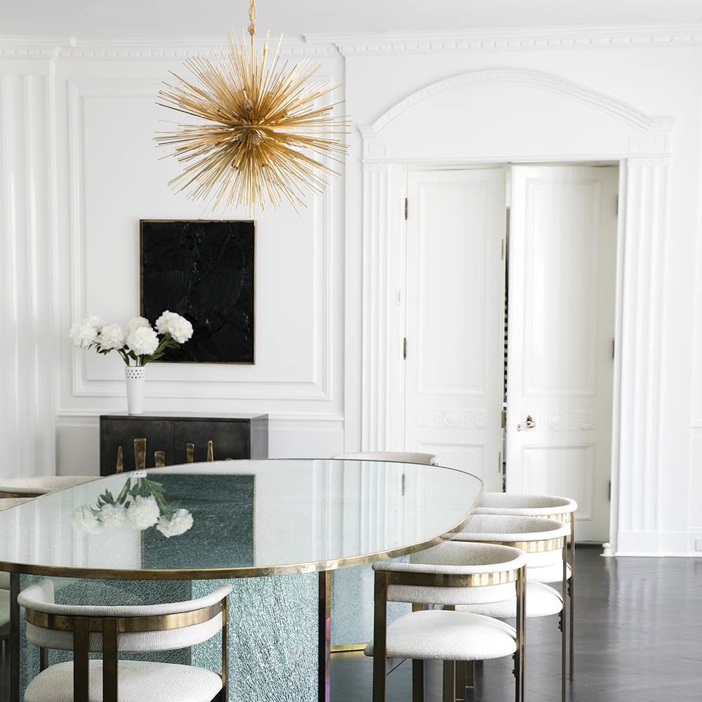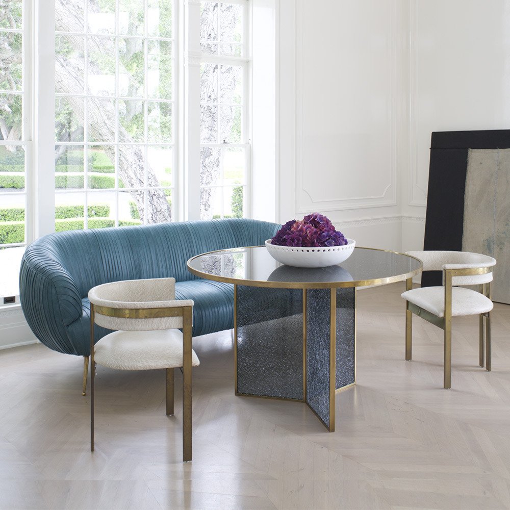 这款引人注目的现代餐桌拥有精美的纹理,融合了原始和精致的元素。 每块钢化玻璃都是手工破碎的,创造了材料的并置与优雅的古董黄铜封边条。