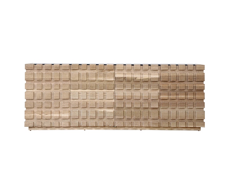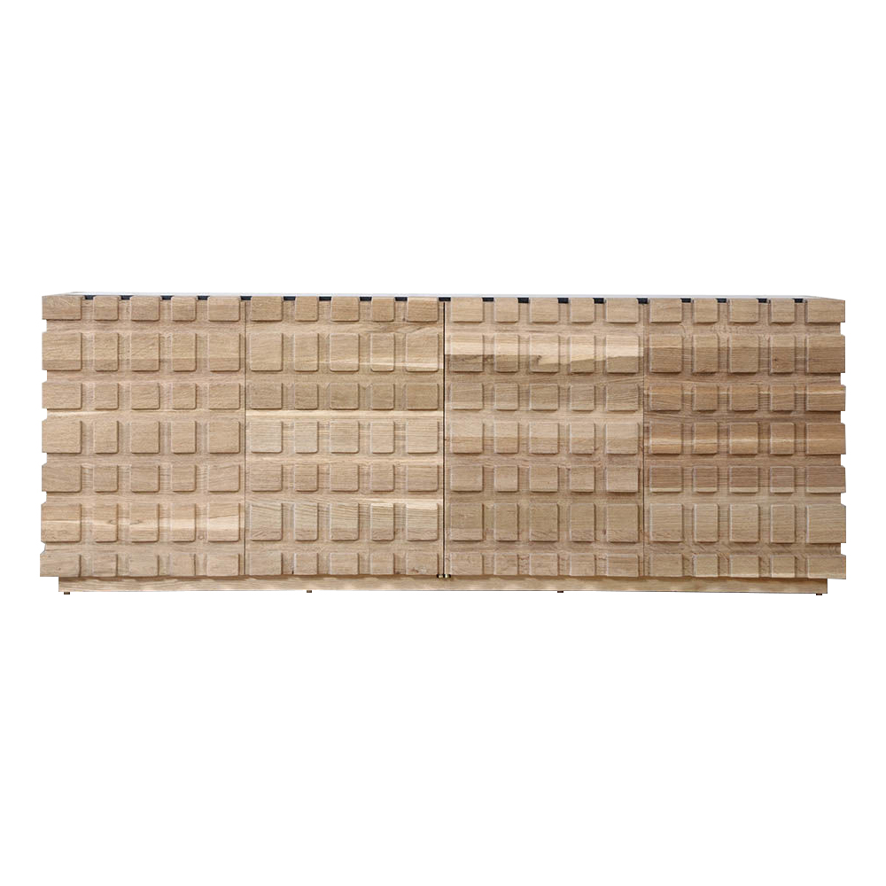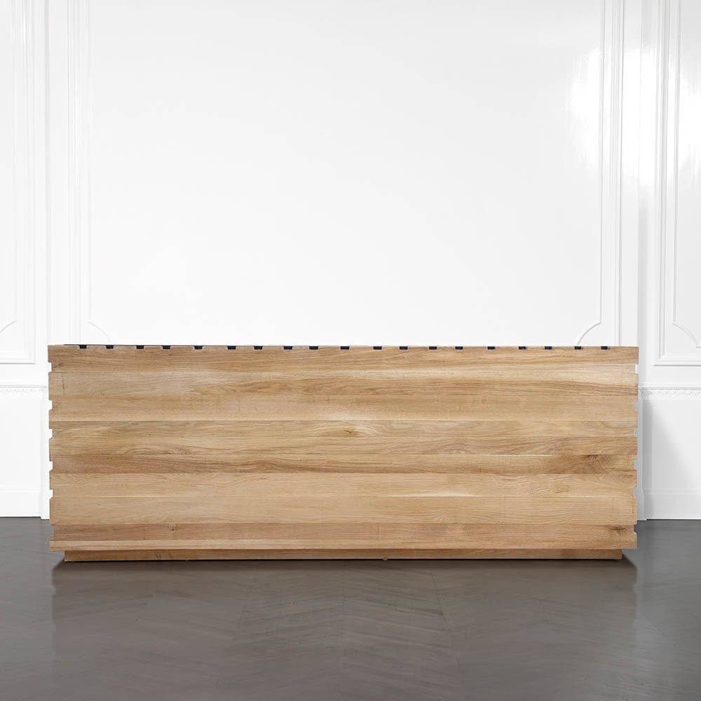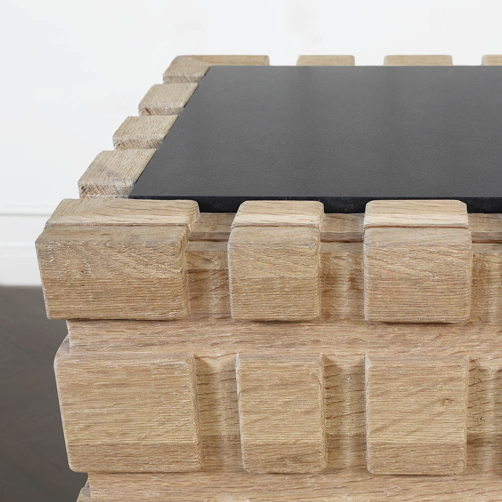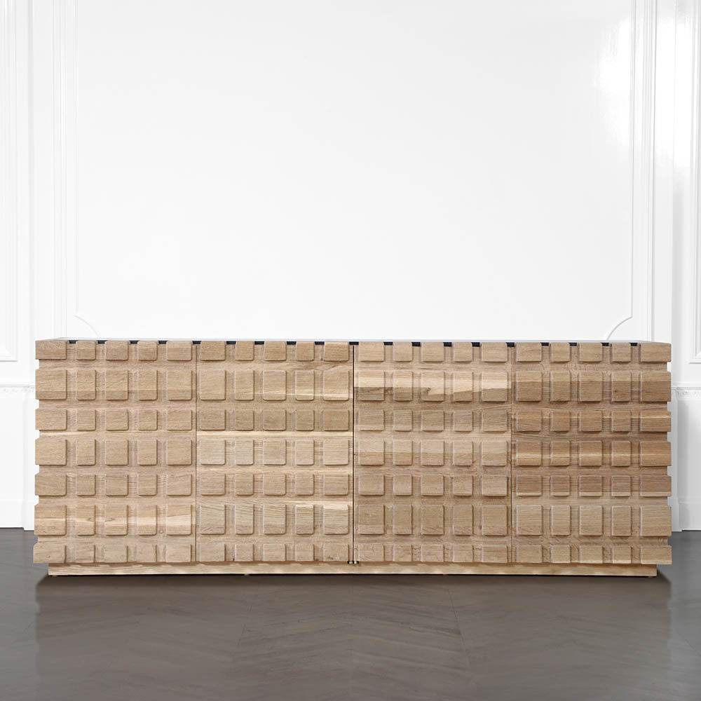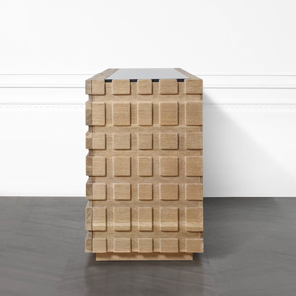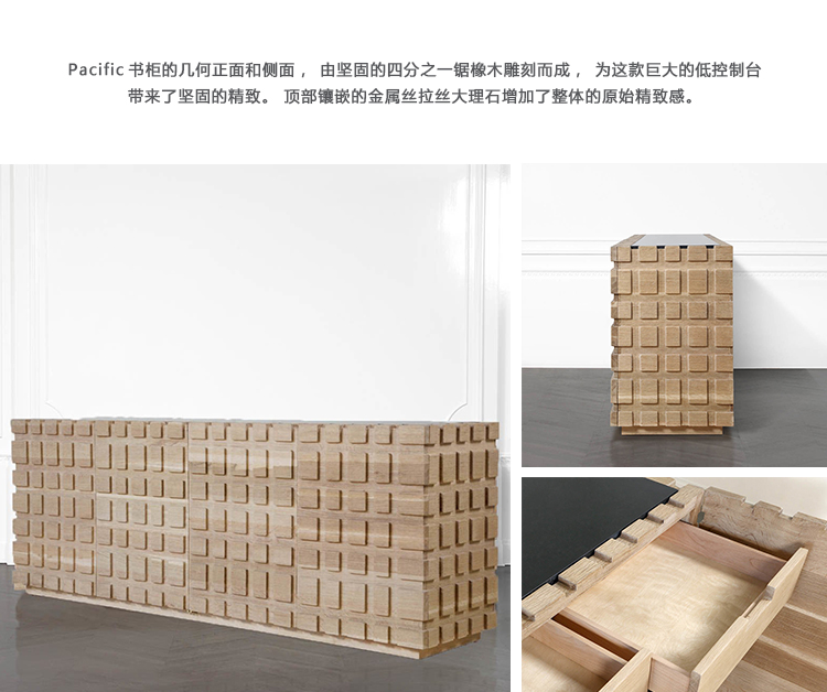 太平洋书柜的几何正面和侧面,由坚固的四分之一锯橡木雕刻而成,为这款巨大的低控制台带来了坚固的精致。 顶部镶嵌的金属丝拉丝大理石增加了整体的原始精致感。