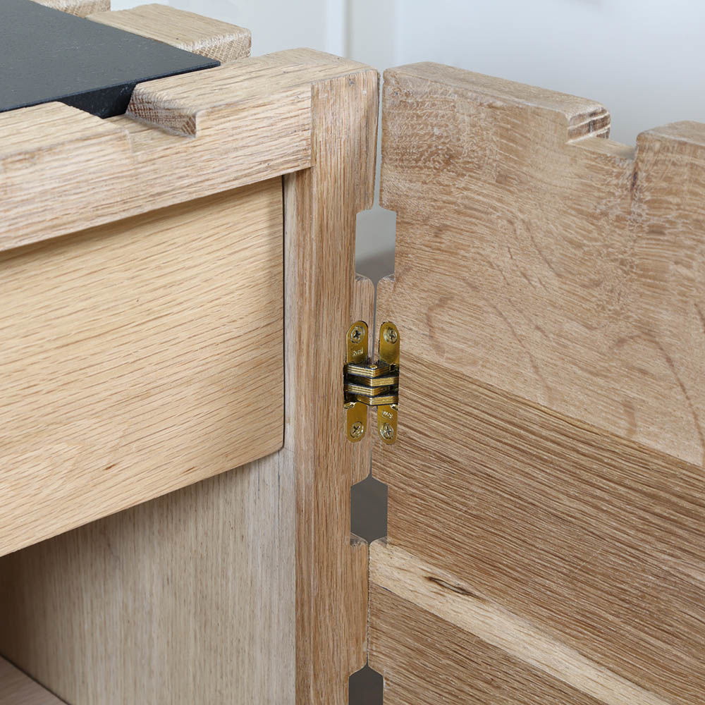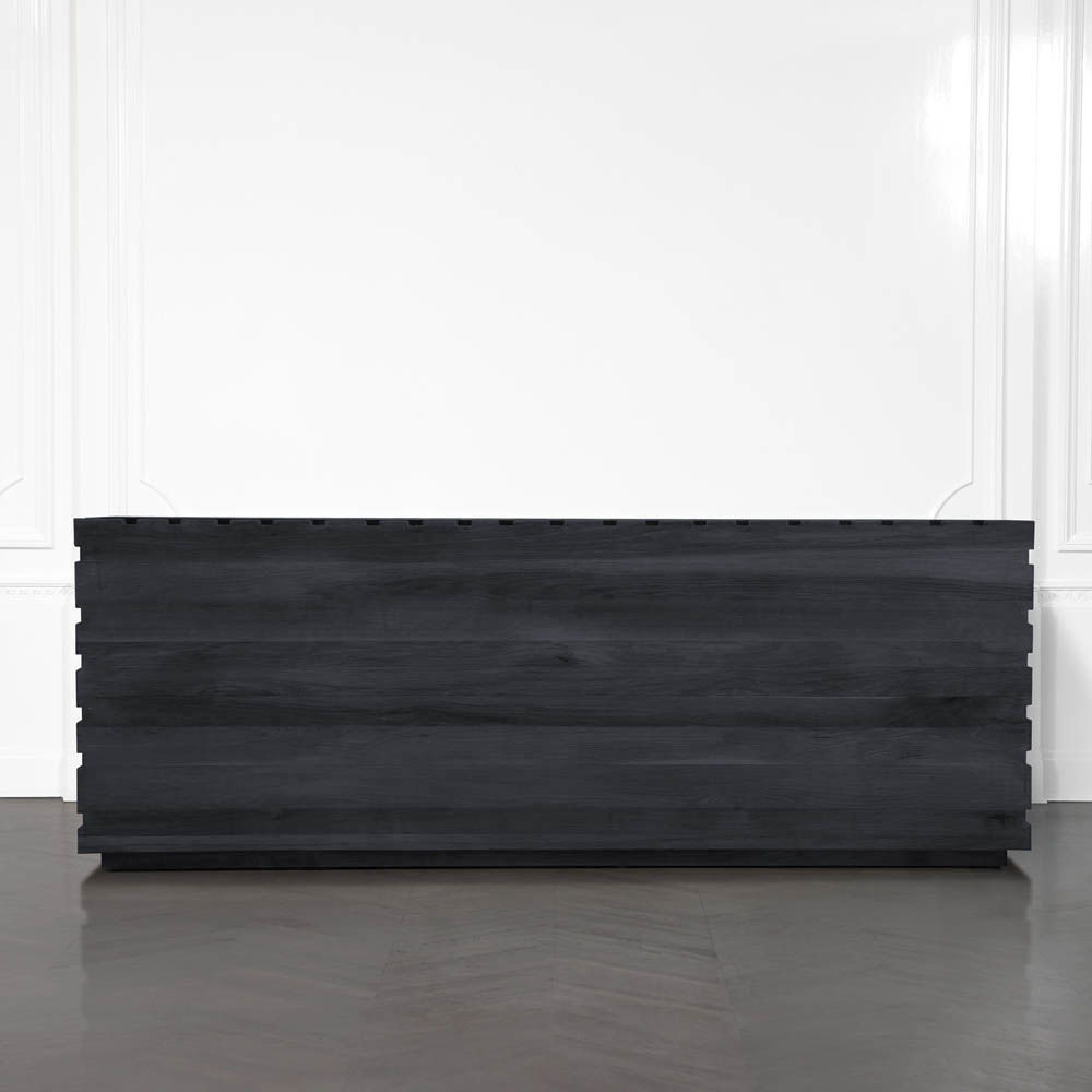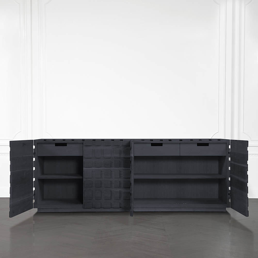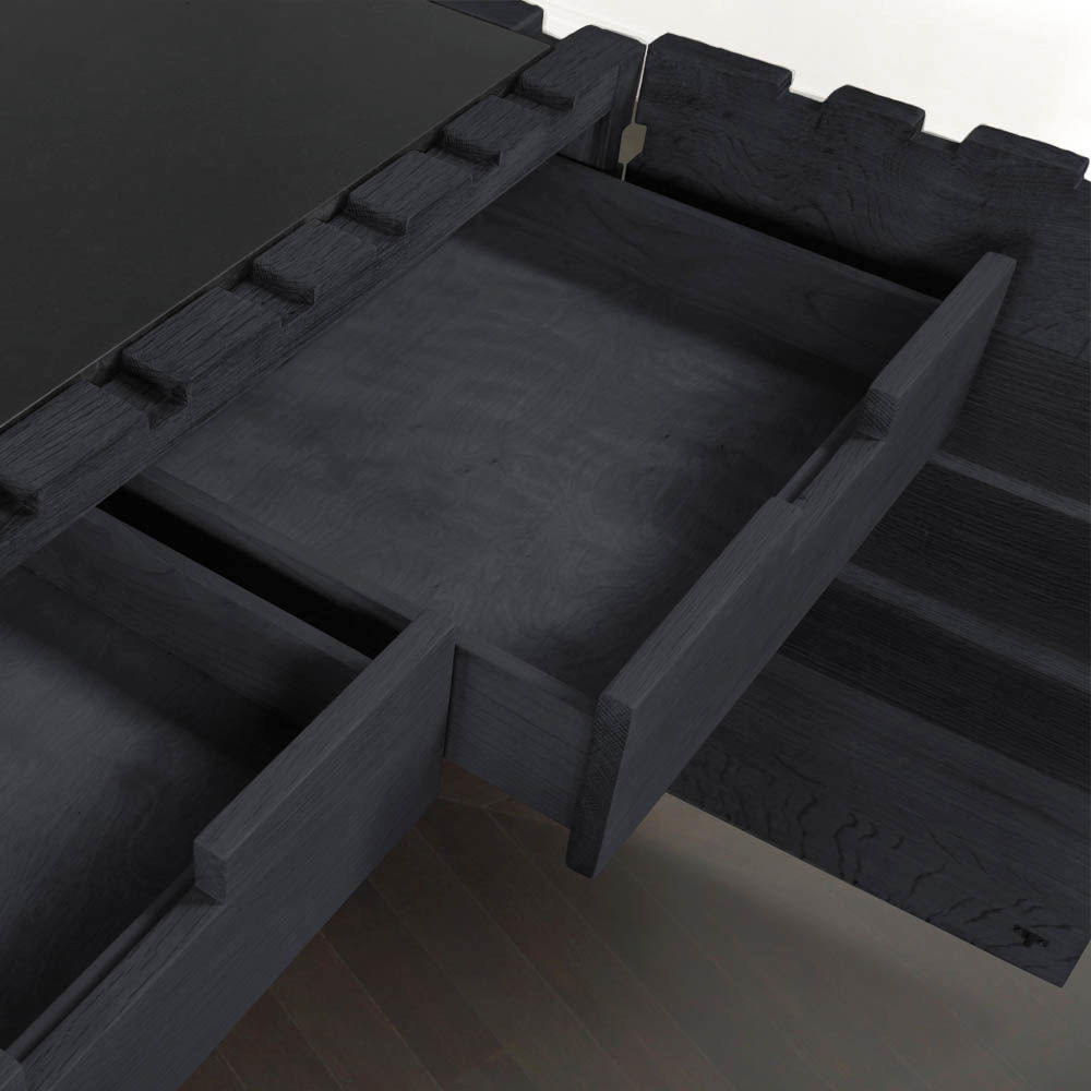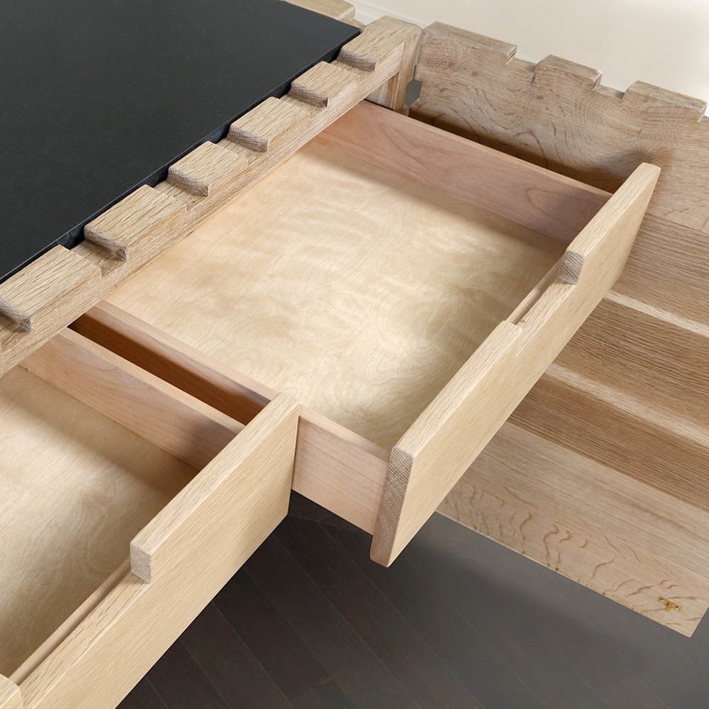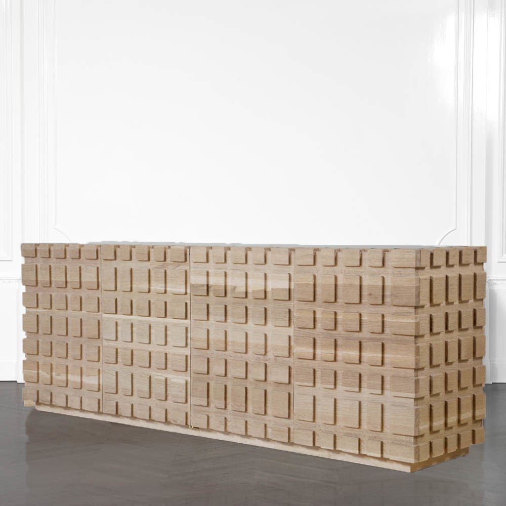 太平洋书柜的几何正面和侧面,由坚固的四分之一锯橡木雕刻而成,为这款巨大的低控制台带来了坚固的精致。 顶部镶嵌的金属丝拉丝大理石增加了整体的原始精致感。