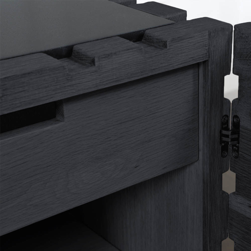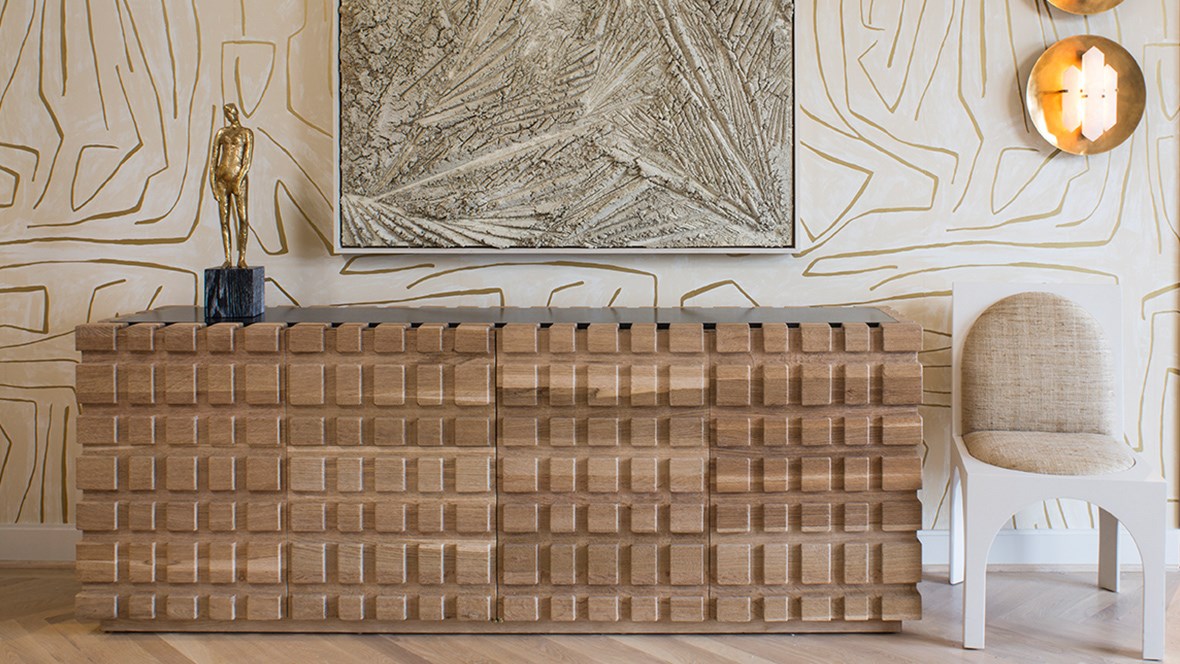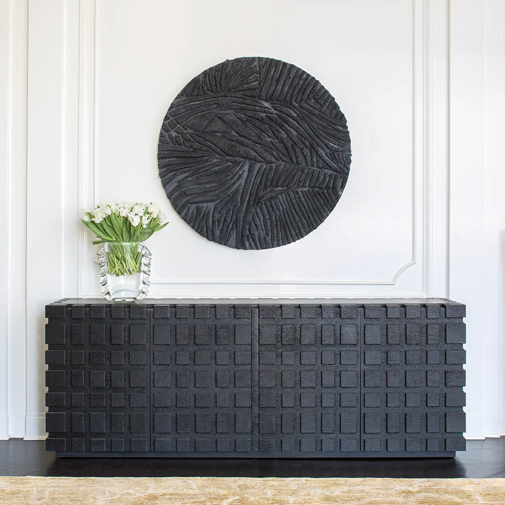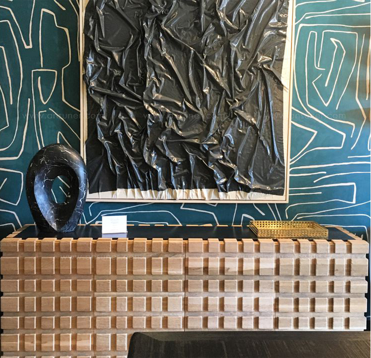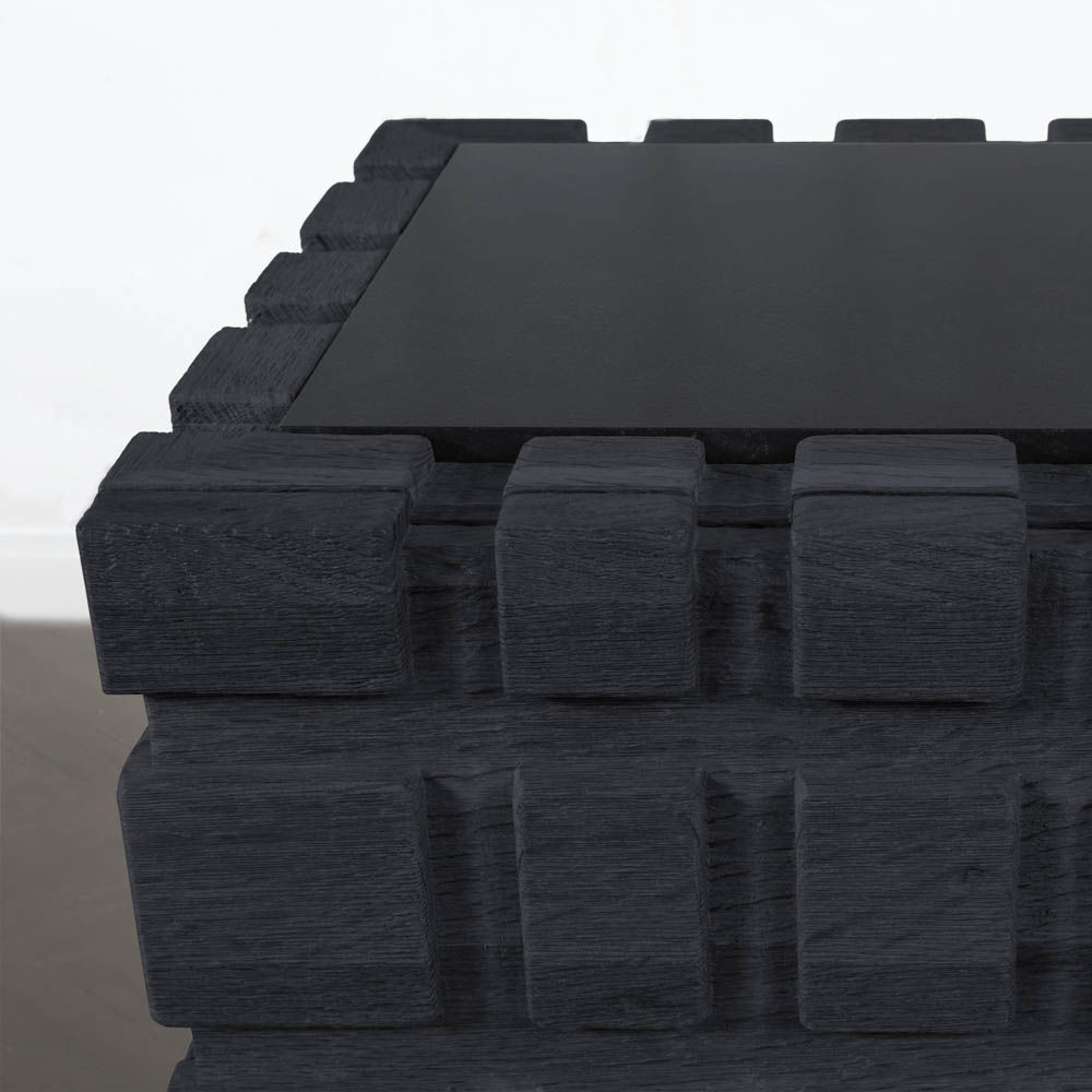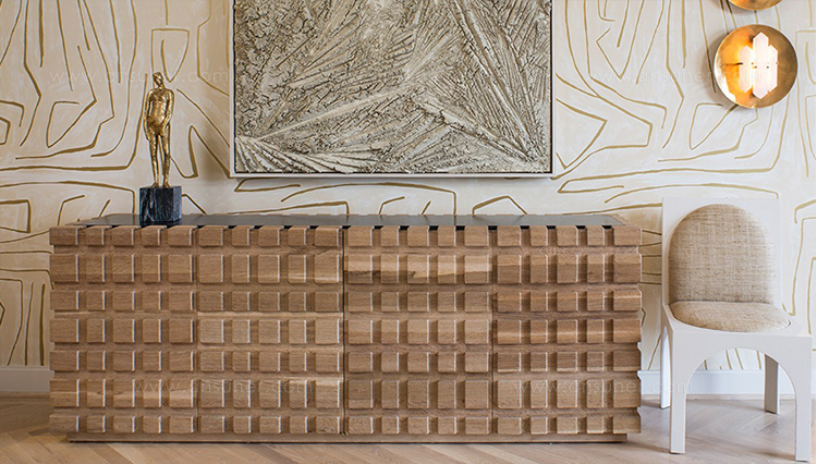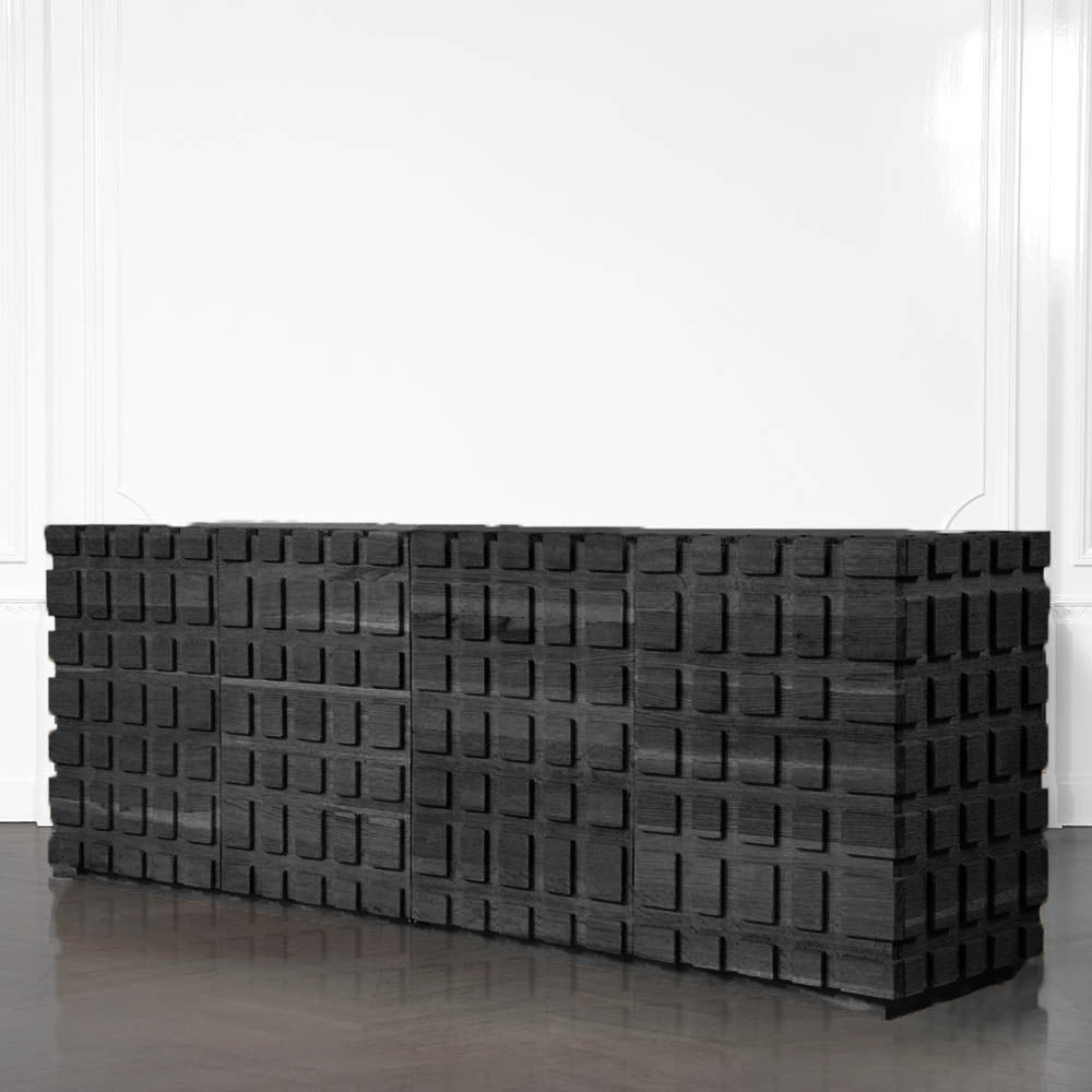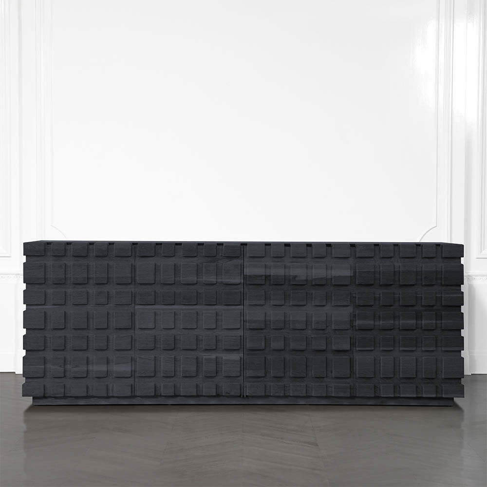 太平洋书柜的几何正面和侧面,由坚固的四分之一锯橡木雕刻而成,为这款巨大的低控制台带来了坚固的精致。 顶部镶嵌的金属丝拉丝大理石增加了整体的原始精致感。