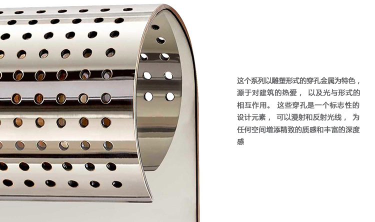 这个系列以雕塑形式的穿孔金属为特色,源于对建筑的热爱,以及光与形式的相互作用。 这些穿孔是一个标志性的设计元素,可以漫射和反射光线,为任何空间增添精致的质感和丰富的深度感。