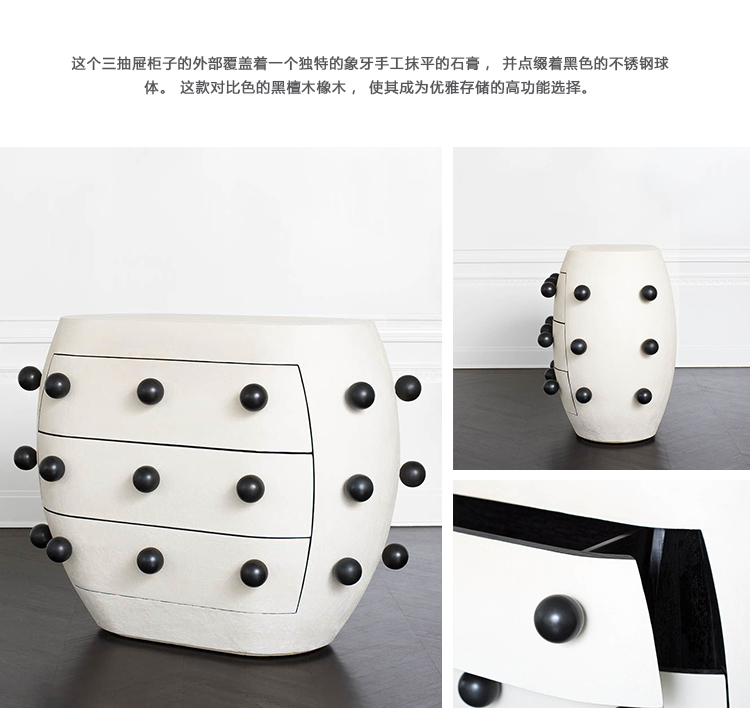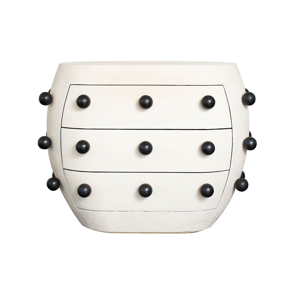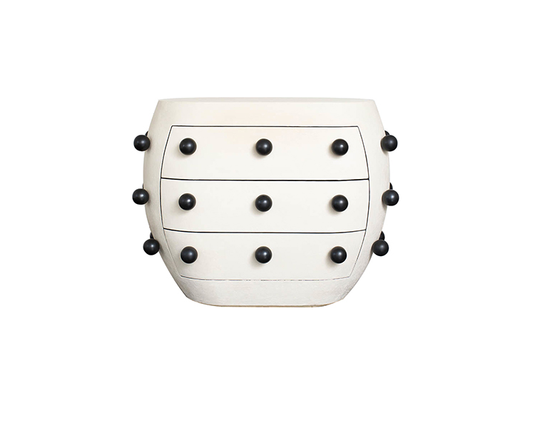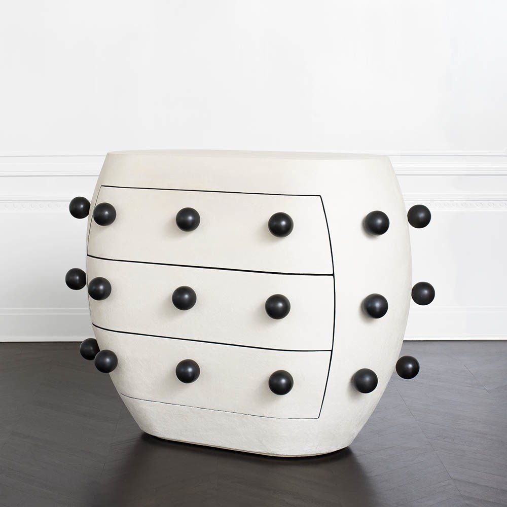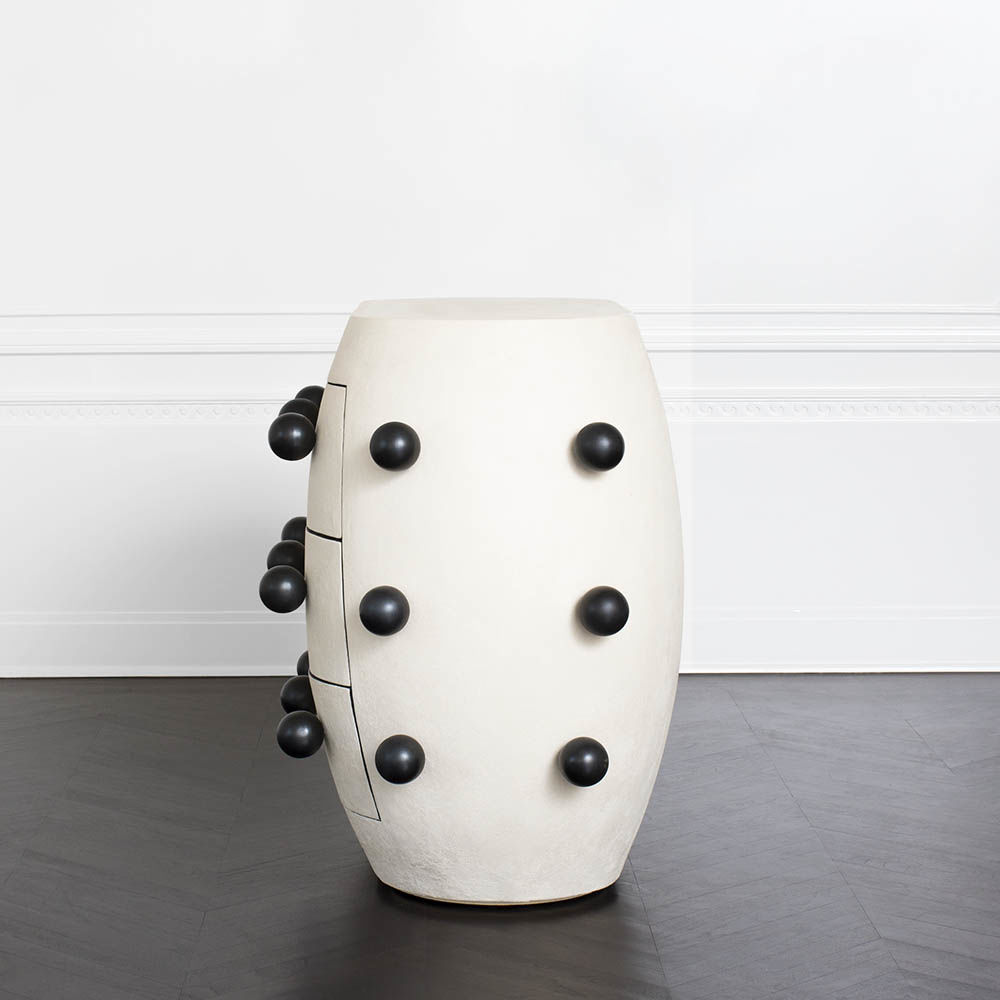 Pop柜子从凯利对对比材料的热爱中汲取灵感,并突破了形式和功能的界限。 这个三抽屉柜子的外部覆盖着一个独特的象牙手工抹平的石膏,并点缀着黑色的不锈钢球体。 这款对比色的黑檀木橡木,使其成为优雅存储的高功能选择。