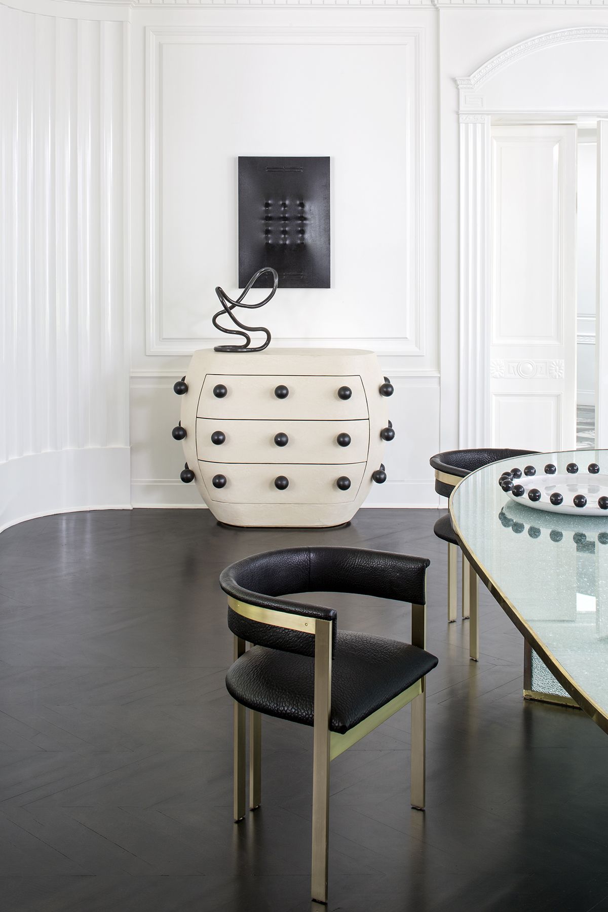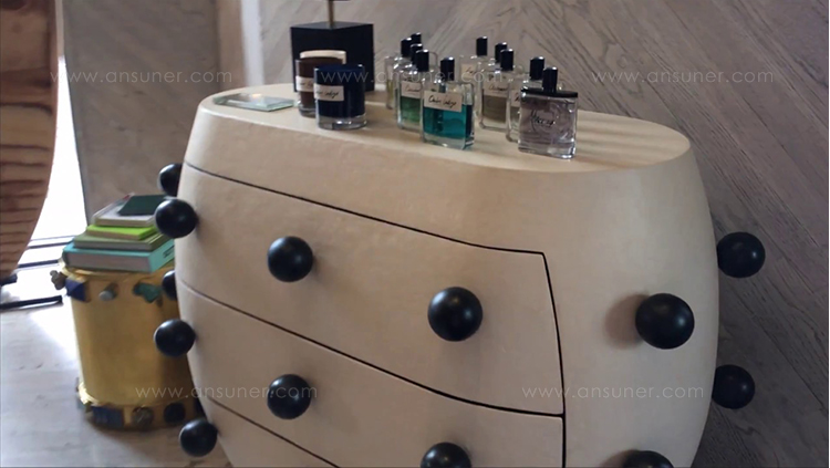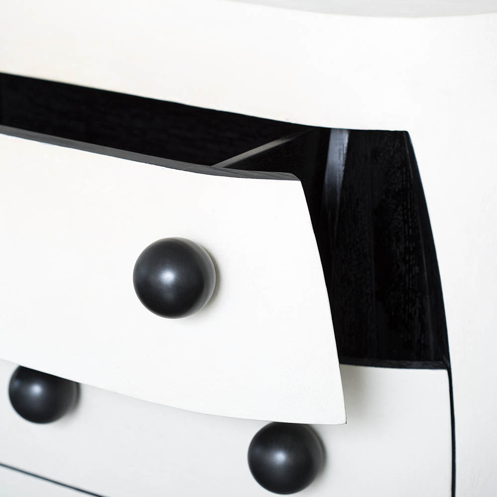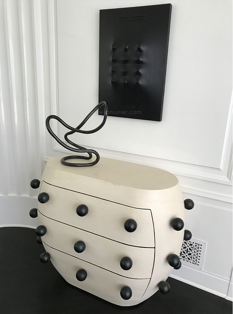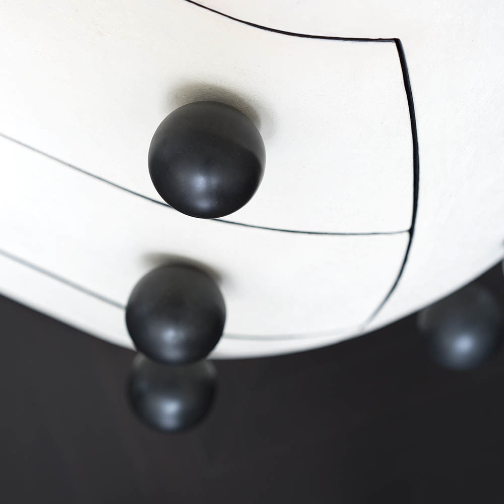 Pop柜子从凯利对对比材料的热爱中汲取灵感,并突破了形式和功能的界限。 这个三抽屉柜子的外部覆盖着一个独特的象牙手工抹平的石膏,并点缀着黑色的不锈钢球体。 这款对比色的黑檀木橡木,使其成为优雅存储的高功能选择。