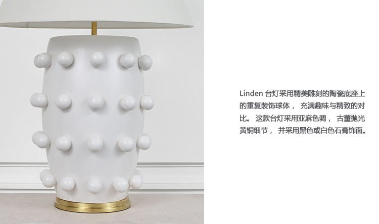 Linden台灯采用精美雕刻的陶瓷底座上的重复装饰球体,充满趣味与精致的对比。 这款台灯采用亚麻色调,古董抛光黄铜细节,并采用黑色或白色石膏饰面。