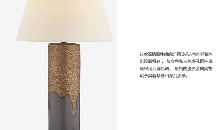 这款深情而性感的灯具以标志性的好莱坞出没而得名,其金色和白色多孔圆柱底座采用亚麻灯罩。 原始的浸渍金属风格赋予其奢华感和深沉质感。