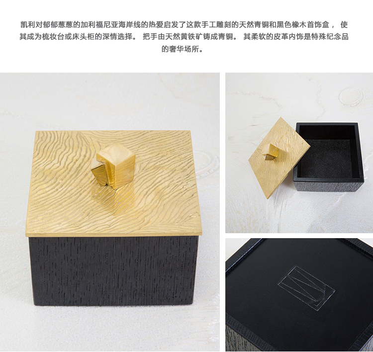凯利对郁郁葱葱的加利福尼亚海岸线的热爱启发了这款手工雕刻的天然青铜和黑色橡木首饰盒,使其成为梳妆台或床头柜的深情选择。 把手由天然黄铁矿铸成青铜。 其柔软的皮革内饰是特殊纪念品的奢华场所。