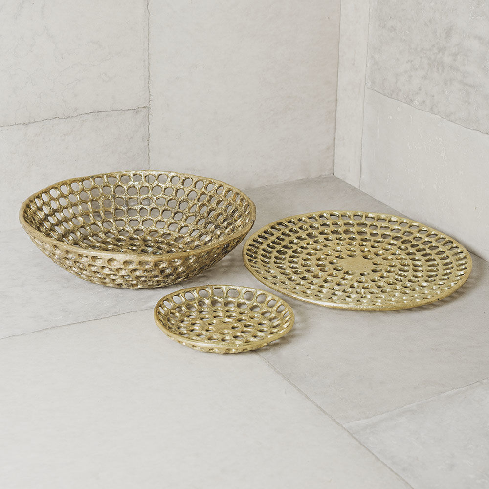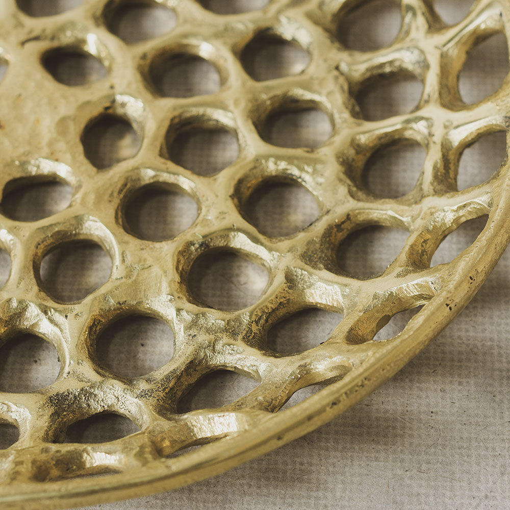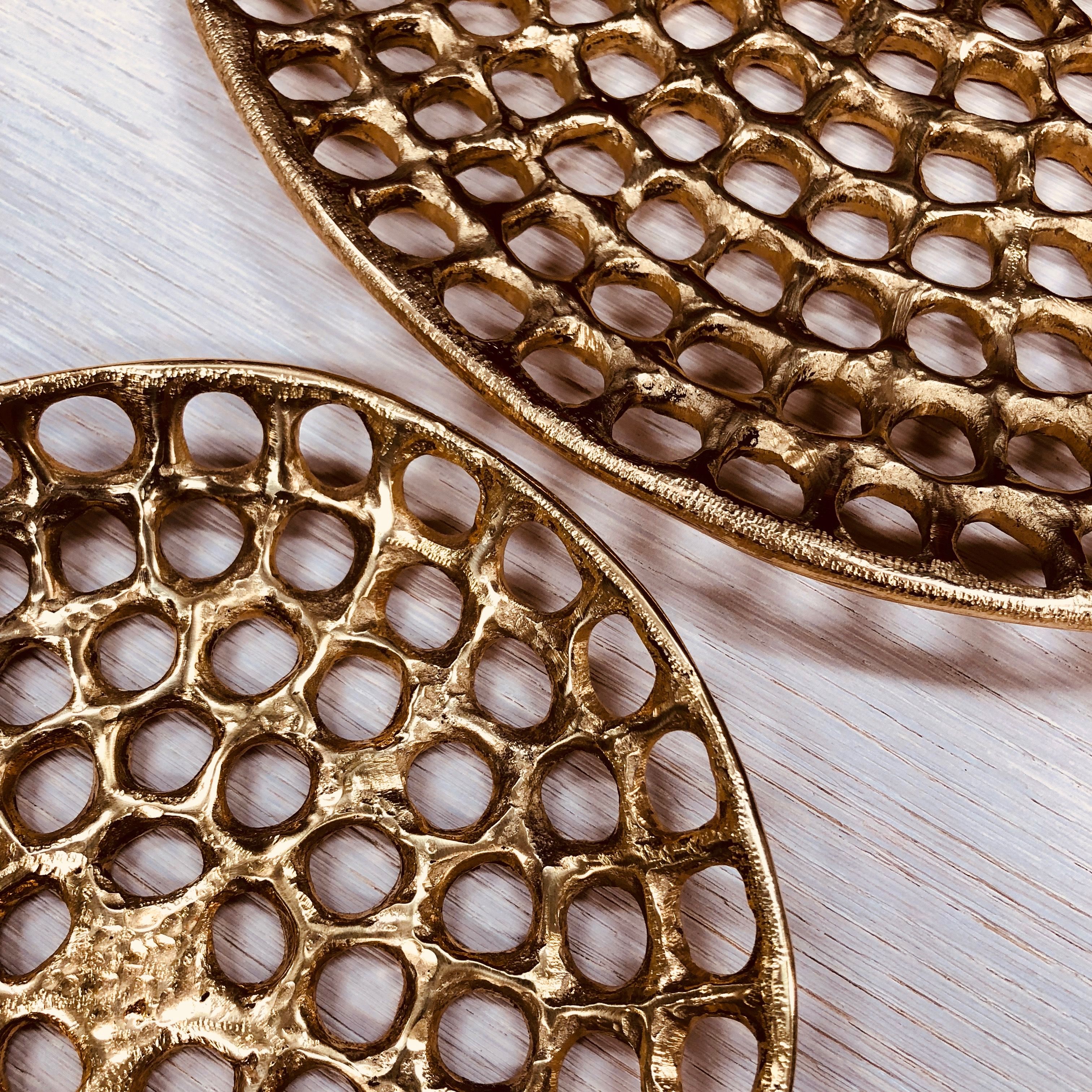 Verso盘子具有明显的有机和雕塑感,采用手工缝制的纹理和动态切割穿孔图案。 这些装饰拼盘是由实心铸造黄铜手工制作的工作室,具有天然的光洁度,随着时间的推移会变成铜绿。