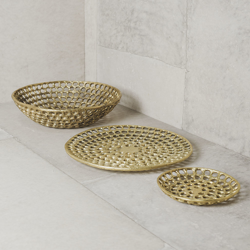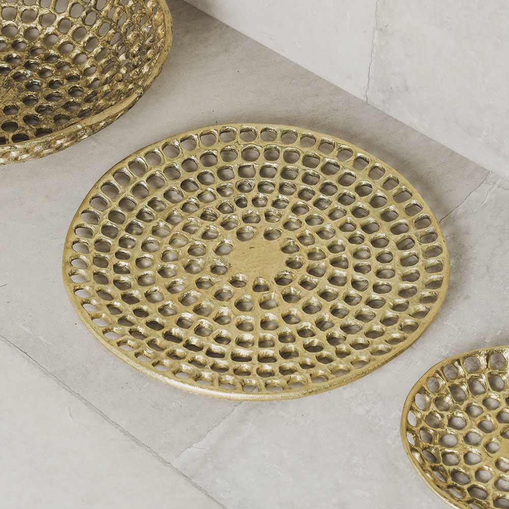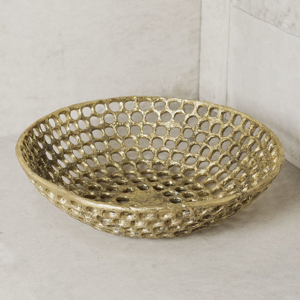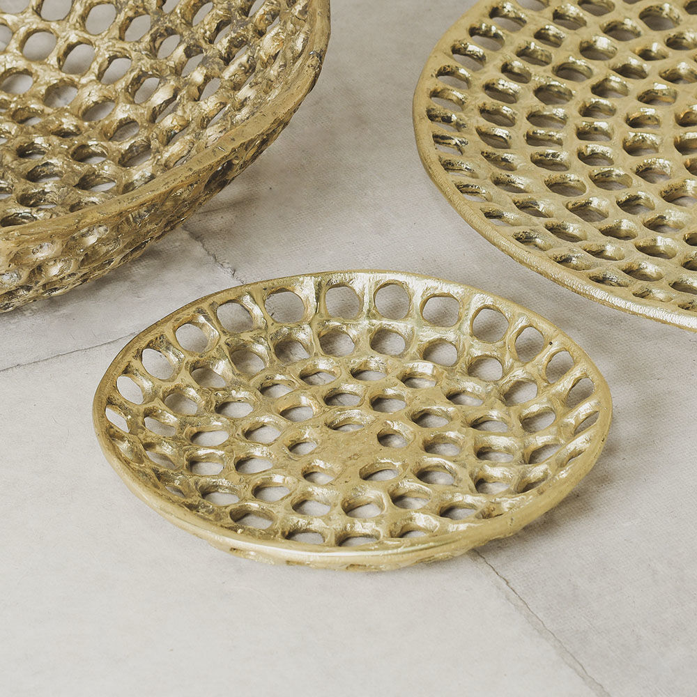 Verso盘子具有明显的有机和雕塑感,采用手工缝制的纹理和动态切割穿孔图案。 这些装饰拼盘是由实心铸造黄铜手工制作的工作室,具有天然的光洁度,随着时间的推移会变成铜绿。