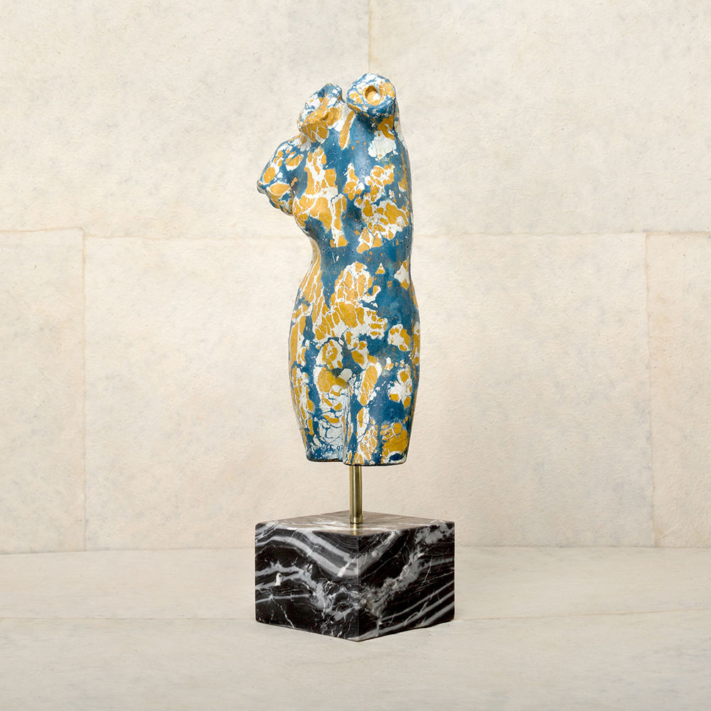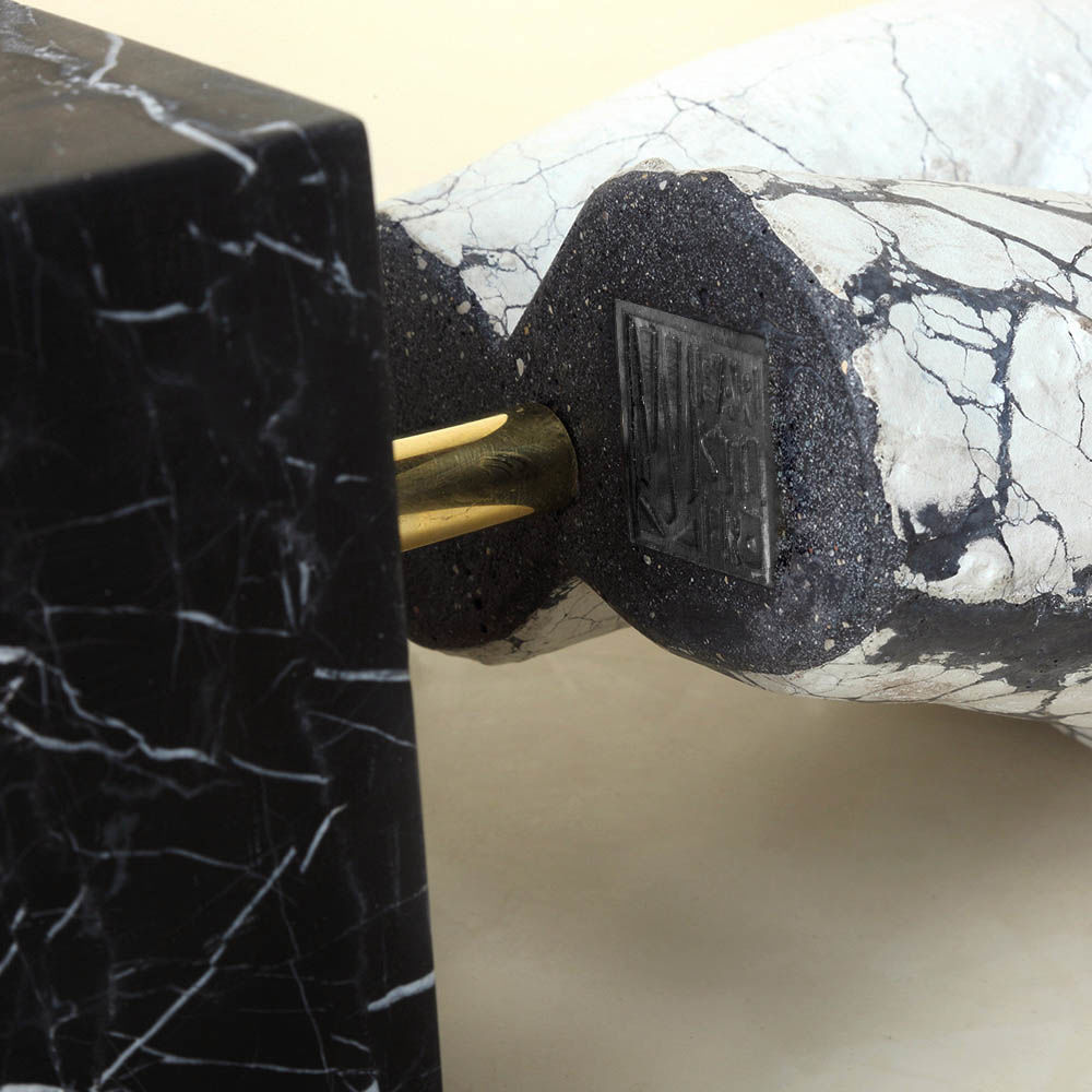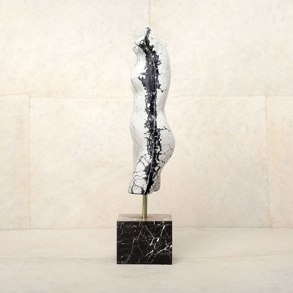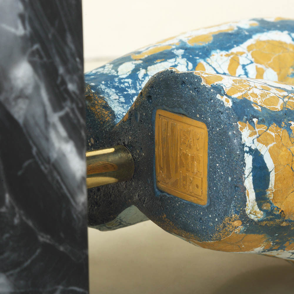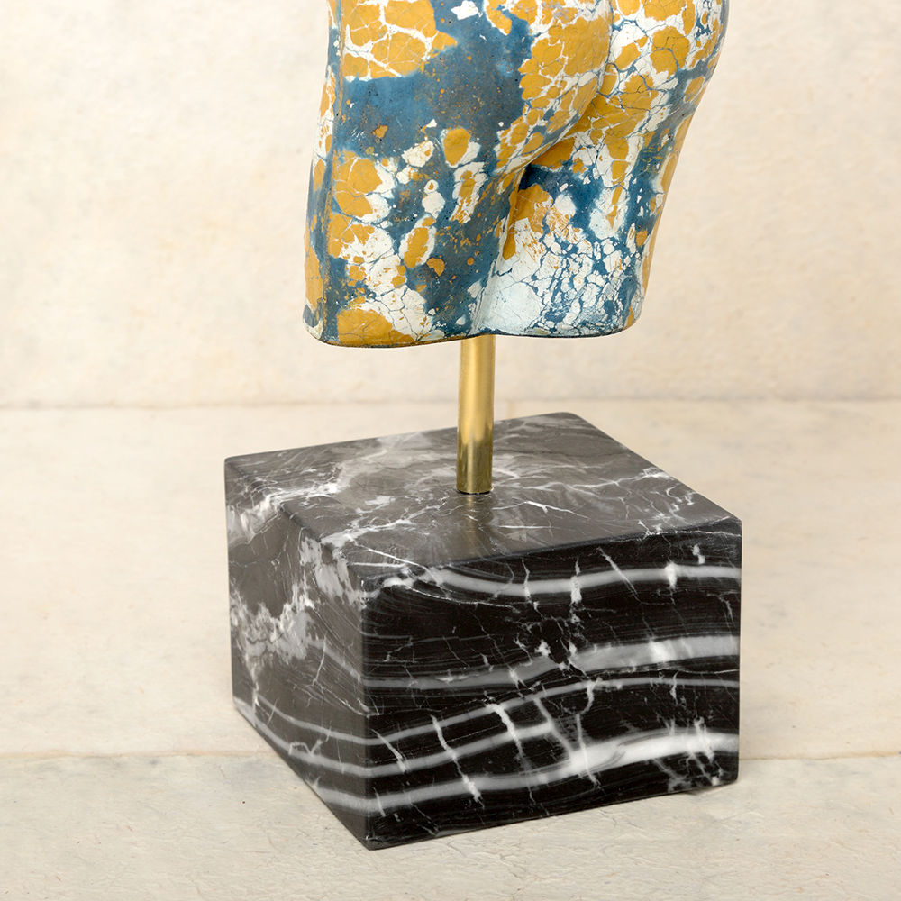 这款桌面雕塑描绘了一款经典的女性躯干,采用手工浇筑的混凝土。 混凝土中充满了颜料,使每种形状都具有完全独特的色偏。 每个雕塑都坐落在坚固的黑色Marquina大理石底座上,并与坚固的抛光青铜杆相连。