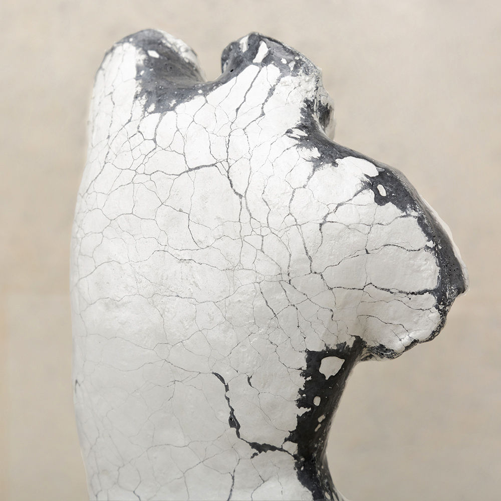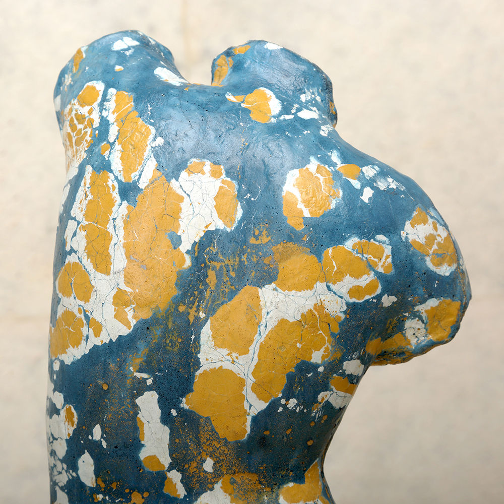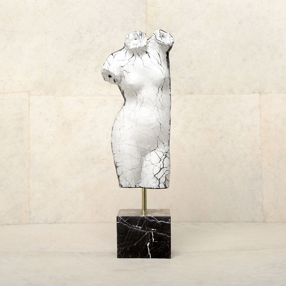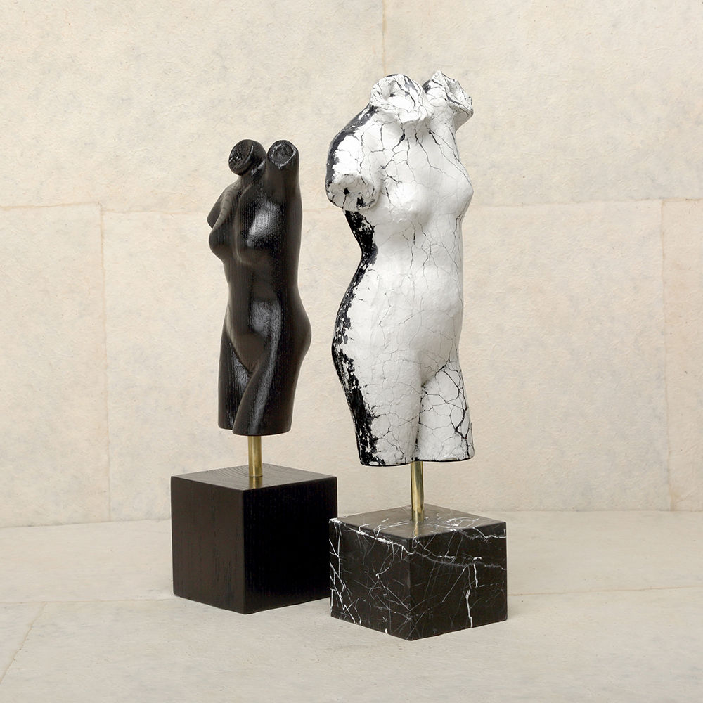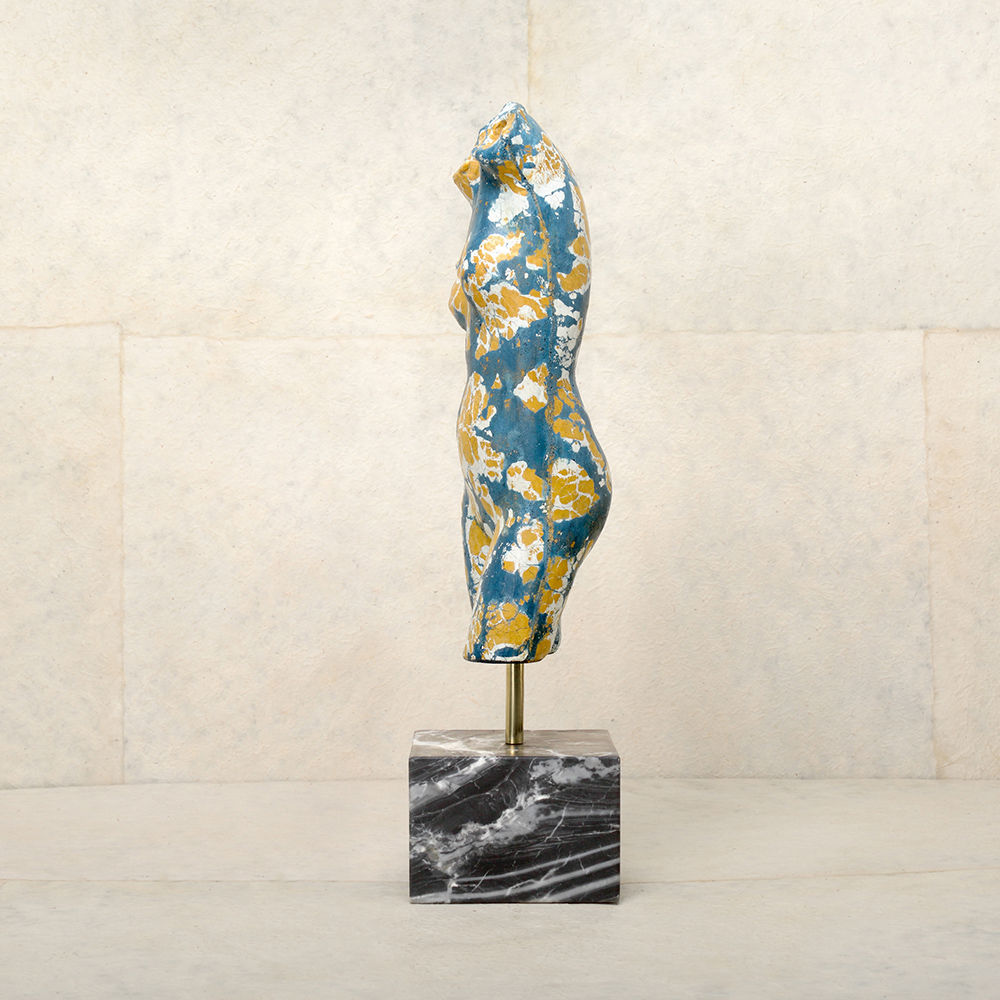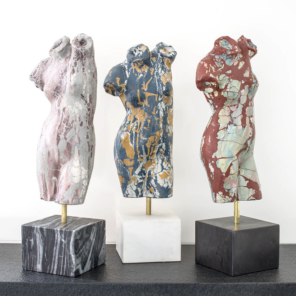 这款桌面雕塑描绘了一款经典的女性躯干,采用手工浇筑的混凝土。 混凝土中充满了颜料,使每种形状都具有完全独特的色偏。 每个雕塑都坐落在坚固的黑色Marquina大理石底座上,并与坚固的抛光青铜杆相连。
