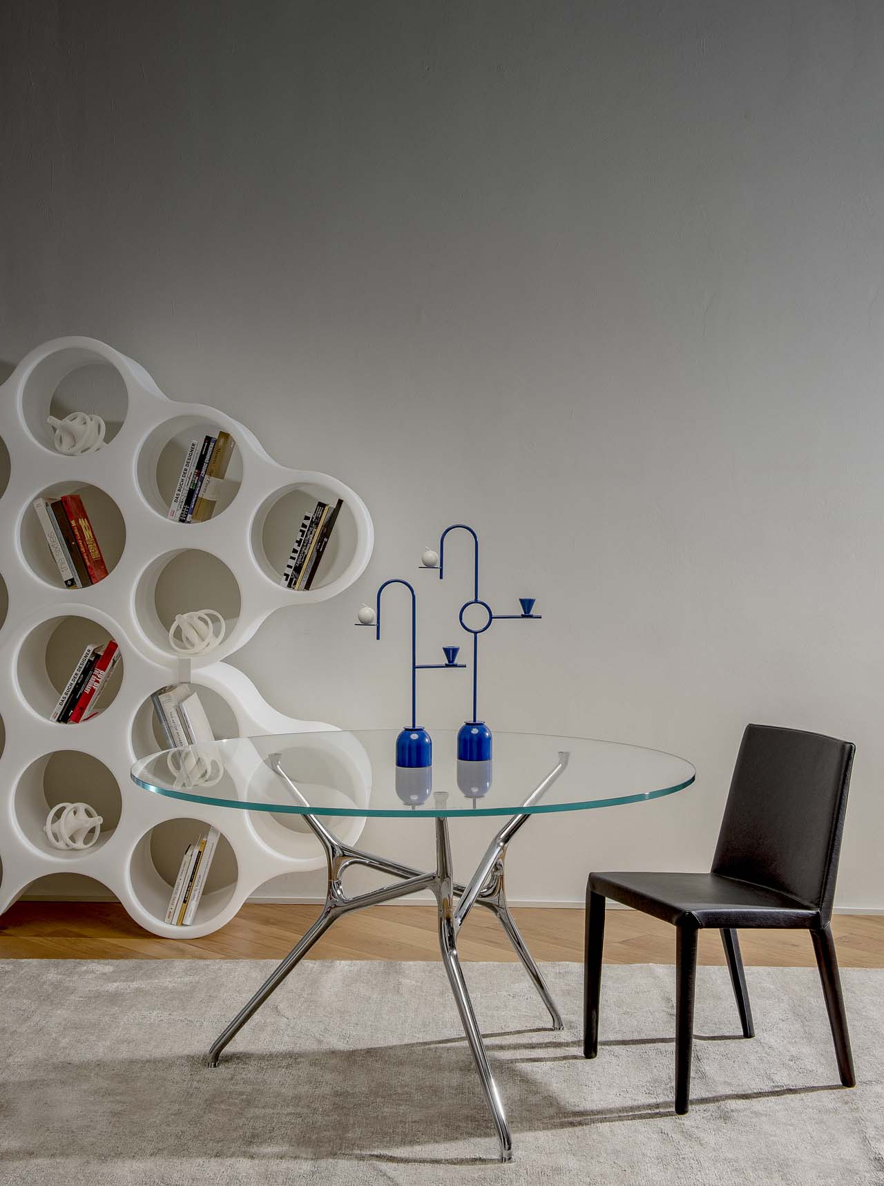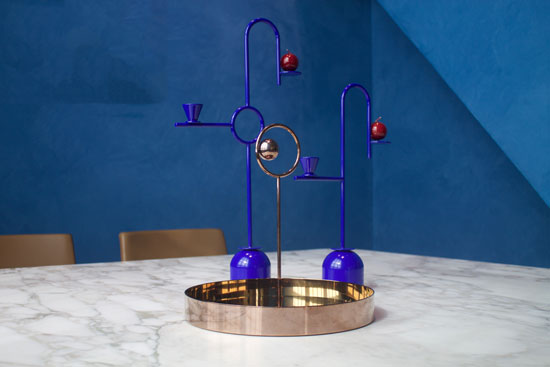 这对蓝色烛台优雅的几何形象是设计师Thomas Dariel设计的。 对于这个产品,他用细长的弯曲茎杆定义了空间,用靛蓝色照亮。蓝色烛台由弧形层压金属制成,带有金属底座。