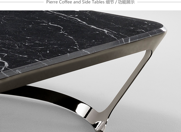 皮埃尔咖啡和侧桌的特点是整体的顶部和框架在减少的厚度。它们有一个外部金属“皮肤”,有大的开放表面和深灰色的表面。这种轻盈,加上稳定性,在表面上很明显,似乎漂浮着,有复杂的地面细节,都是缎质玻璃和珍贵的大理石。