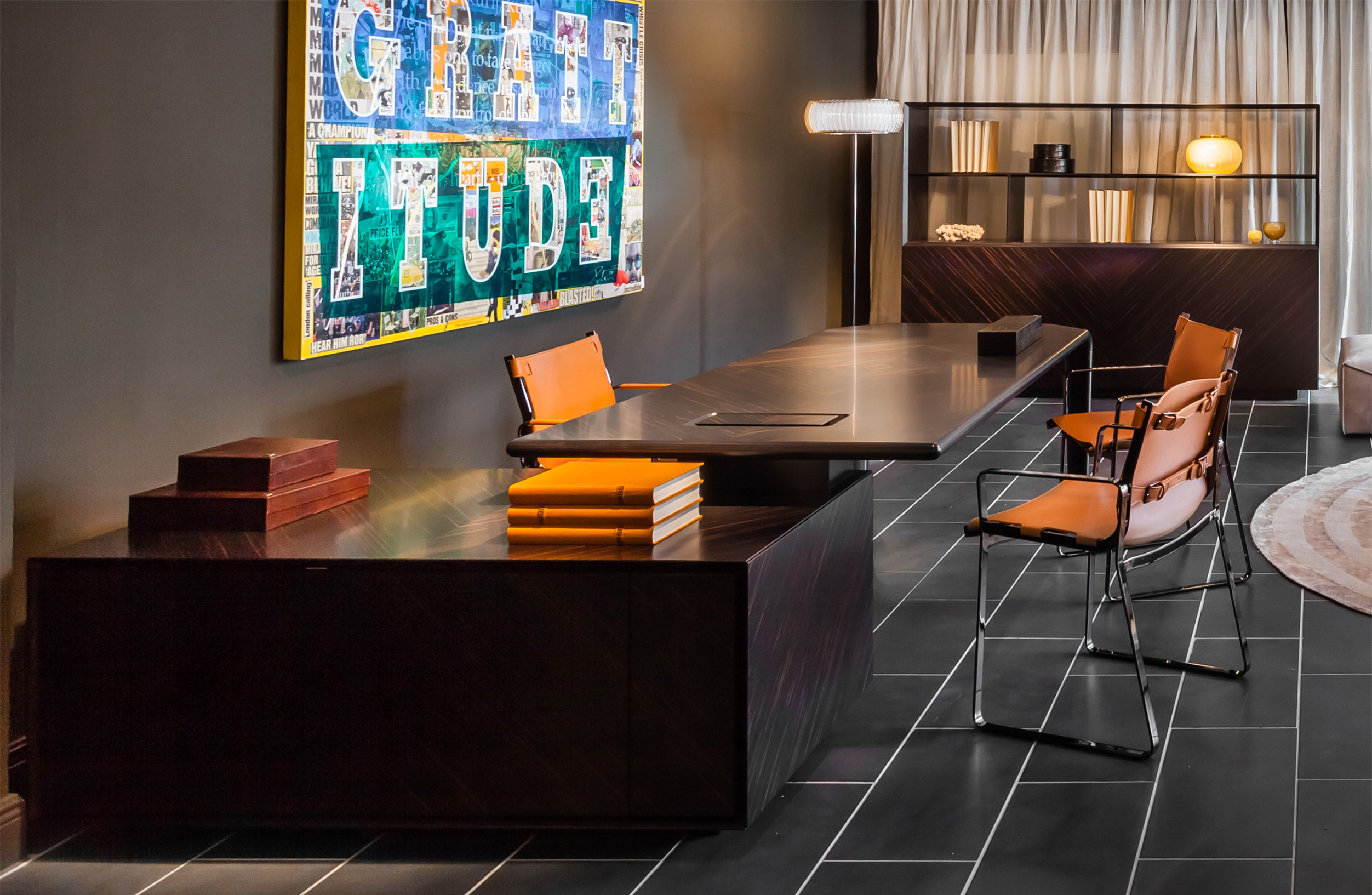 Ebony Macassar with diamond drawing matt finishing. Spacer-joint undertop in glossy brushed wood coordinated with the leather top, matt or polished