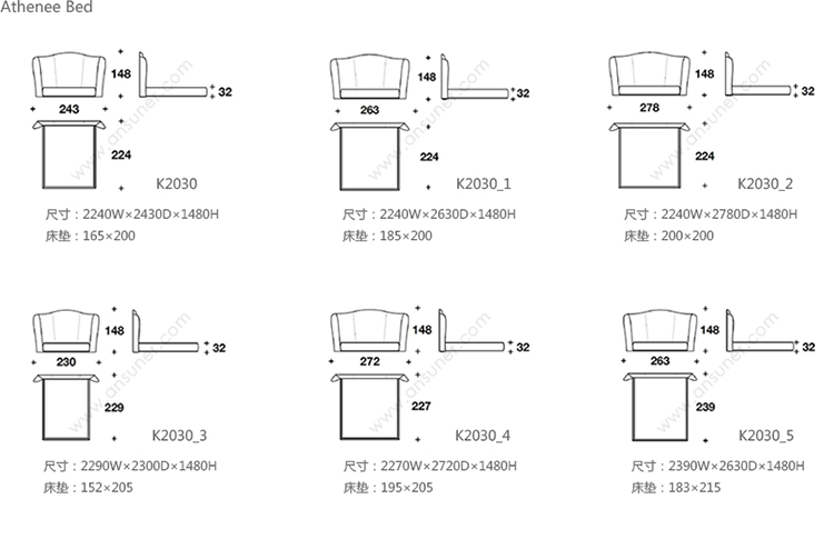 Athenee Bed 系列尺寸/示意图