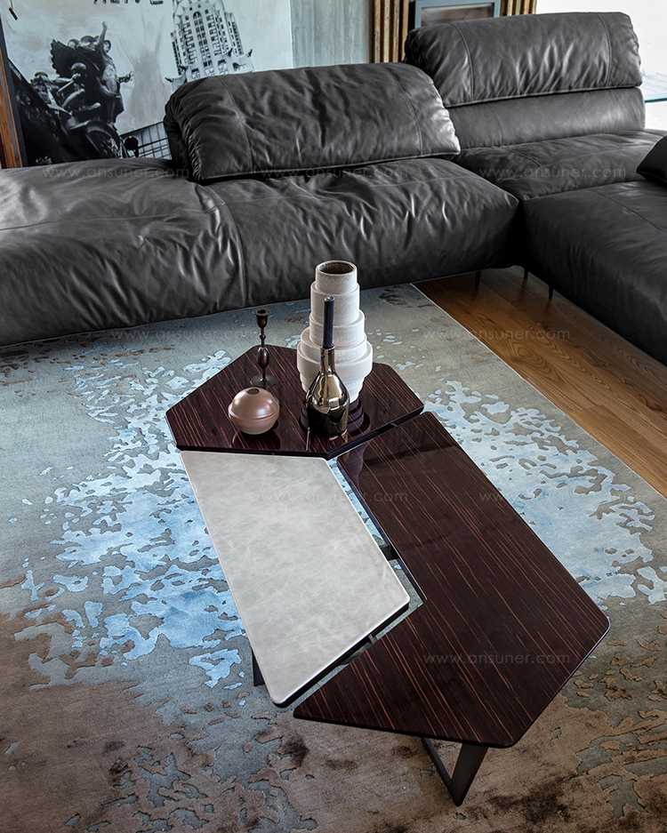 纳尔逊咖啡桌的主要特点是它的桌面。桌面被一个很深的缝隙分开但它们是由结构组成的。将木头和皮革等温暖的材料结合在一起组合成了不规则的几何形状的桌面。托斯卡纳传统的蔬菜鞣革是一种以多种颜色、独特香气和小瑕疵为特点的天然产物。