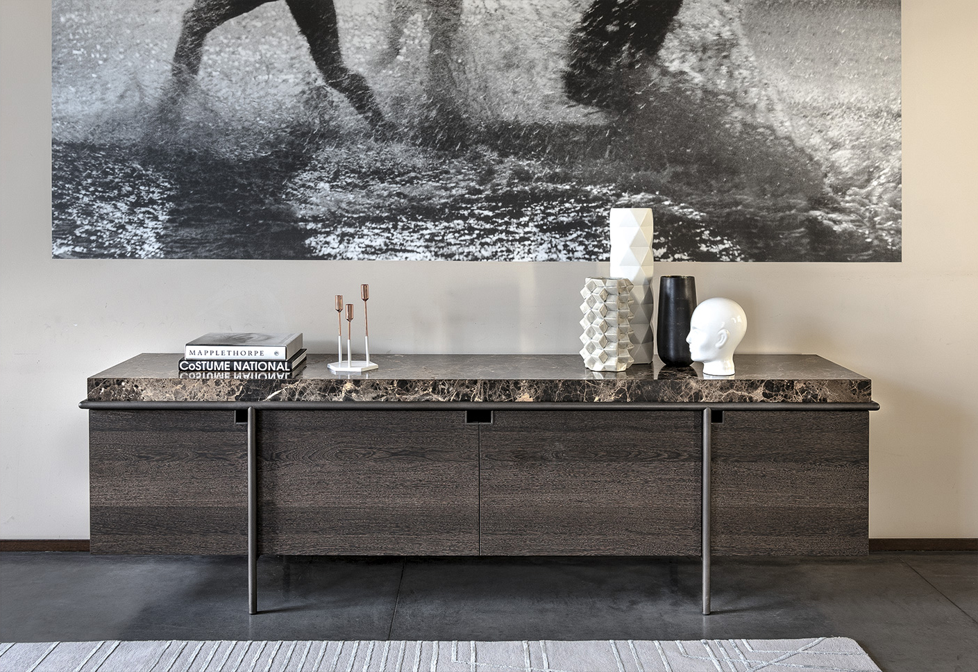 干净而严谨的外形特征是Aura餐具柜的特征。纯粹与几何灵感之间的相互作用是为了创造出一种具有独创性和优雅风格的设计作品。它的顶部是由大理石或蚀刻玻璃制成的,实木柜身漆成灰色或者棕色,由云母棕色、黄铜、钛或氧化灰色的金属管包裹。视觉效果是一个有着丰富而坚定的个性的形象。