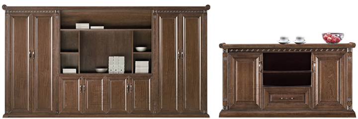 ※ 以上图片是班台局部展示图,班台以实木雕花和桌面旋转侧边的特点,台面可配置三插电源孔、网络接口、耳机音频接口、话筒接口、VGA接口,也可根据客户实际需要选择和定做,展现了整洁,整齐的办公环境。 可选择实木颜色,满足更多理想需求。