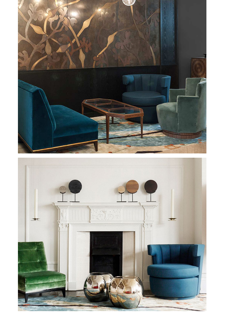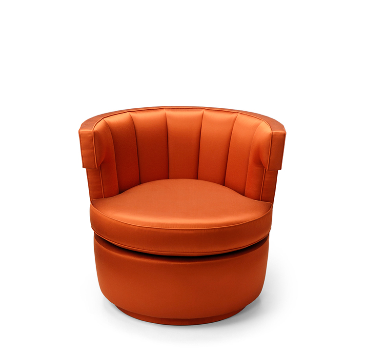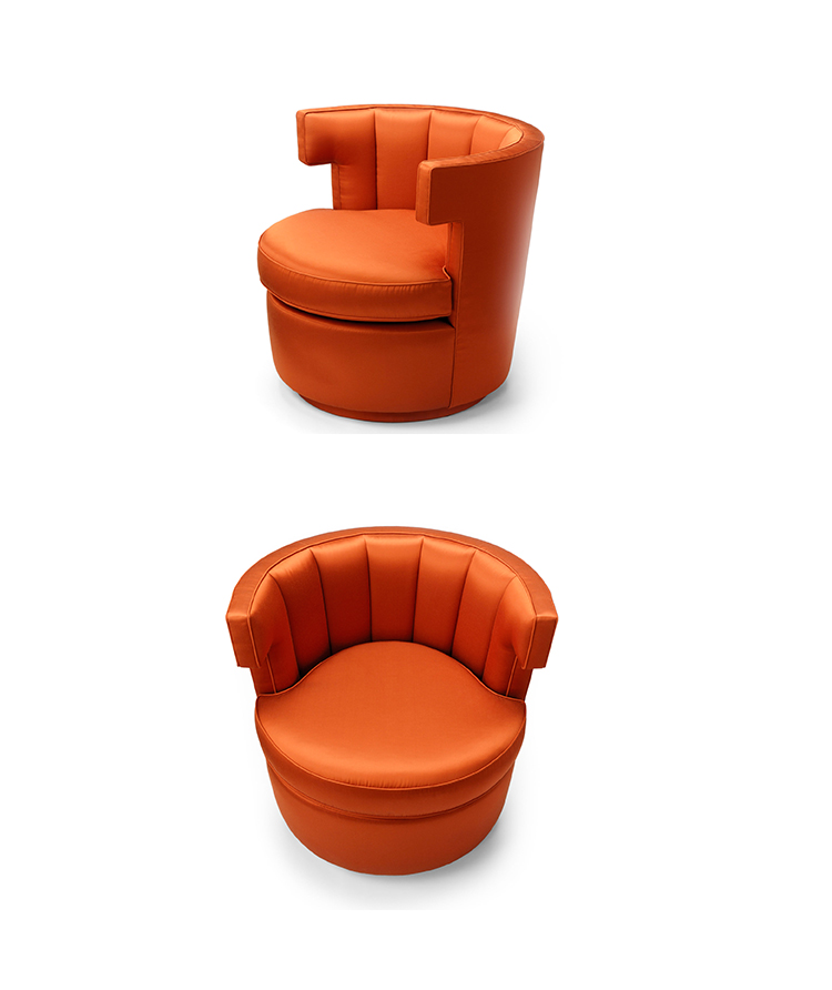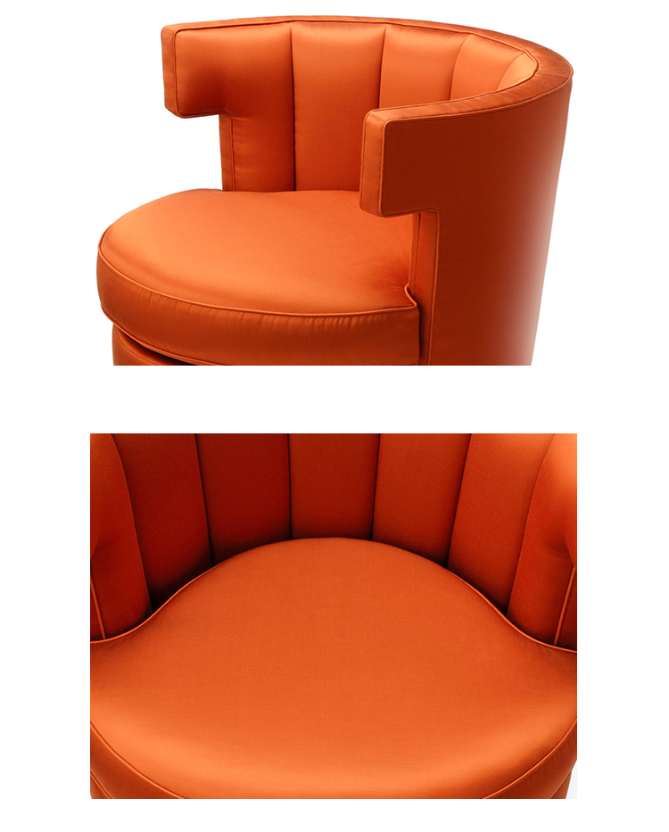 Sazerac 沙发椅简便又放心,在酒吧、休息室或卧室里都很舒适。这里展示的是软垫缎纹织物。椅子底座可用金属或织物覆盖