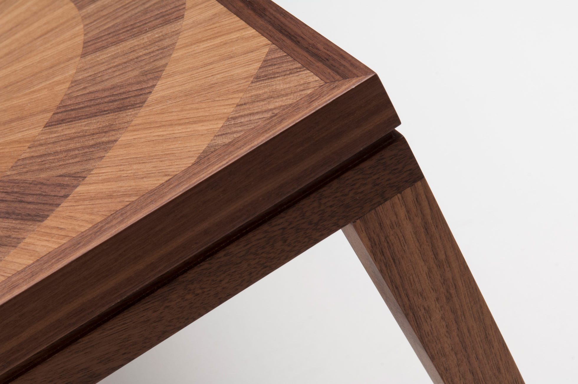 手工铺设的径向同心圆形对比色调和美国梧桐切割在坚实的抛光青铜腿上,这款特别版的Catalyst咖啡桌远远望去,而坐在附近则是错综复杂的美丽。